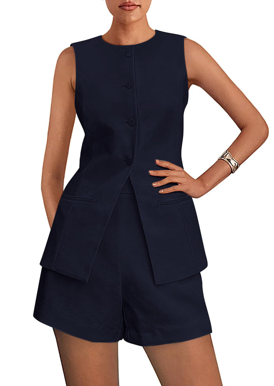 PRETTYGARDEN Women's 2 Piece Sets 2025 Summer Trendy Button Down Suit Vest Tops High Waisted Shorts Business Casual Outfits