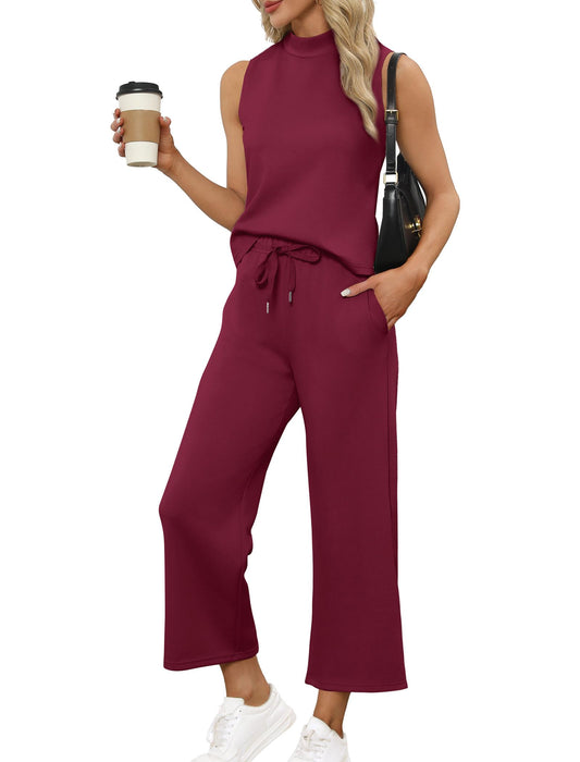 SAMPEEL Two Piece Sets for Women Summer Outfits Lounge Sets Mock Neck Tops Wide Leg Crop Pants Vacation Travel Outfits