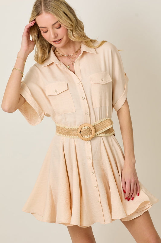 SHORT SLEEVE BUTTON DOWN BELTED FLARE DRESS