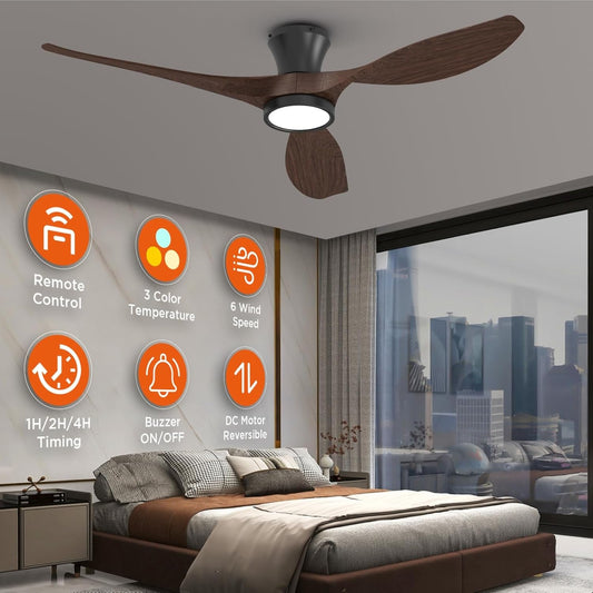 52 Inch Ceiling Fan with Lights, Low Profile Flush Mount Mordern Wood