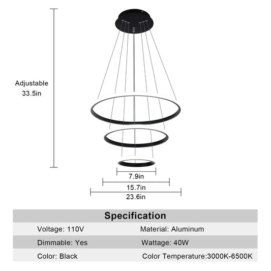 Dimmable Modern LED Chandelier,3 Rings Black Pendant Light with Remote,3000K-6500K Adjustable,40W Ceiling Light for Bedroom