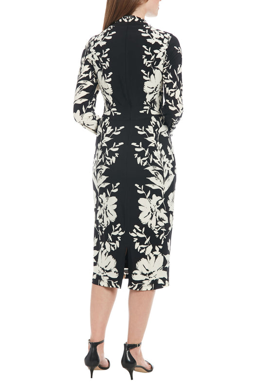 London Times Floral High Mock Crossover Neckline Long Elasticated Cuffs Sleeves Zipper Closure Sheer Overlay Flounce Hemline Fit Sheath Midi Dress