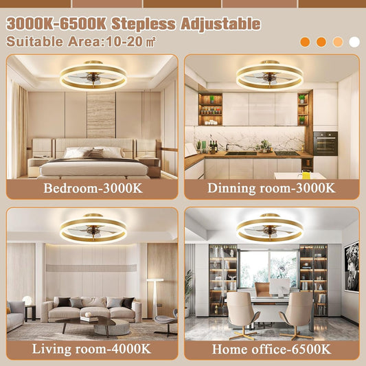 LEDIARY Caged Ceiling Fans with Lights, White Flush Mount Ceiling Fan with Remote, Small Low Profile Bladeless Ceiling Fan Light Fixture for Bedroom, Kitchen, Dining Room-White Gold Color