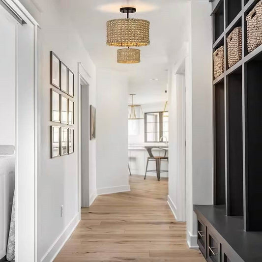 Bohemian 13.6-inch Round Rattan Drum 2-Light Ceiling Light - Semi-Flush Mount