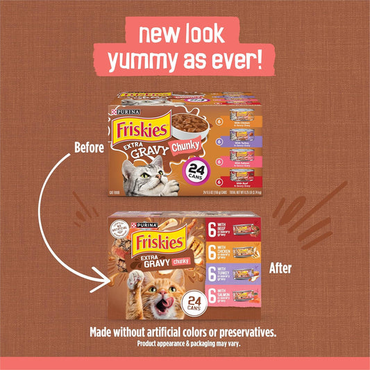 Purina Friskies Extra Gravy Wet Cat Food Chunky 24ct Variety Pack (With Chicken, Turkey, Salmon, Beef) - (Pack of 24) 5.5 oz. Cans