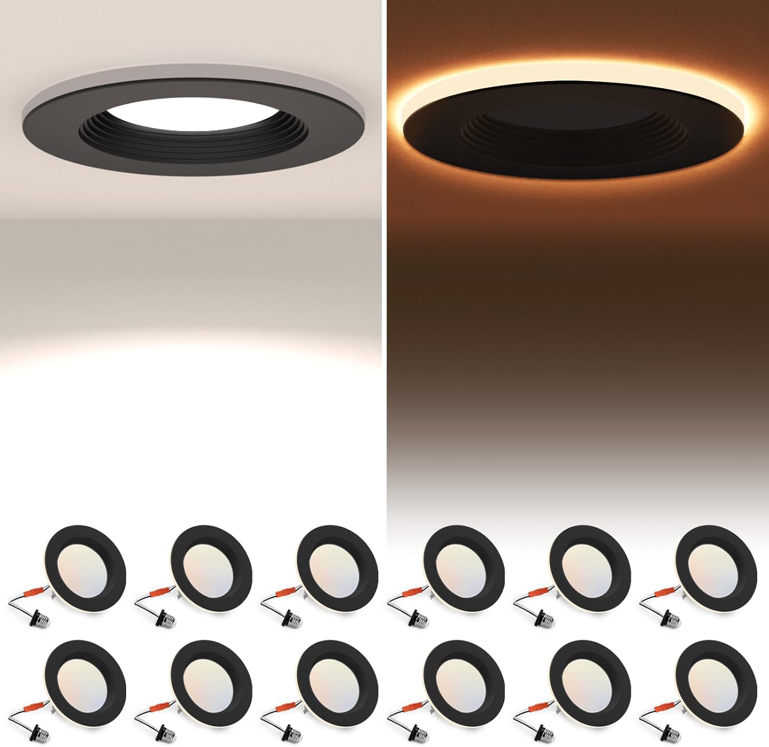 12 Pack 4 Inch Black LED Can Lights with Night Light, 5CCT Retrofit Recessed Lighting Selectable 2700K-6000K Dimmable, 9W=55W, 630LM Downlight with Metal Smooth Trim - ETL and Energy Star