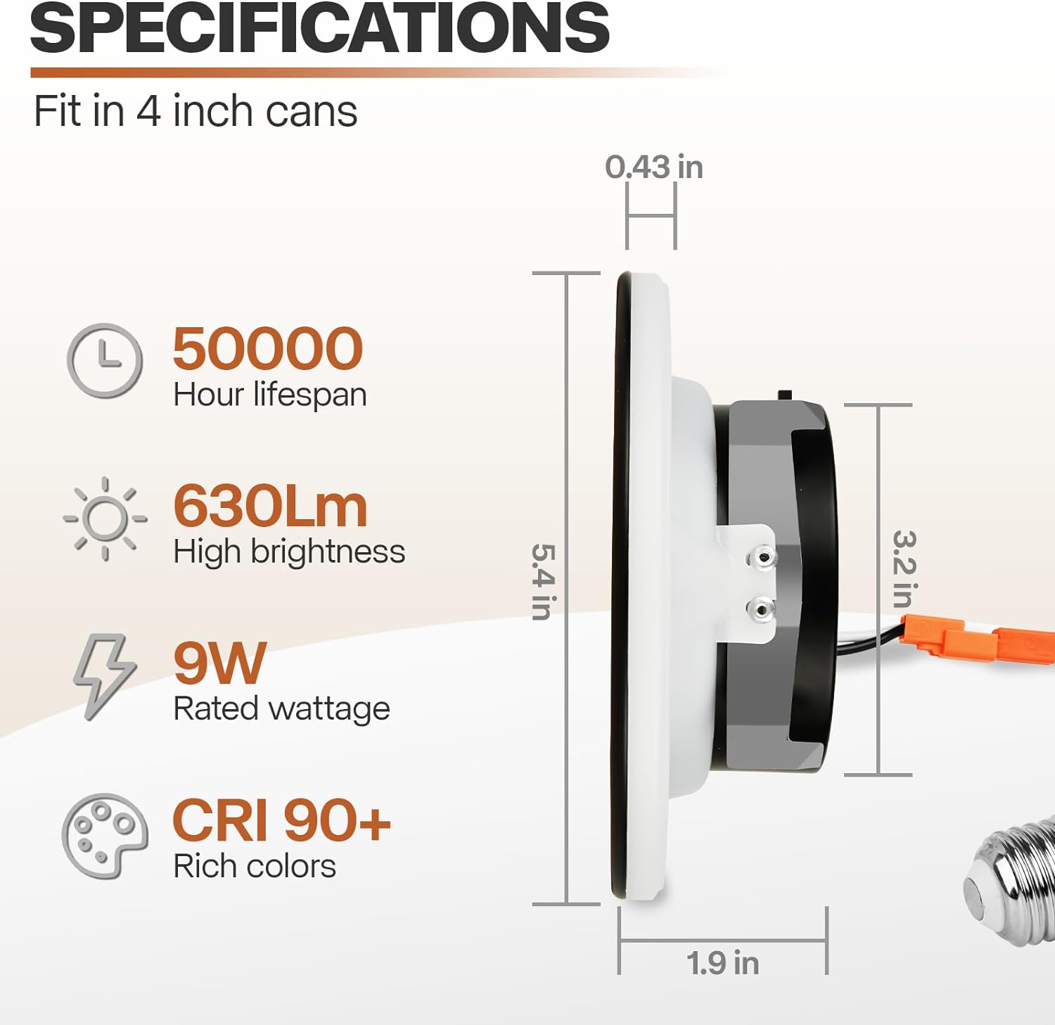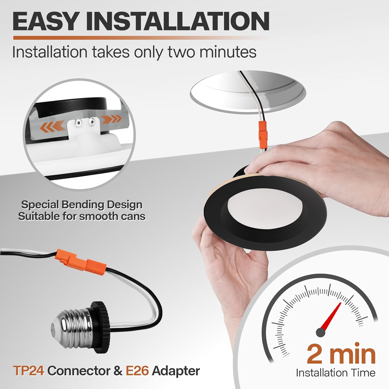 - 💡【Easy Install】 The retrofit LED recessed lighting no additional accessories are required. Instead of the traditional springs, they are ready to fit in 4 inch recessed housing cans with C clip. Standard E26 base allows you to easily screw into the can.