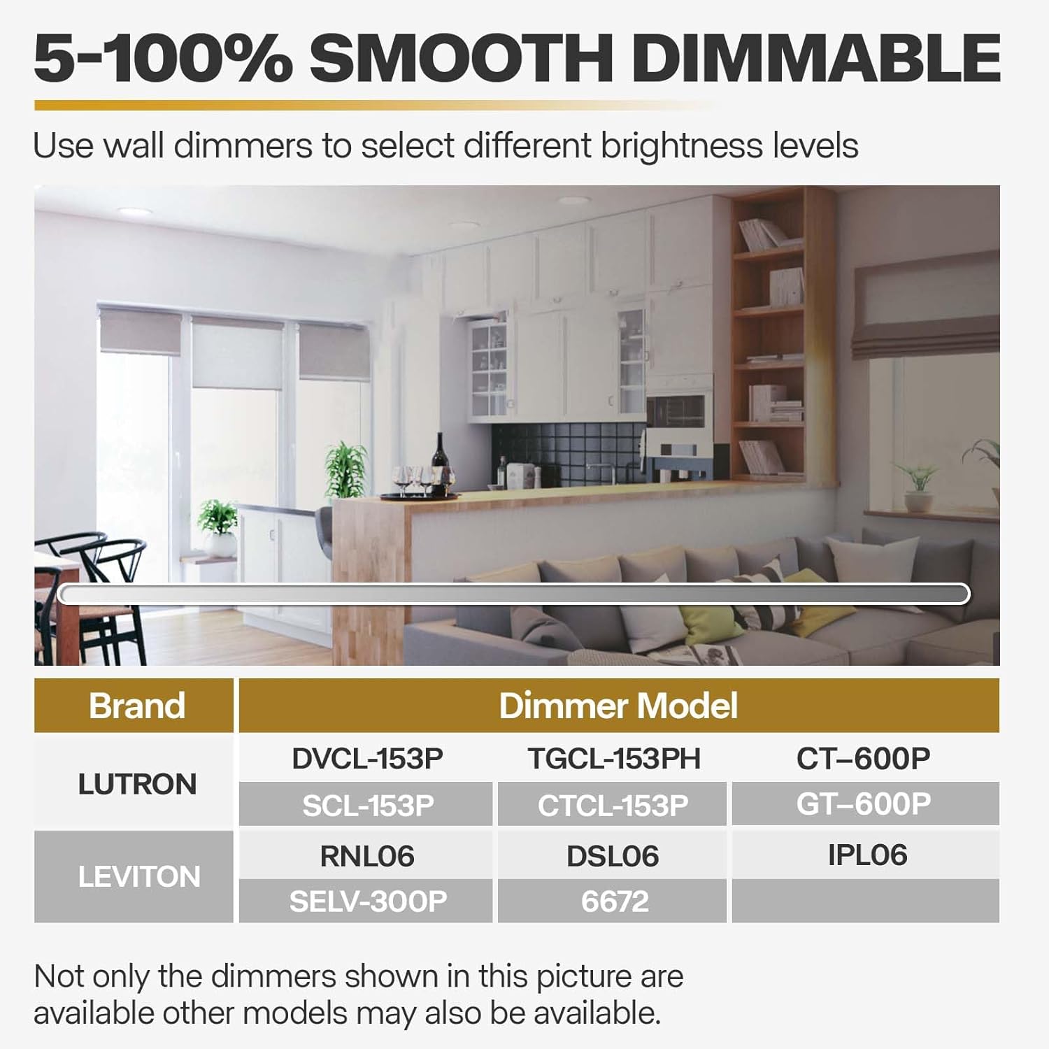 - 💡【Color Changing & Smooth Dimmability】 The retrofit LED recessed lighting 4 inch is dimmable, 2700K(Soft White), 3000K(Warm White), 4000K(Neutral White), 5000K(Cool White), 6000K(Daylight). 5-100% seamless and smooth dimming capabilities, compatible with most dimmers in the market.