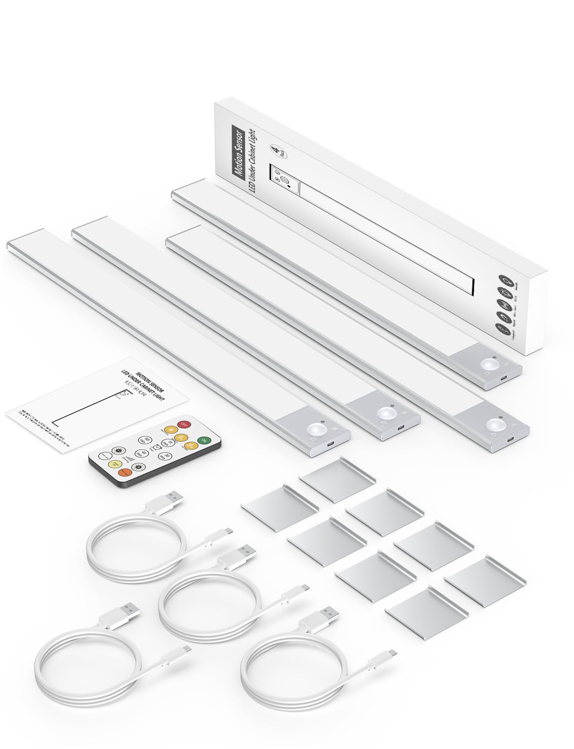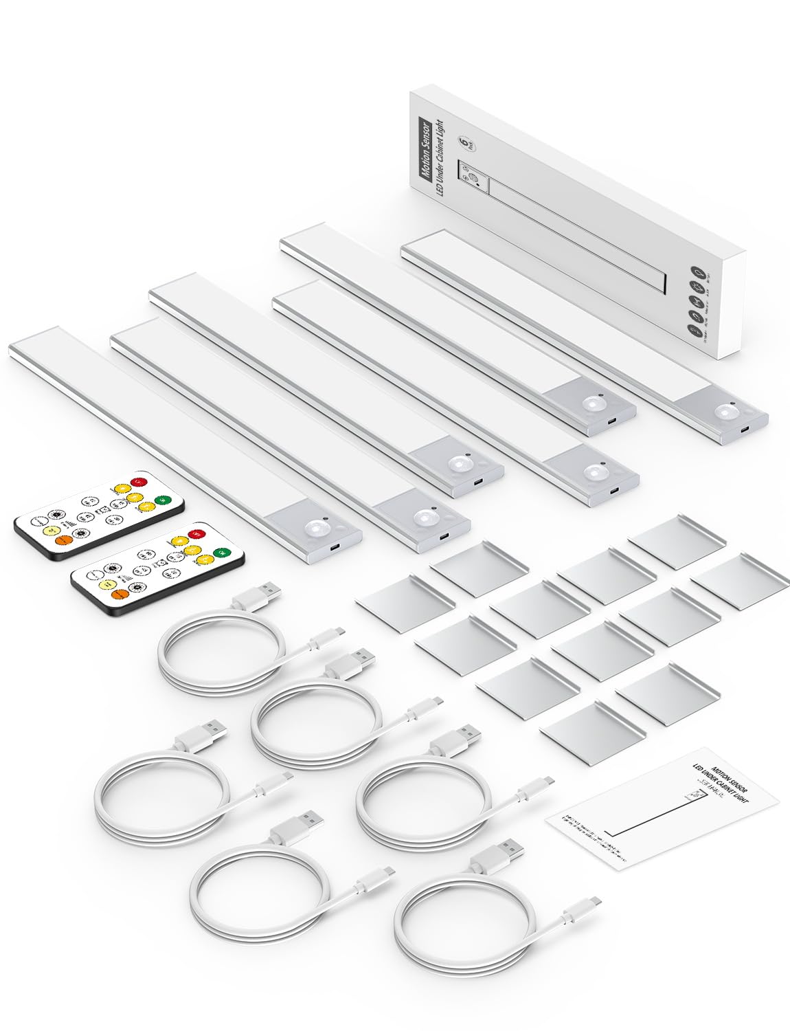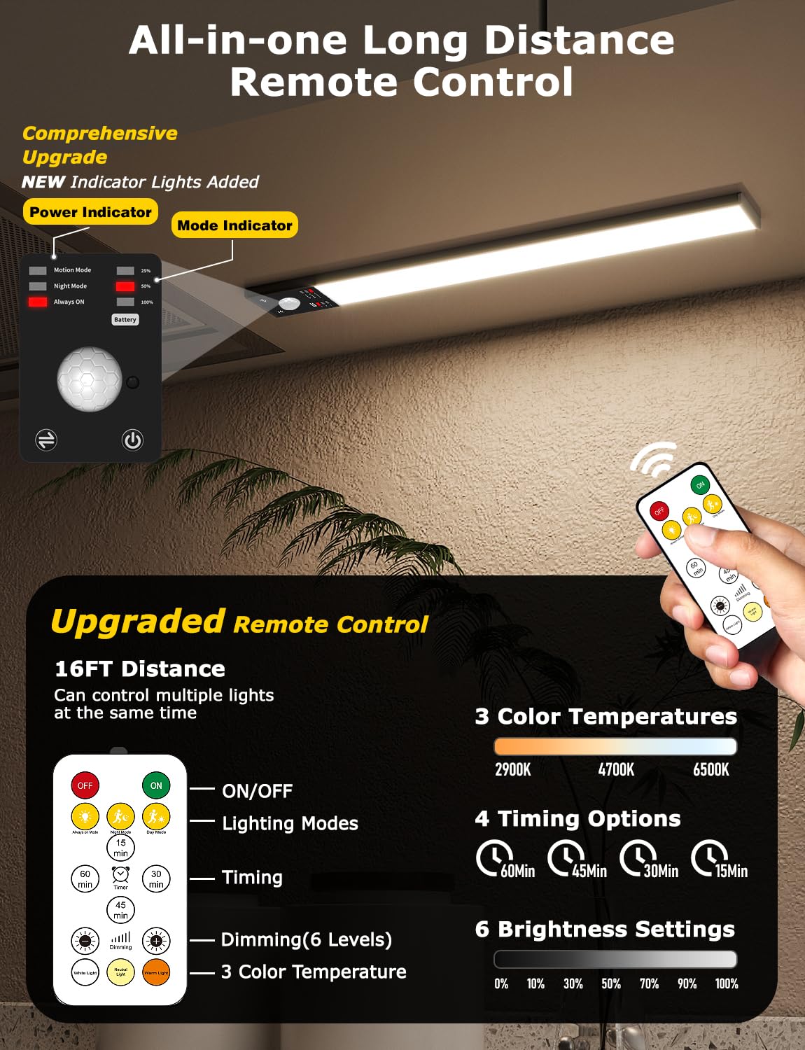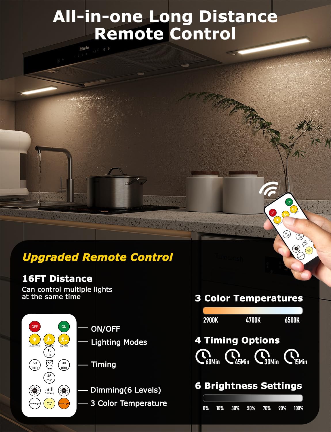 - 【3 Color Temperature & 4 Timers & 6 Levels Dimmable Under Cabinet Lights with Remote】— These under cabinet led lighting have 3 colors(warm white/natural white/cold white). With 4 time settings of 15Min/30Min/45Min/60Min, you can also adjust the brightness from 10% to 100% by pressing the button on the remote control, which can be operated within 16ft.