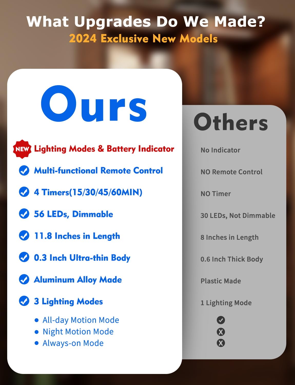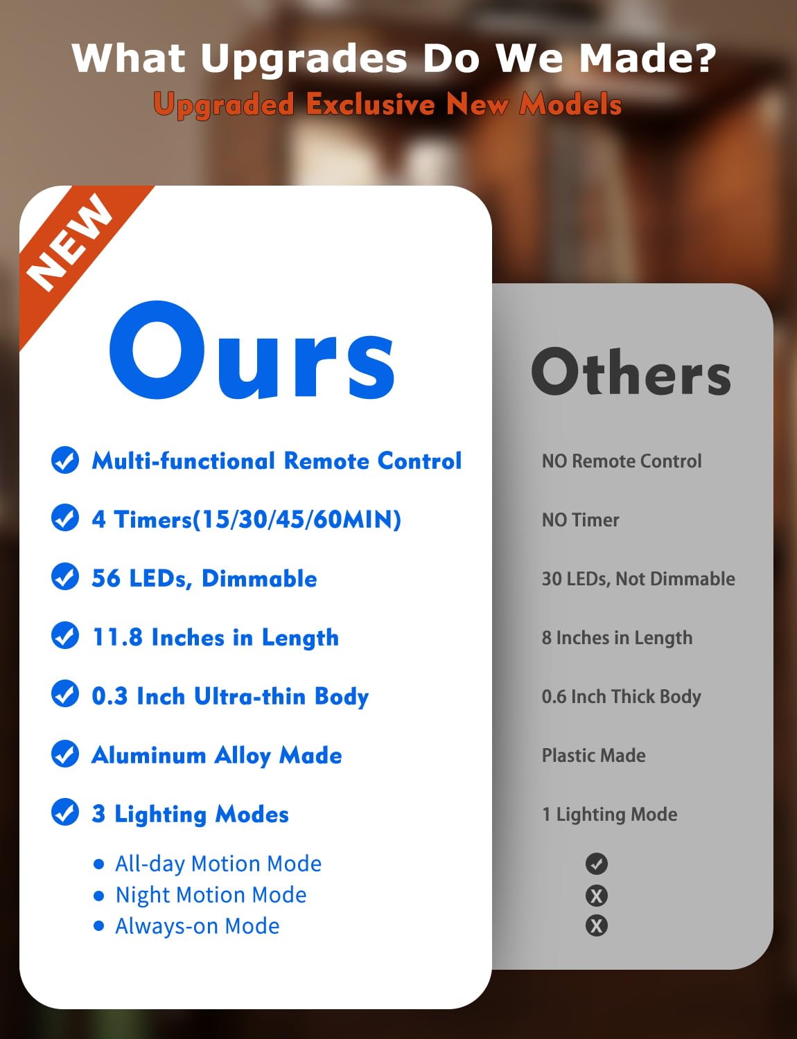 - 【56Pcs High-Bright LEDs with Wide Application】— With a wide adjustable brightness from ultra-bright to ultra-dim, this battery powered closet light can be used in the kitchen, stairway, bedroom, wardrobe, cupboard, workshop, garage, hallway, storage room, etc. This motion light indoor will greatly change your current lifestyle.