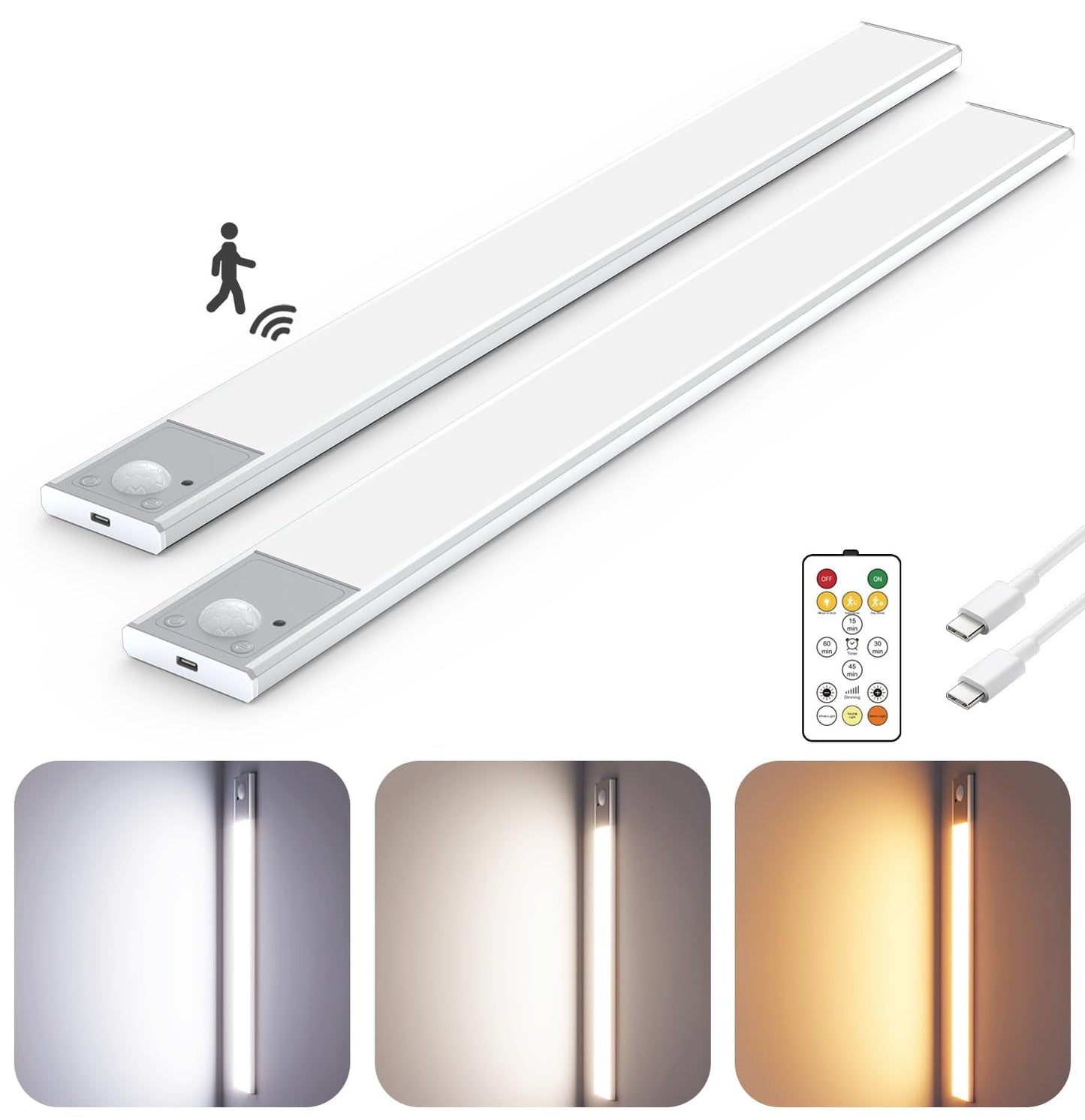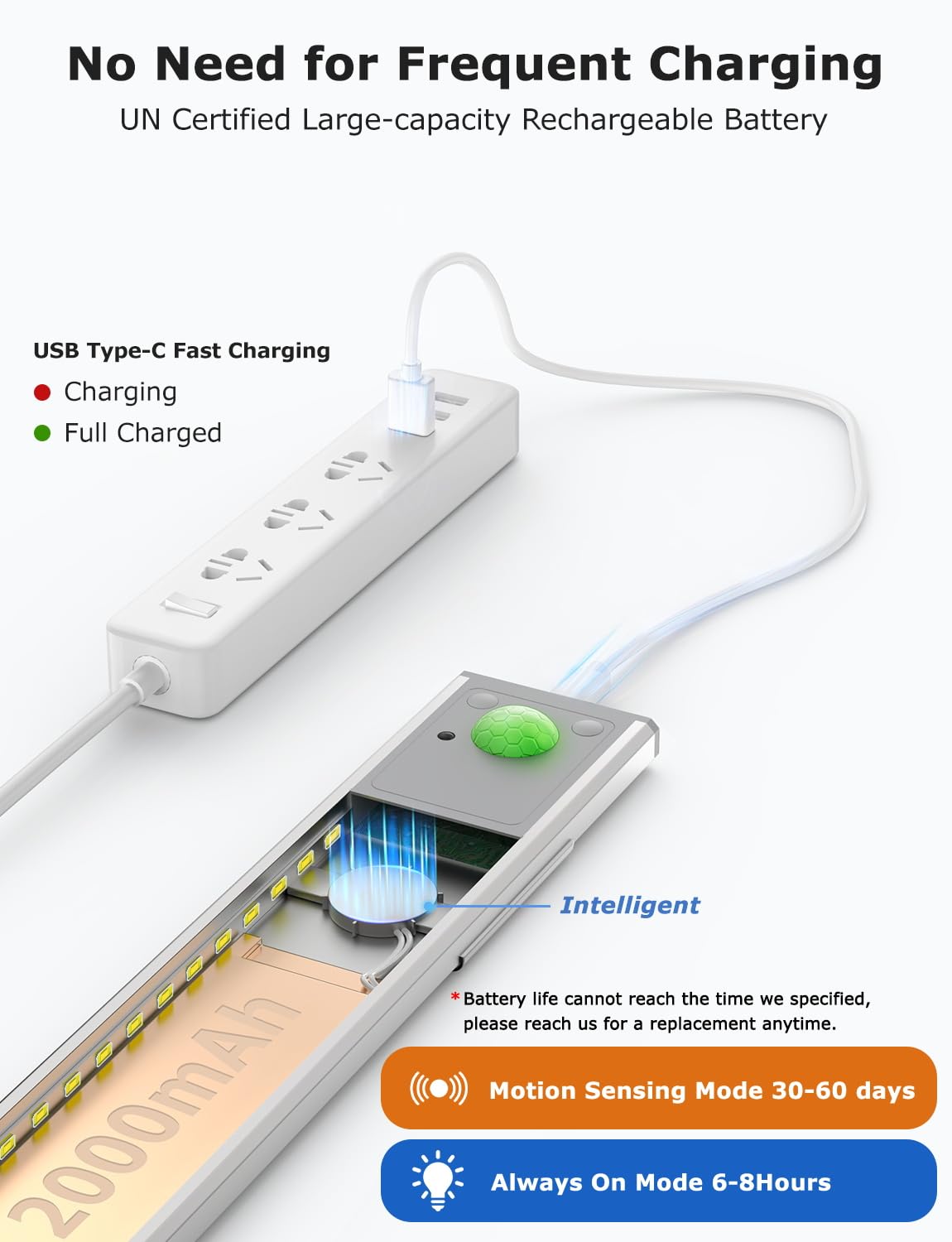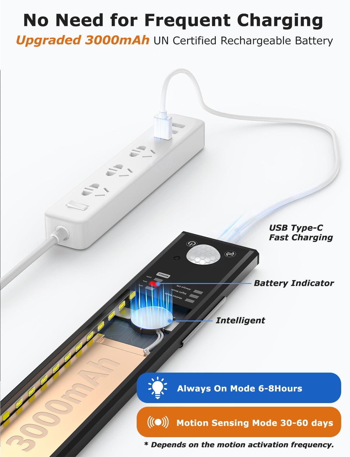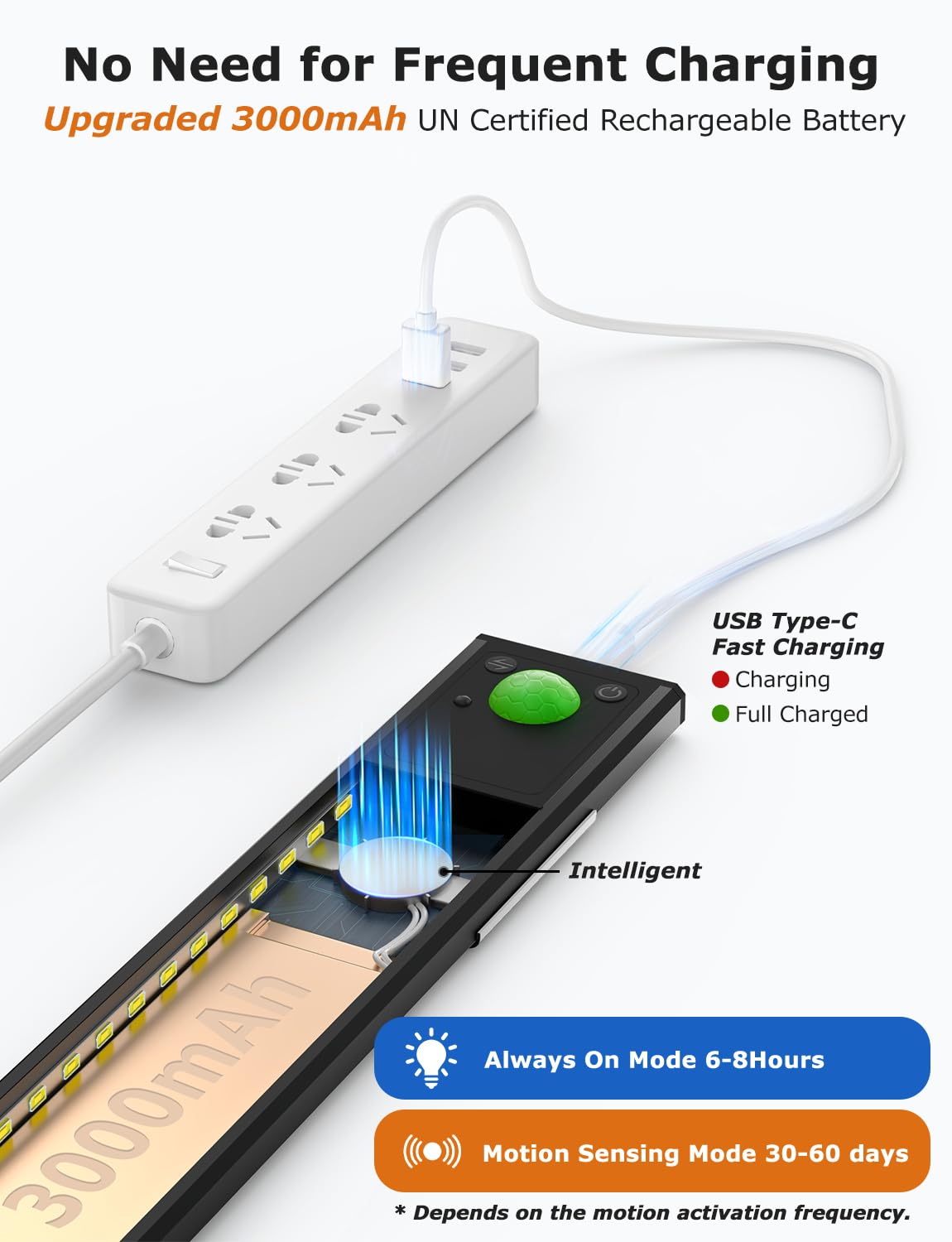 - 【USB-C Rechargeable Under Cabinet Lighting】— These closet lights battery operated have a built-in 3000mAh upgrade high-capacity USB-C rechargeable battery. A full charge lasts 30-60 days in sensor mode (depending on how often you use it) or 6-8 hours in always-on mode (100% brightness). They are lights for closet with no electricity, closet light no wiring. * 5V~9V charger recommended.