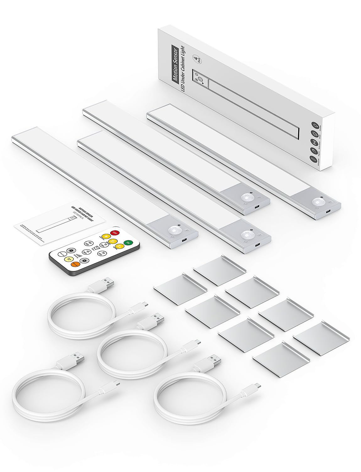 12" Thin Motion-Activated Under Cabinet Lighting, Aluminum Alloy Under Counter Lights for Kitchen, 3-Color-Temps Magnetic Closet Lights, Rechargeable Motion Sensor Light Indoor (4Pack, Silver)