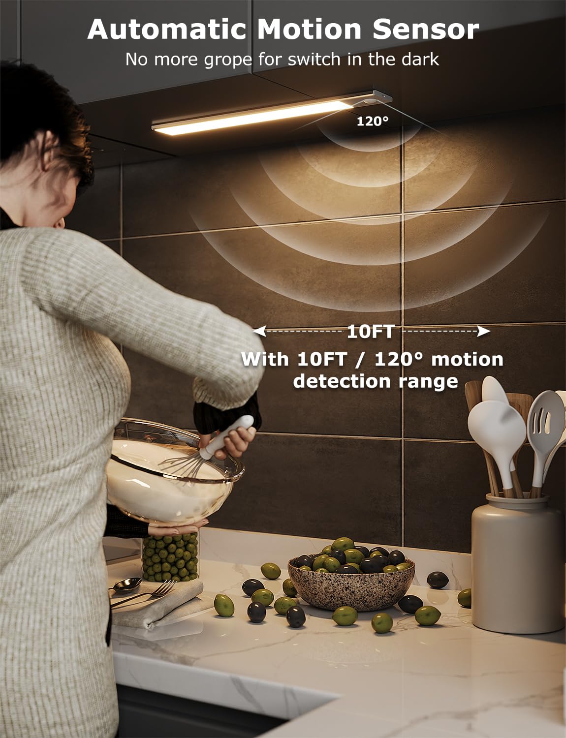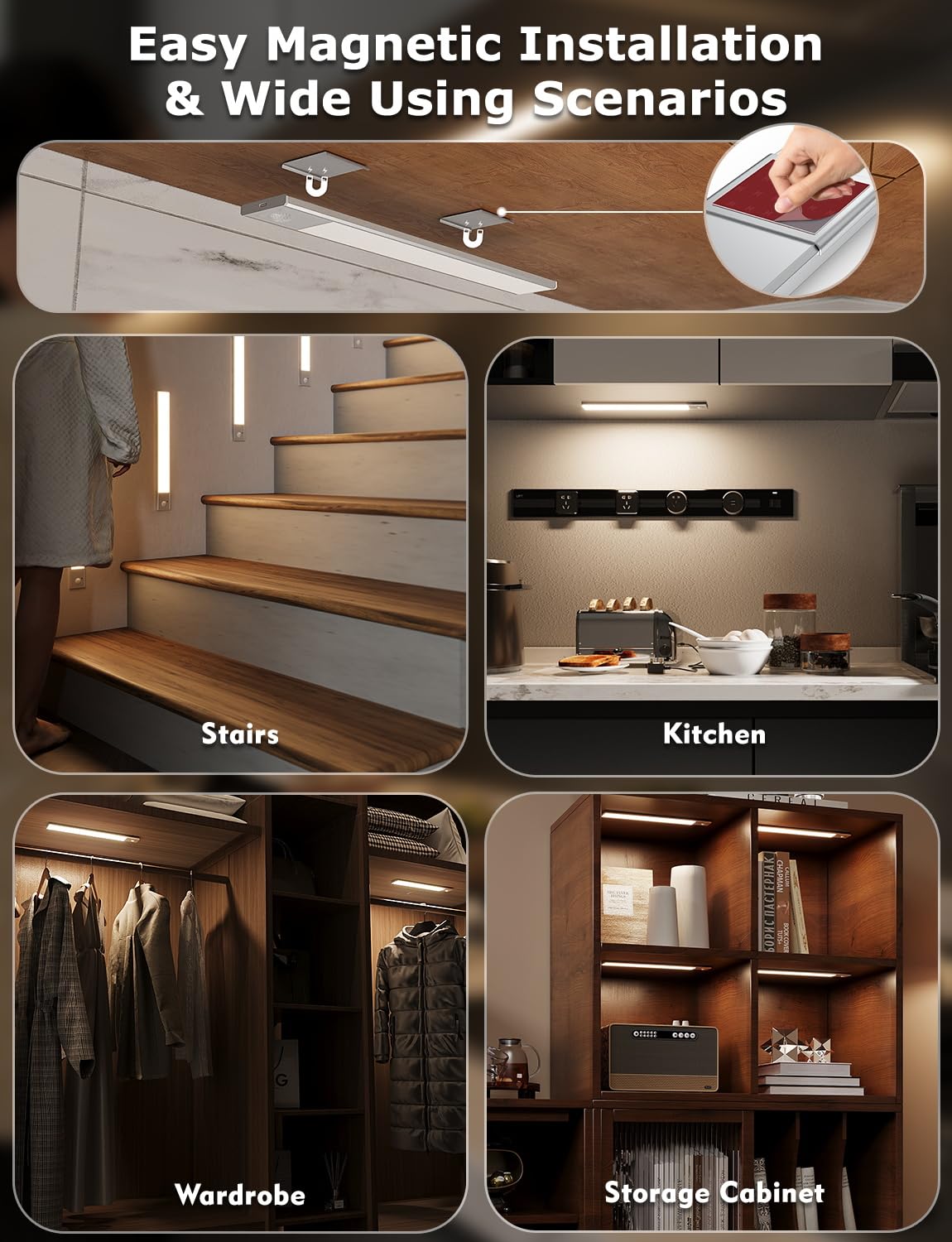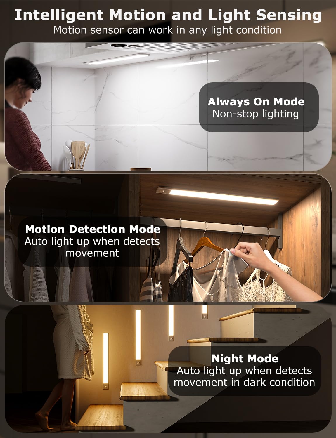 - 【11.8INCH Daylight & Motion Sensor Indoor Lights】— In motion mode, the closet lights motion sensored will turn on when movement detected within a 10ft range. — In night mode, it will auto-turn on when detects movement in low-light or dark environments. — Meanwhile, it can also be set to always-on mode when needed. They are ideal for closet lighting, under-counter light fixtures, wireless display lighting, etc.