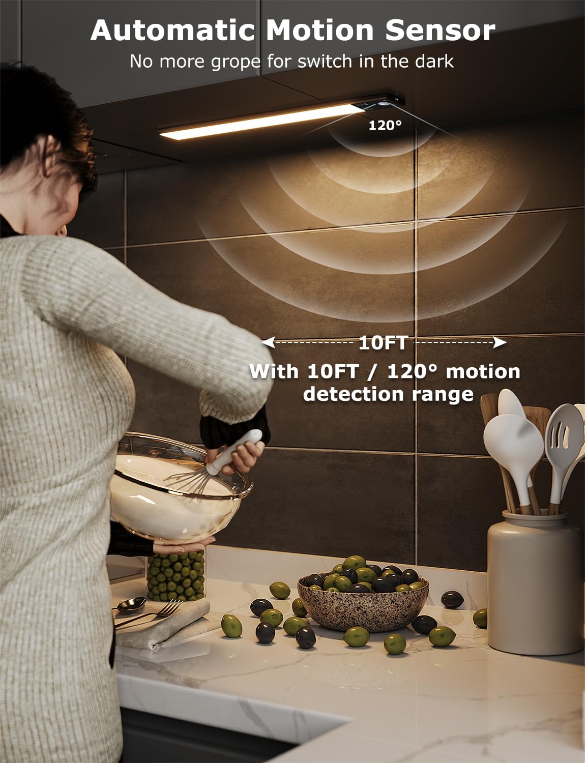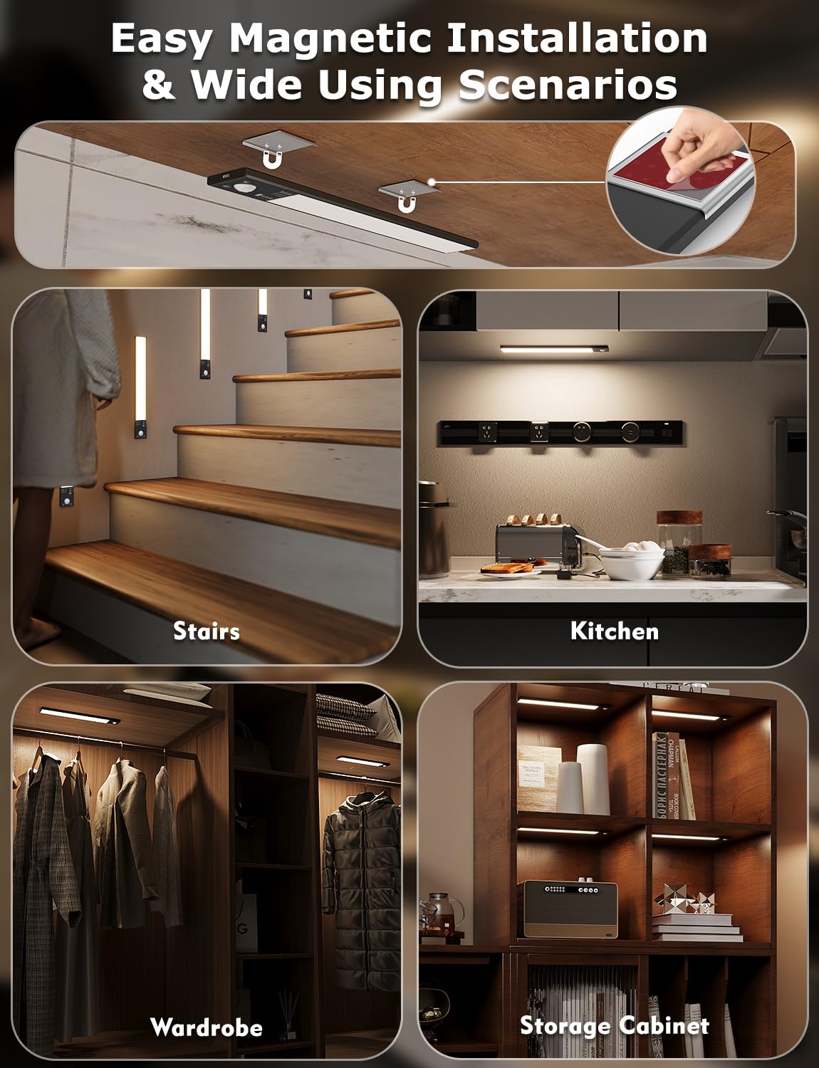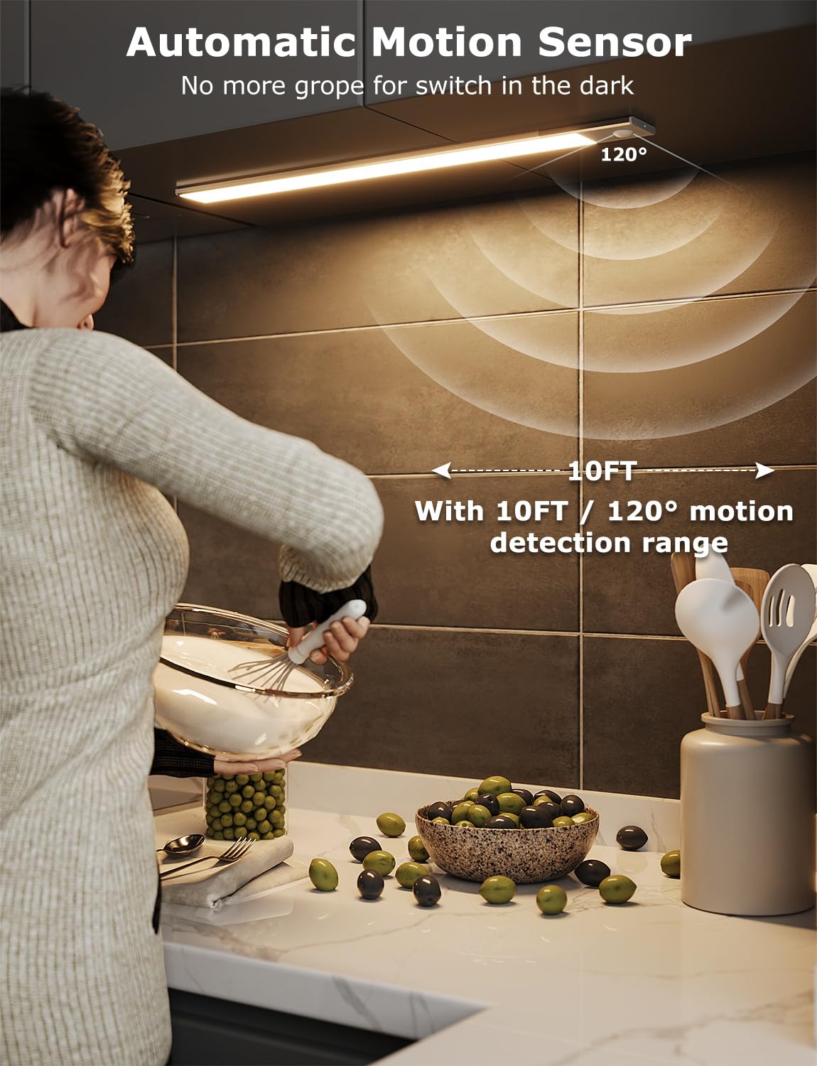 - 【11.8INCH Daylight & Motion Sensor Indoor Lights】— In motion mode, the closet lights motion sensored will turn on when movement detected within a 10ft range. — In night mode, it will auto-turn on when detects movement in low-light or dark environments. — Meanwhile, it can also be set to always-on mode when needed. They are ideal for closet lighting, under-counter light fixtures, wireless display lighting, etc.