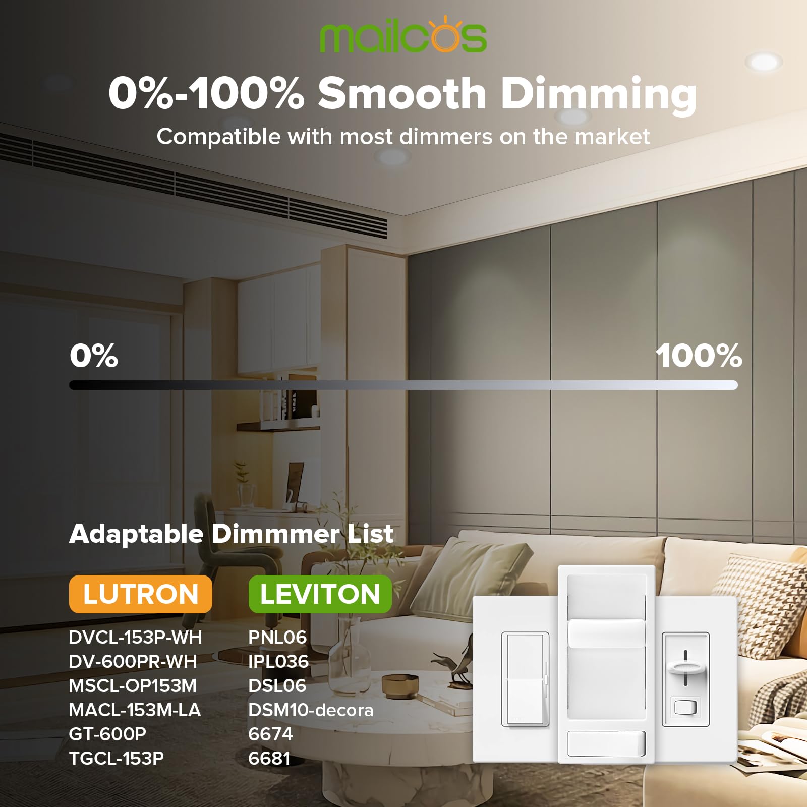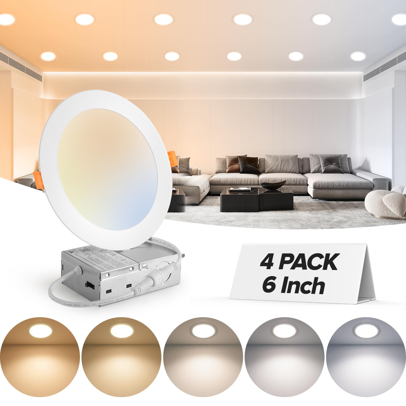 - 5 CCT in one: Mailcos's 6 inch LED recessed light comes with 5 color temperatures (2700K, 3000K, 3500K, 4000K, 5000K) for you to choose. Just slide the switch on the side of the J-box and you will get the most-desired color that best fit in your room type such as kitchen, living room, bedroom, bathroom, workplace, garage, corridors, basement and any other indoor spaces.