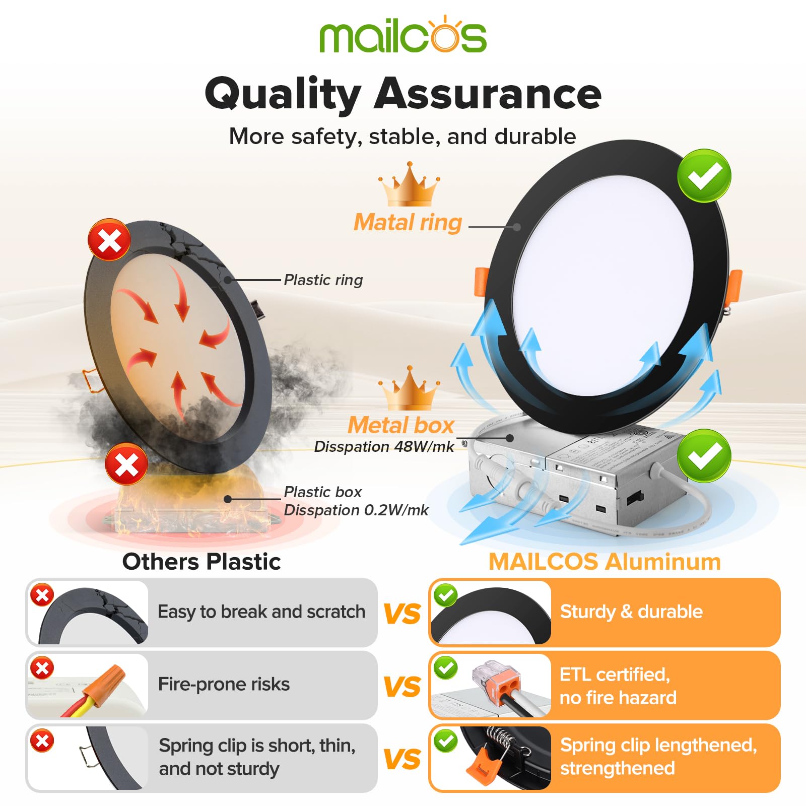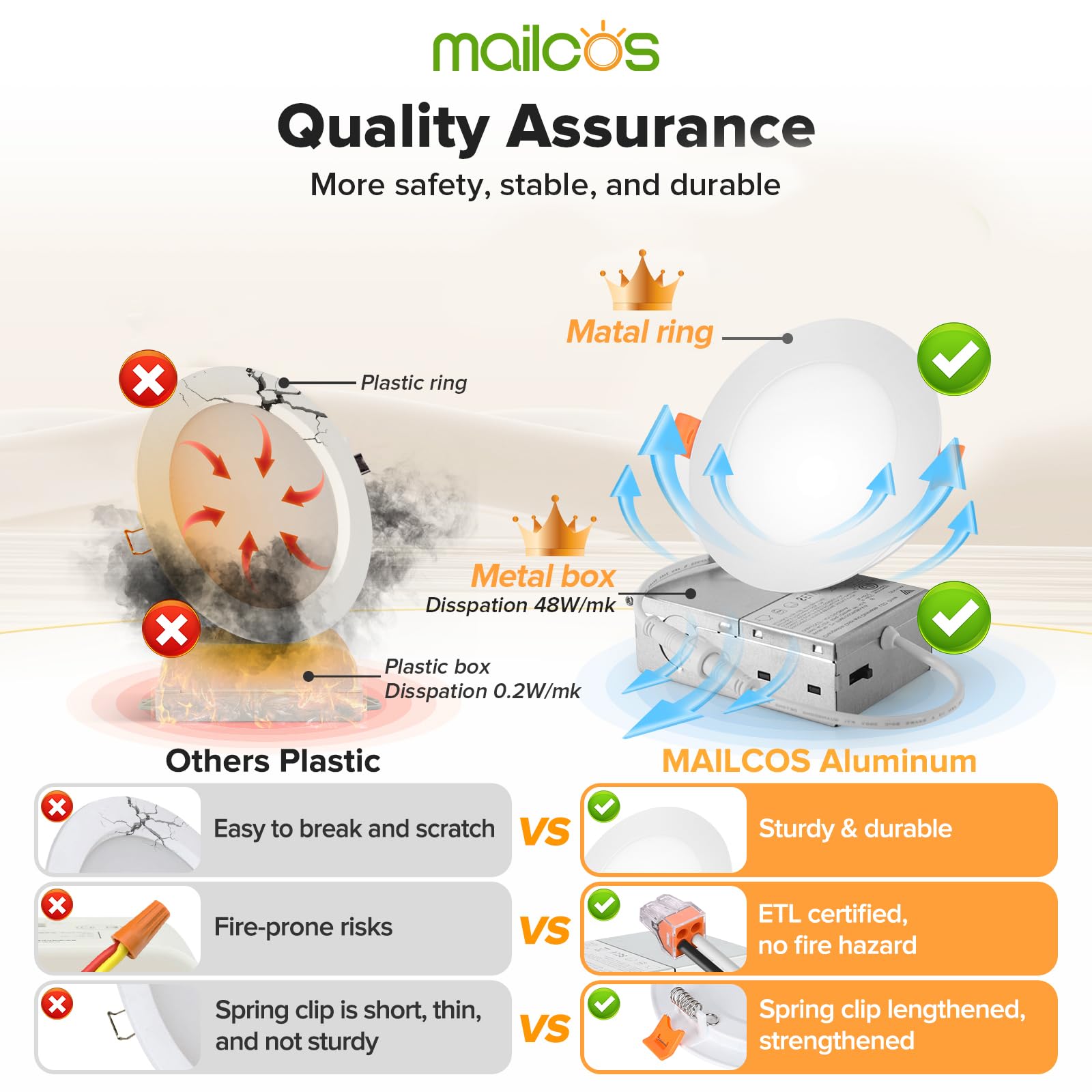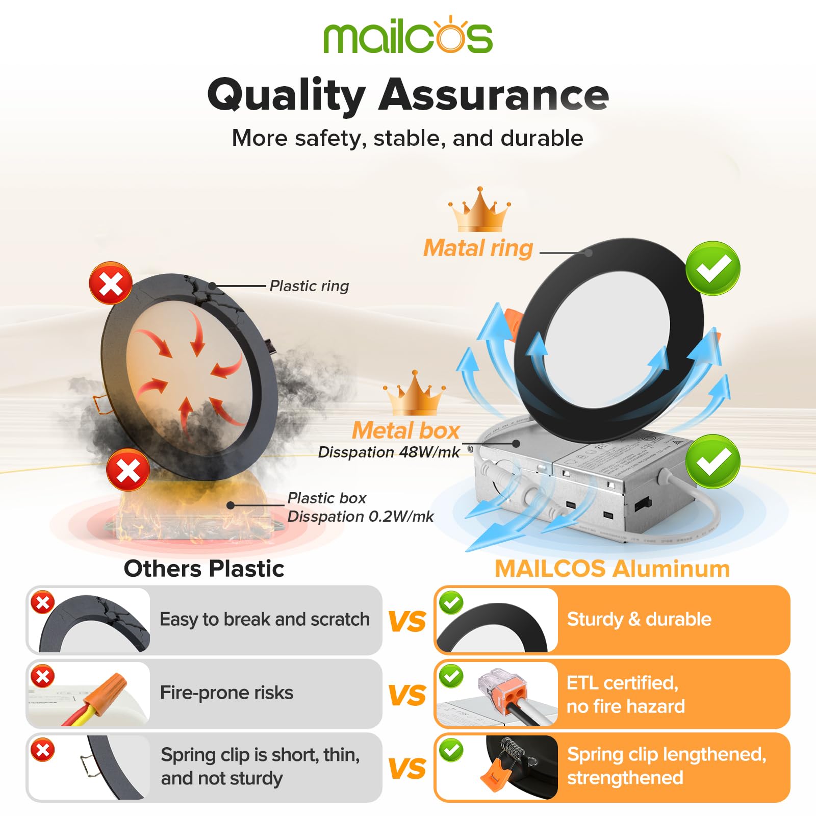- Mailcos Strengths: Our whole light body is made of metal material and sprayed with wear-resistant white paint, the quality and safety of our lights are much higher than others made of plastic materials. And our led recessed lights enjoy 50000 hours life span. We provide 7*24h after-sales service. Contact us if any issue arises.