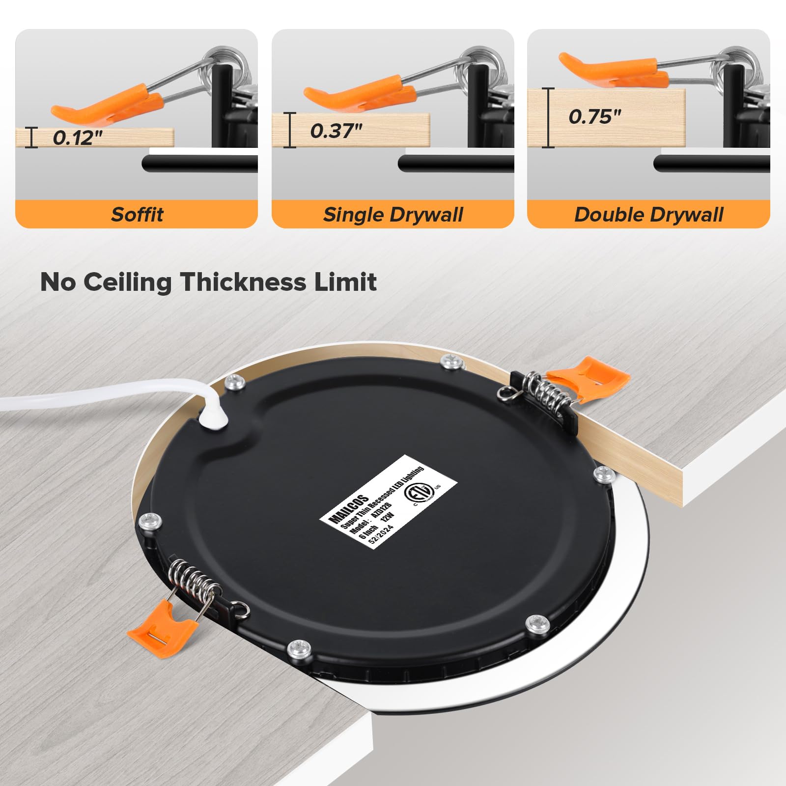 - Easy Installation: The ultra-thin recessed lighting is suitable for retrofit and new decoration. It only requires as small as 2 inches ceiling space, fits various ceilings and joists. Simply follow three steps: Cut a hole in ceiling with 1:1 hole template; Connect the J-box to the cable; Use spring clip to fix it on the ceiling. Recessed can is no longer a limitation for your choice.