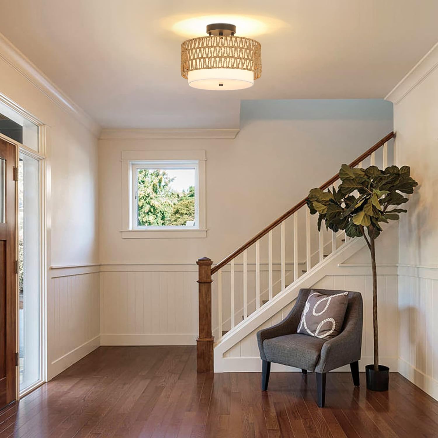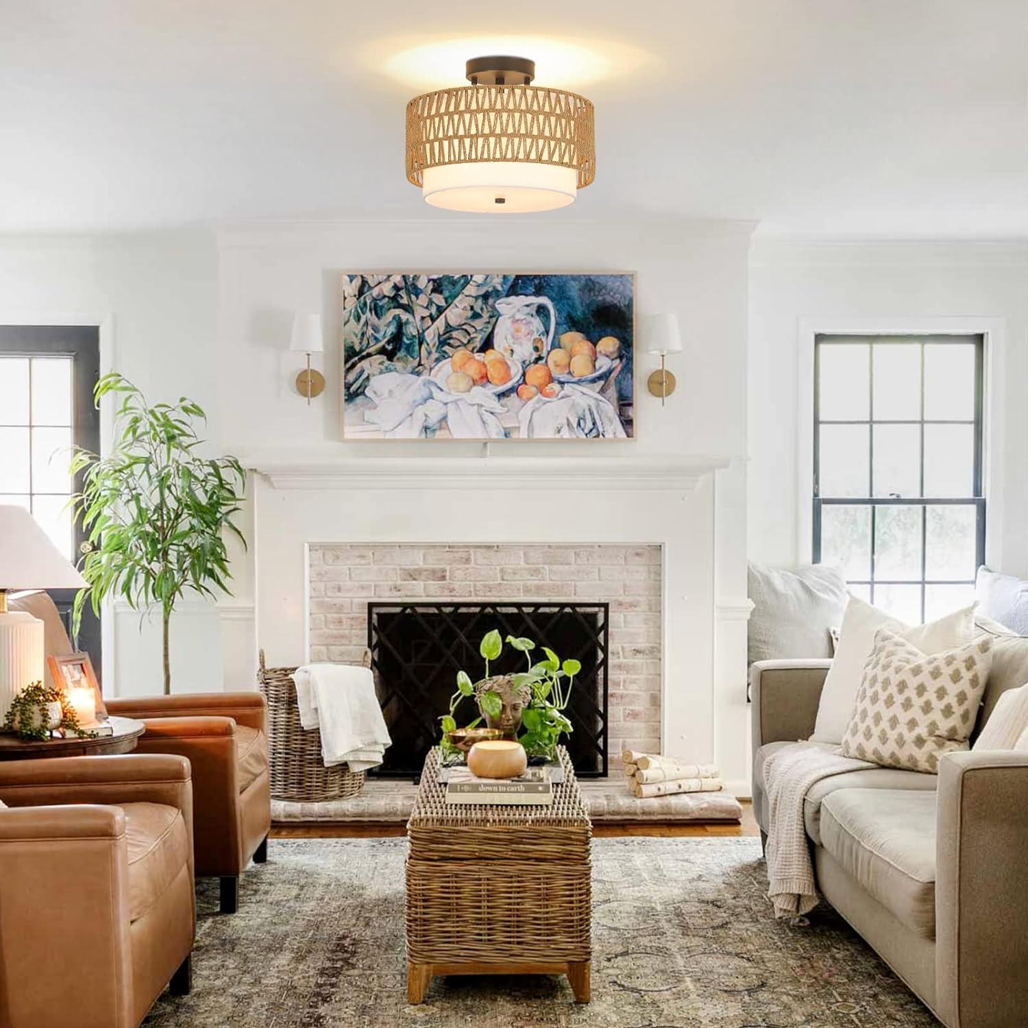 ?[3-Lights Rattan Light Fixture] This boho light fixture has a 100% hand-woven natural rattan shade on the outside, which is more Eco-friendly, safety and healthy. Drum-shaped semi flush mount ceiling light has a farbic shade inside, which helps to soften the light and protect your eyes. Double shade design allows this rattan ceiling light to combine farmhouse and modern elegance perfectly. This boho light fixtures ceiling mount will bring warm light and a wonderful boho ambience to your home.
