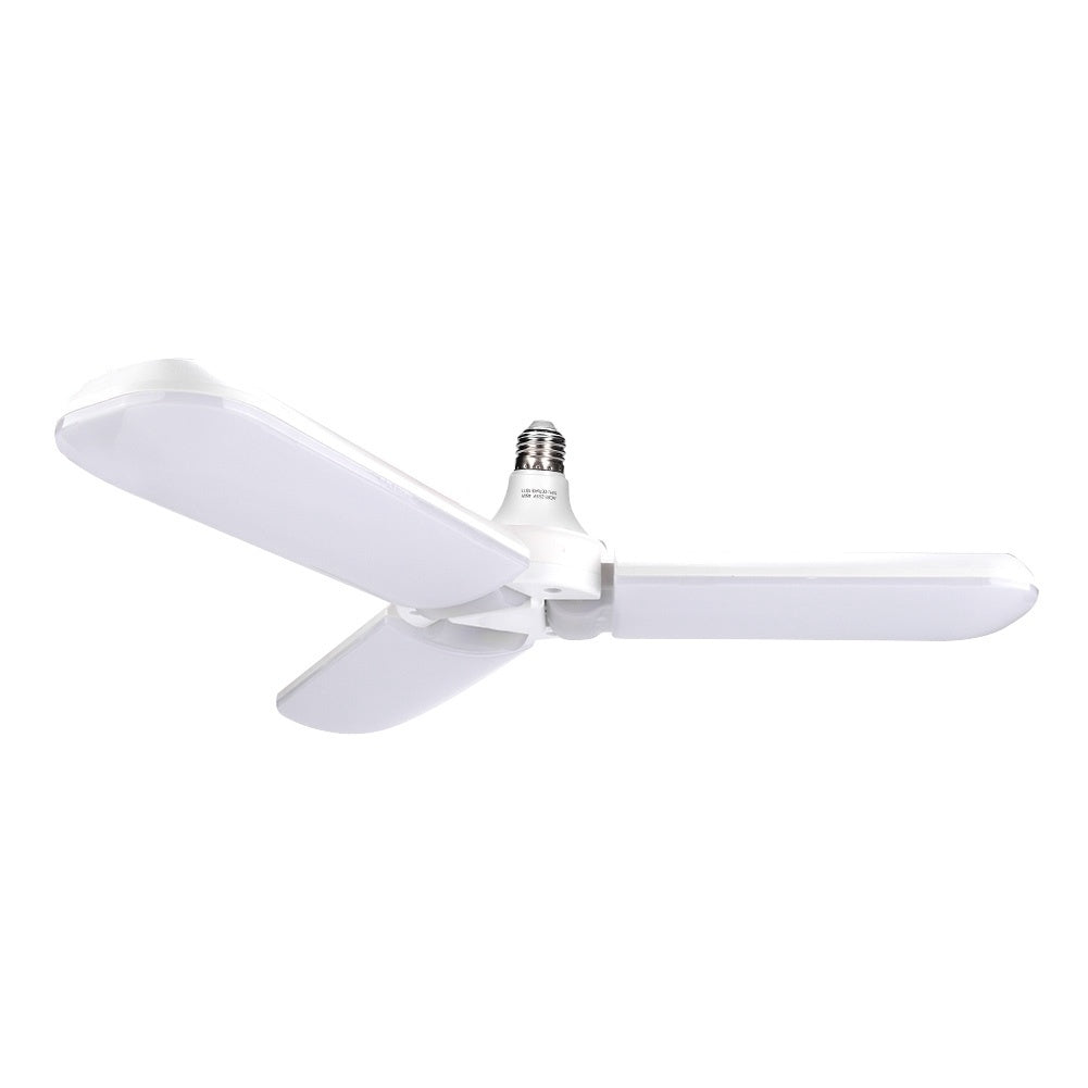 Features: Premium LED source, bright, no flicker, eye-friendly, low power consumption, long service life. Unique folding fan blade design, providing wider illumination area and uniform luminance. Non-flammable plastic lampshade is sturdy and durable, fast heat dissipation and easy to clean. Standard E27 lamp head, universal for various lighting devices, easy to install and use. Can be used for many places, warehouse, home, school, etc. Specification: Material: LED+PC LED: 2835 LED Quantity: 228pcs Color: as picture shown Socket: E27 Power: 45W Color Temperature: 6500K Cold white Luminous Flux: 3200lm Beam Angle: 270 degree CRI: 60-70 Power Factor: 0.5 Input Voltage: 85-265V Size: Approx. folded-75*240mm / 2.95*9.45inch, unfolded-350*90mm / 13.8*3.5in Weight: Approx. 340g Package List: 1 x 3 Blade Lamp