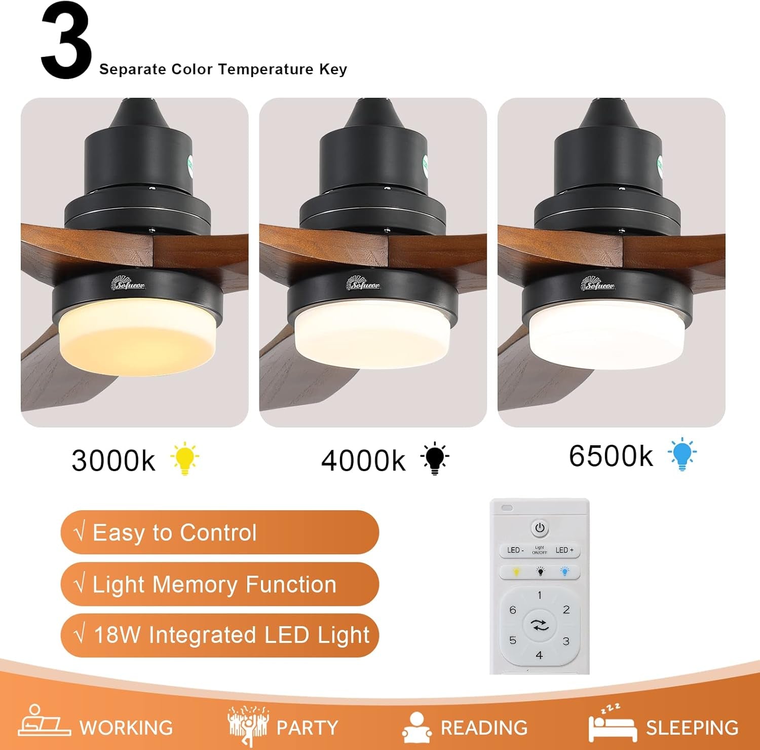- Ceiling Fan with Lights: The fan includes an integrated LED light with three color temperatures: 3000K warm light, 4000K natural light, and 6500K white light. Adjust brightness from 20% to 100% for your comfort.