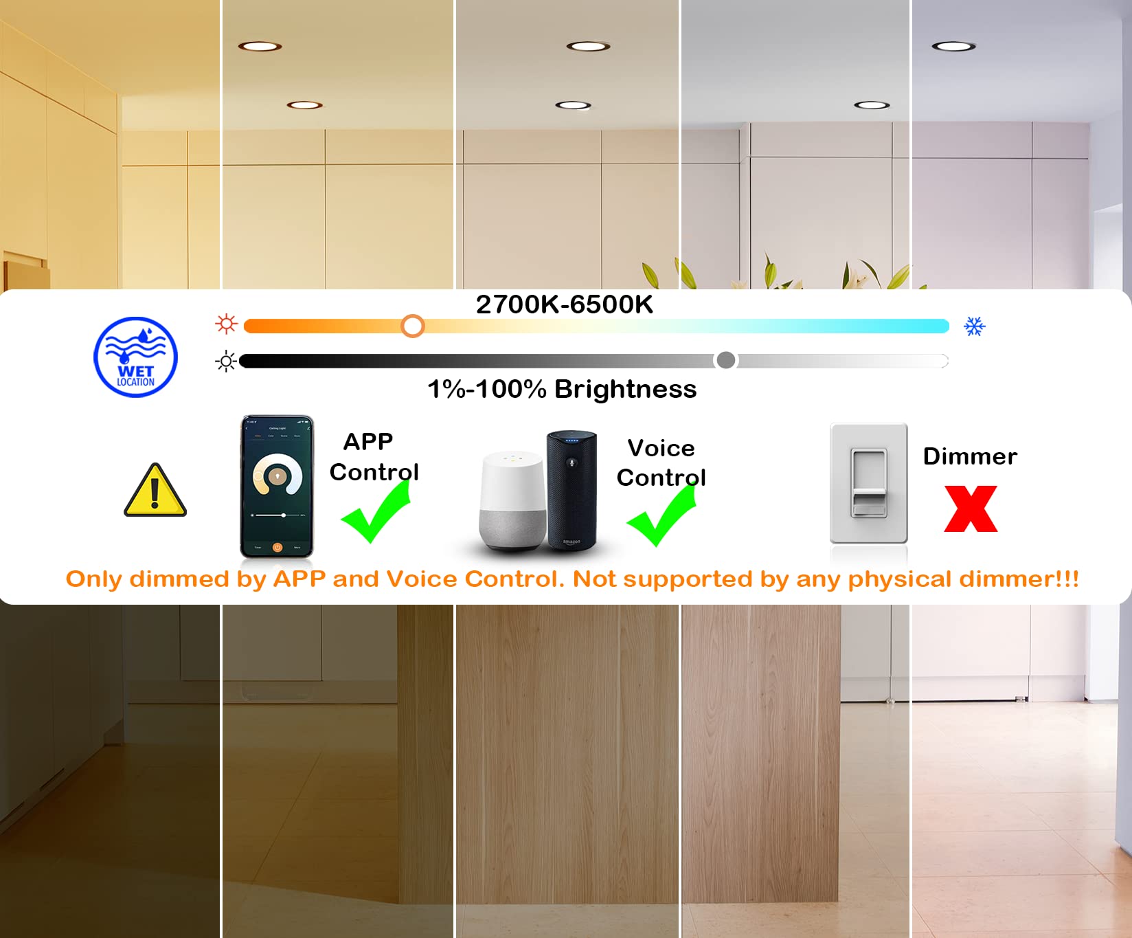 [6 Pack] CLOUDY BAY 4inch Smart WiFi LED Recessed Lights,RGBCW Color Changing Recessed Lighting,Compatible with Alexa and Google Home Assistant,10W 2700K-6500K,CRI90+ Wet Location,White Finish