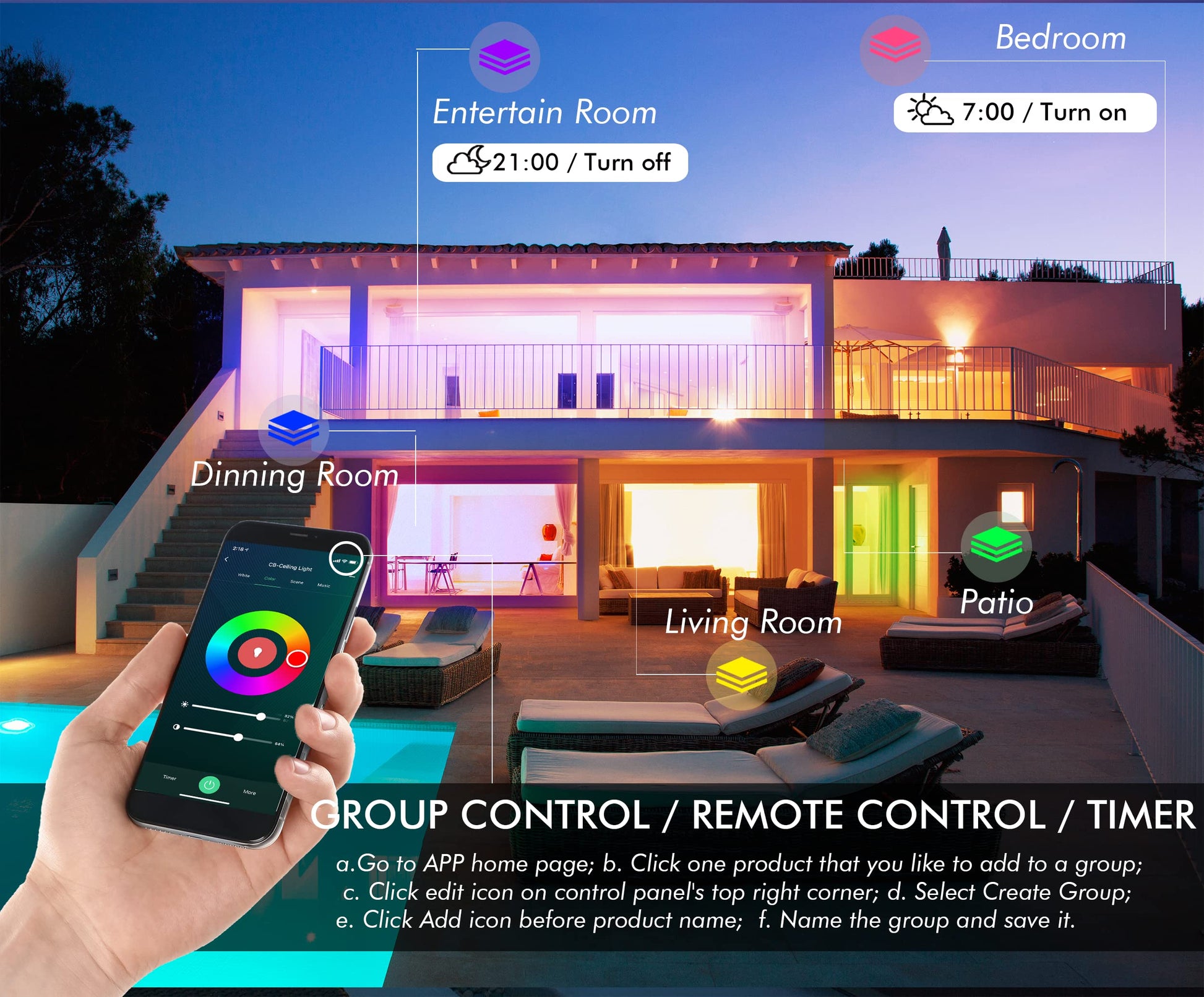 - 【Group and Remote Control】Lights can be divided into individual or groups like living room, bedroom, bathroom and so on. You can set a lighting schedule for bedroom lighting turns on/off at anytime you want as the light has timer function. Besides, don’t worry forgot turn off the light when you left home, remote control would help