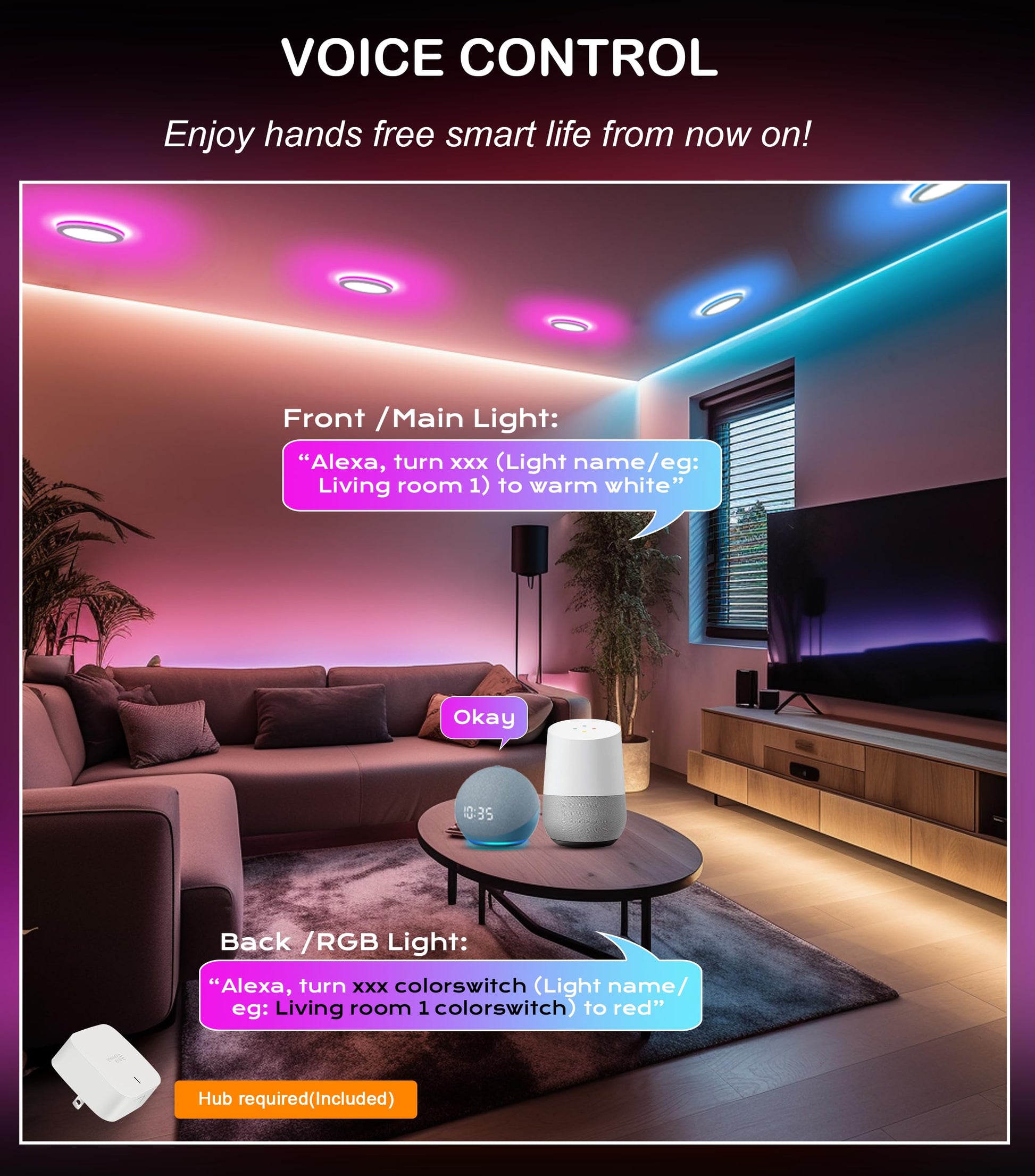 - 【APP Control】Download CloudyBay APP on App Store, quick to enjoy smart live with App control--accurately set the lights from 2700K to 6500K, 1%-100% brightness,(Only support for APP control and Voice control) and 16+ million colors etc.Not dimmed by dimmer switch.