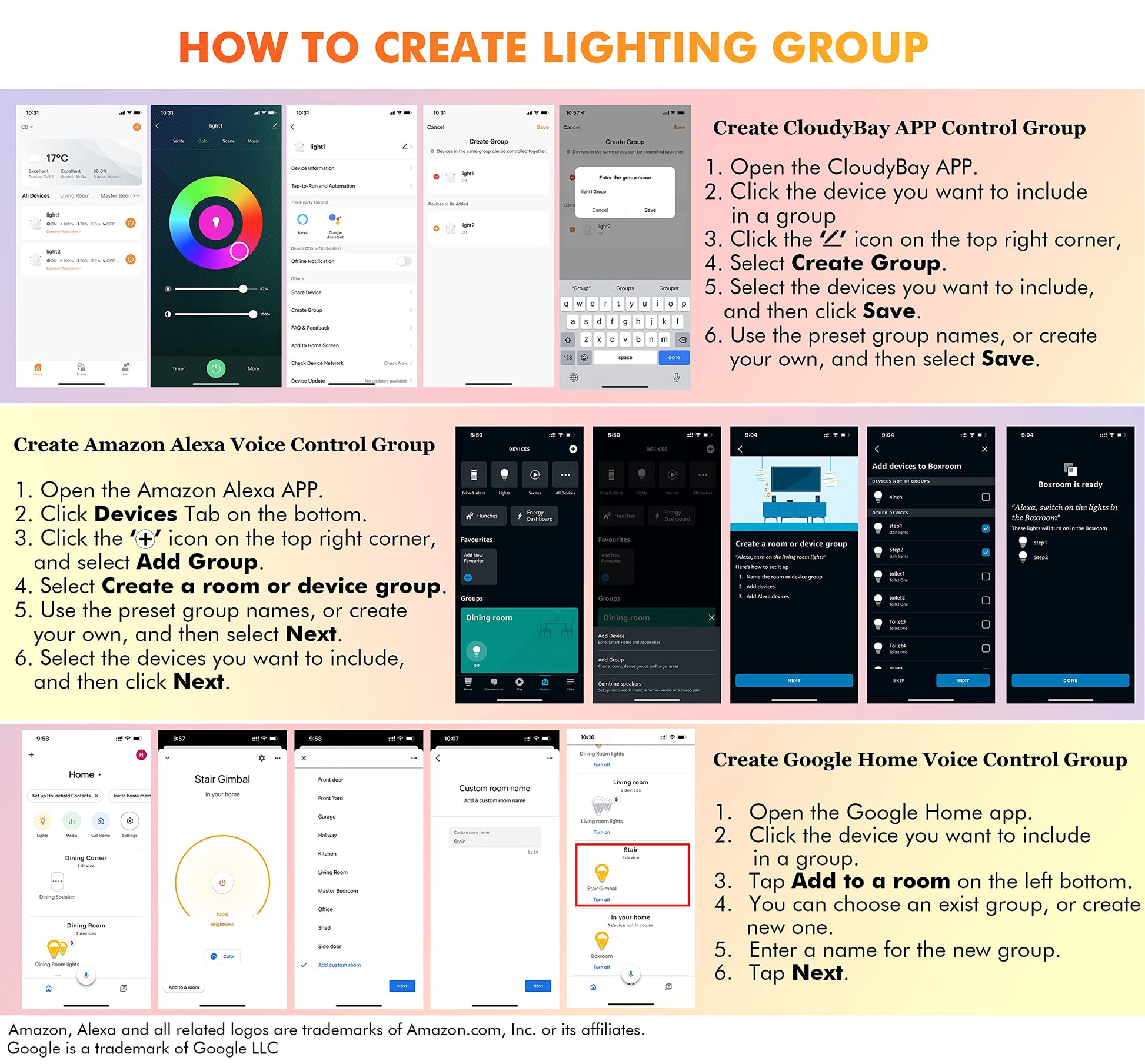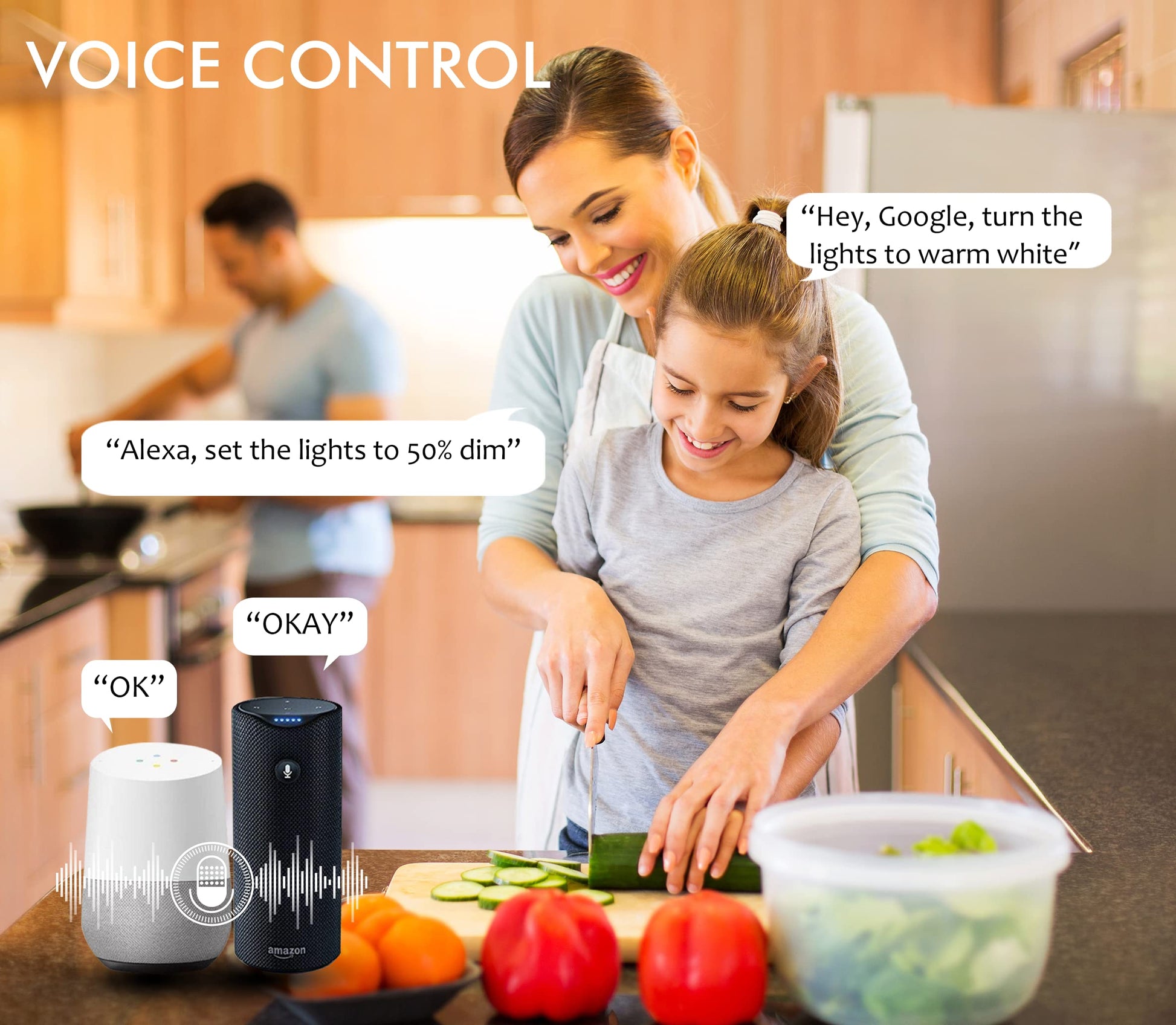 - 【Voice Control】 Work with Amazon Alexa, Google assistance(Hey, Google), get ready to start hands free lighting experience by using simple sentence like “Alexa, dim the light to 20%’’ Brightness would change after you hear: “OK”. You can set the brightness, CCT and RGB color by voice control