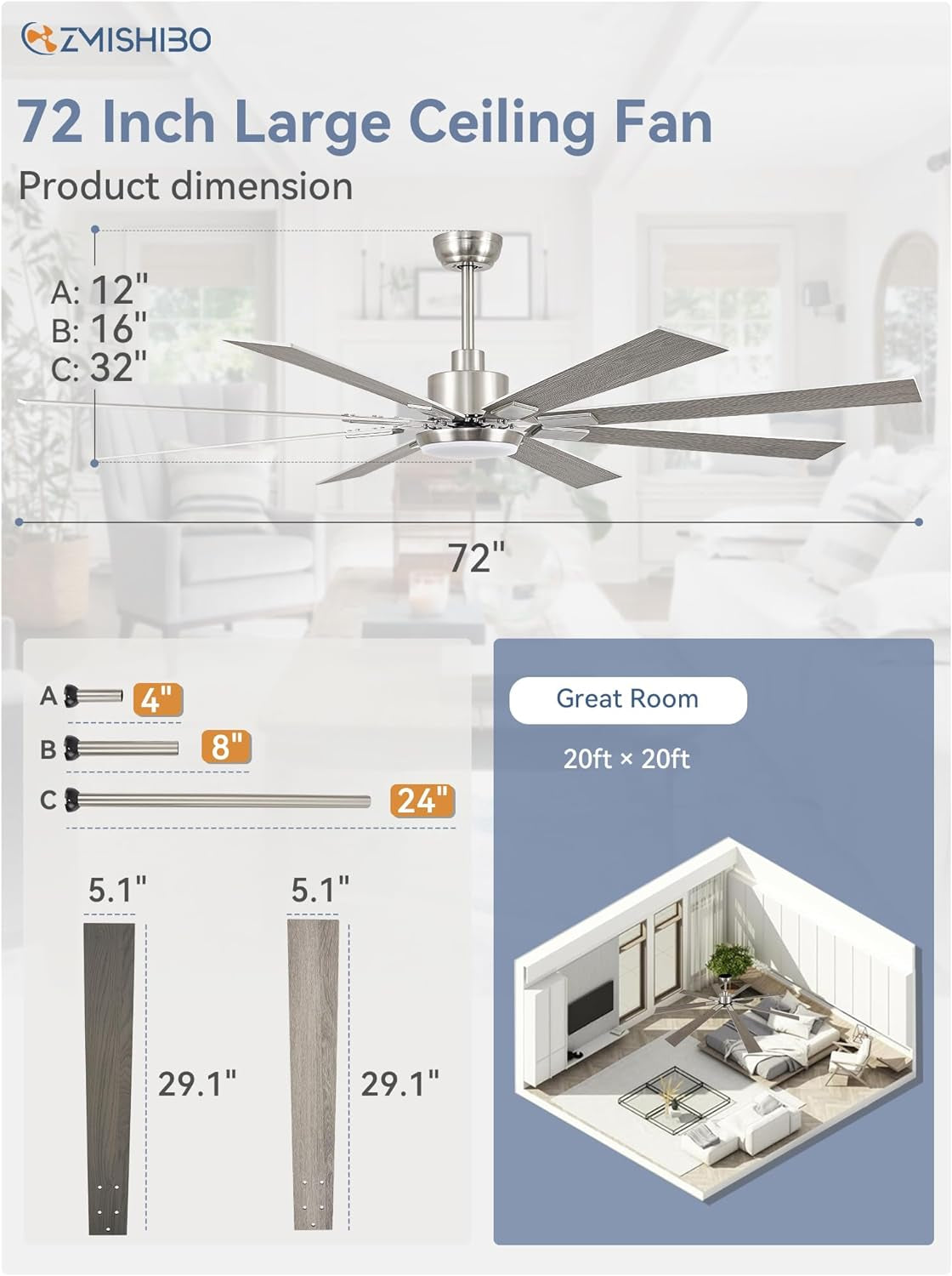 - 72-inch Design: Perfect for large spaces with multiple down rod options (4”, 8”, and 24”) for adaptable installation.