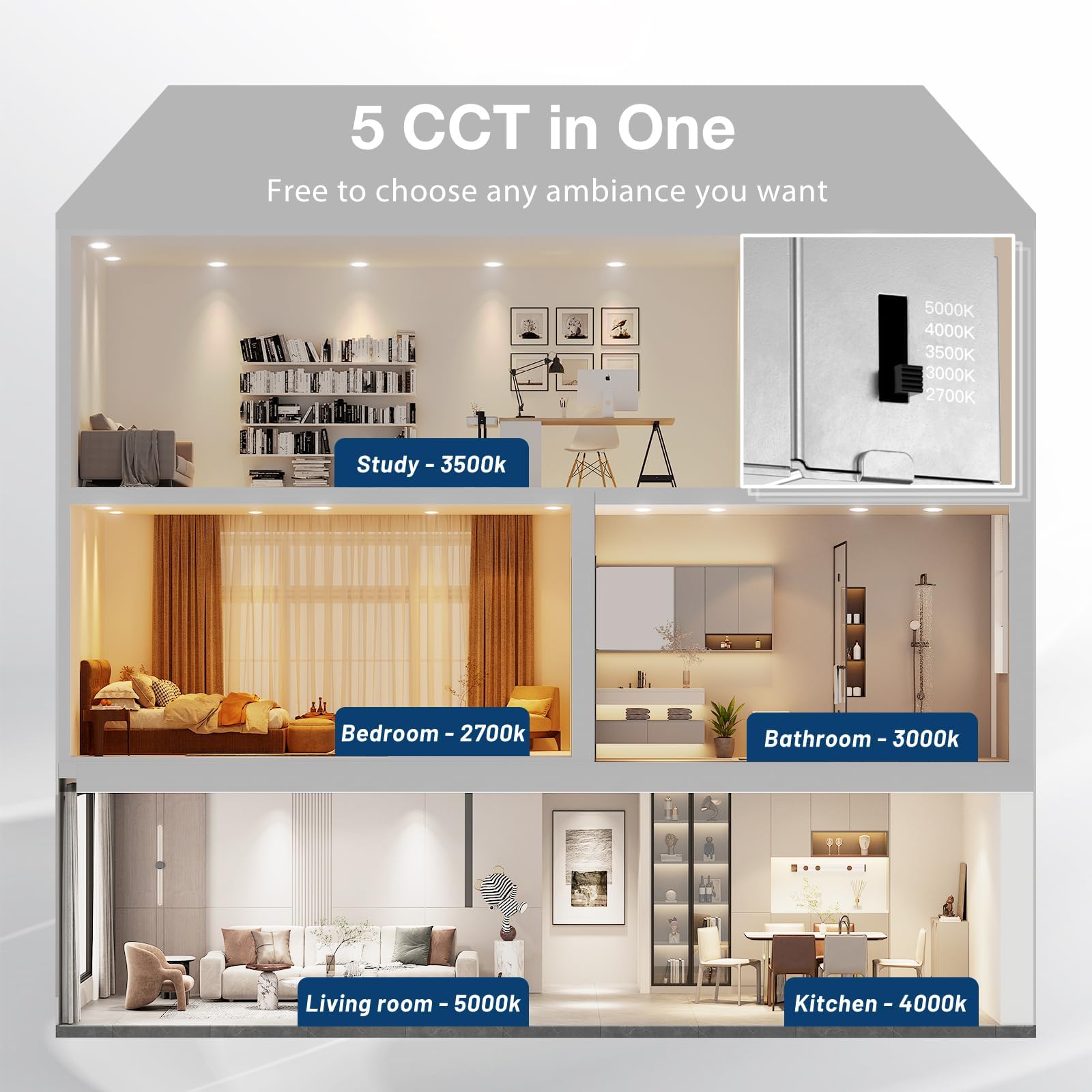 - 5 CCT-in-1: 5 color temperature(2700K, 3000K, 3500K, 4000K, 5000K) is selectable to you, which successfully eliminates the hassle of returning or exchange products due to inappropriate color temperature. Just slide the switch on the side of the J-box and you will get the most-desired color that best fit in your room type.