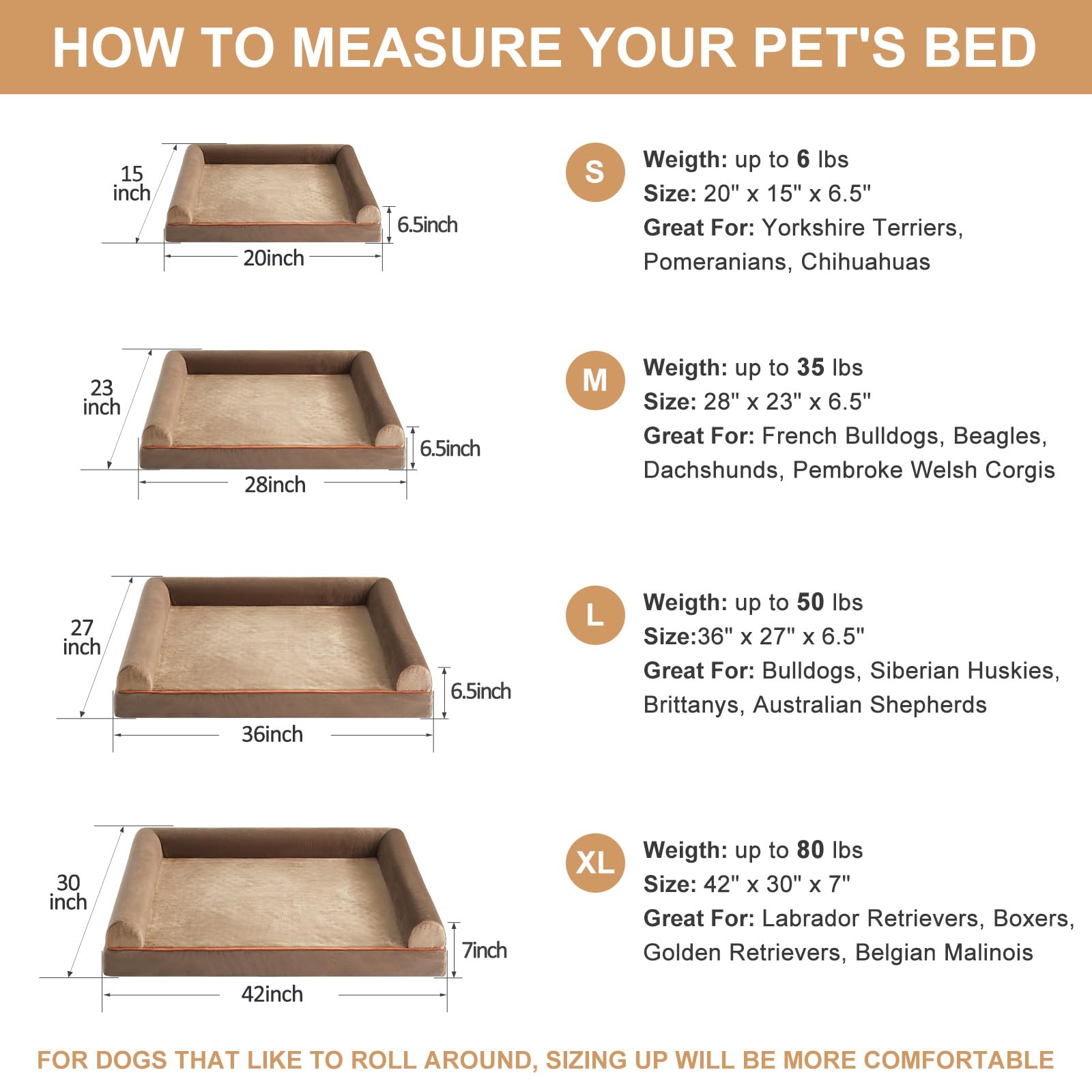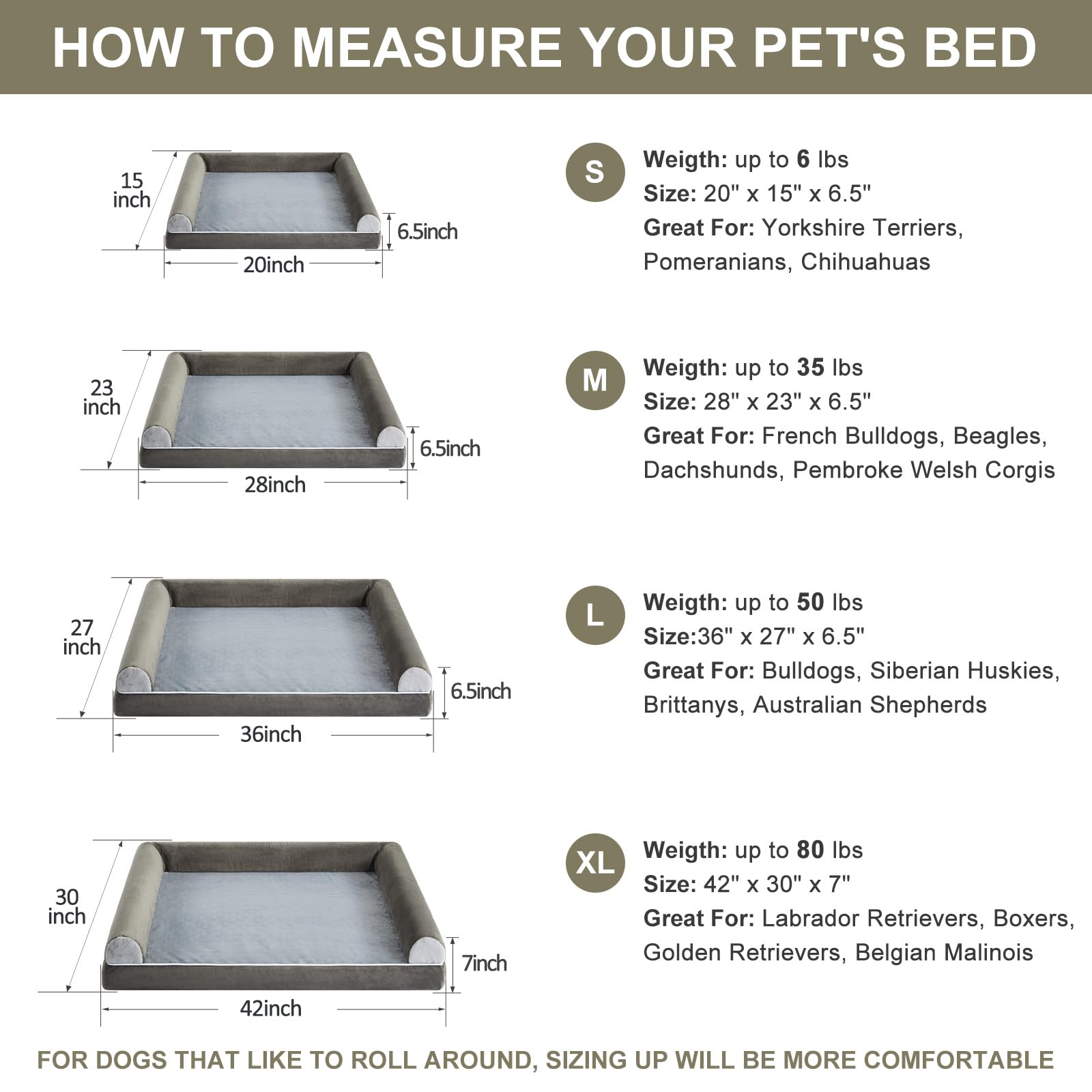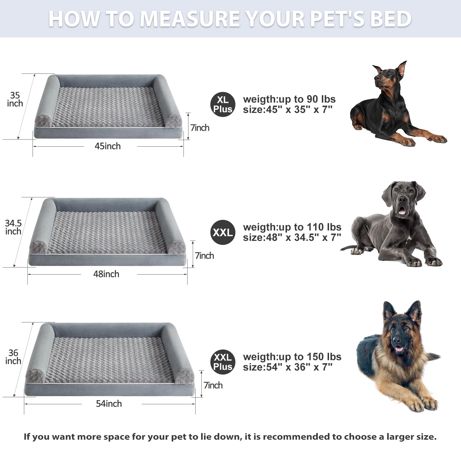 - DIMENSIONS (DOG BEDS FOR LARGE DOGS): The size of large dog bed is 36" x 27" x 6.5" (3.5" bolstered side ), large dog beds for medium or large dogs up to 50lbs. For dogs that like to roll around, sizing up will be more comfortable.