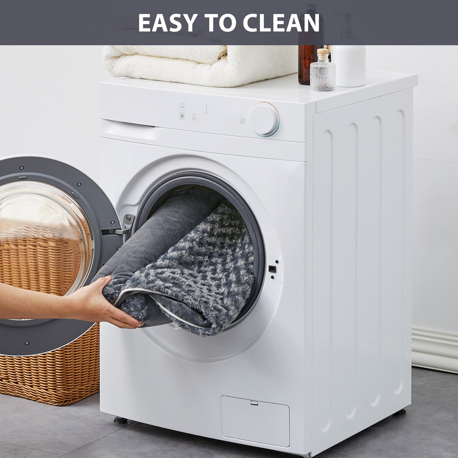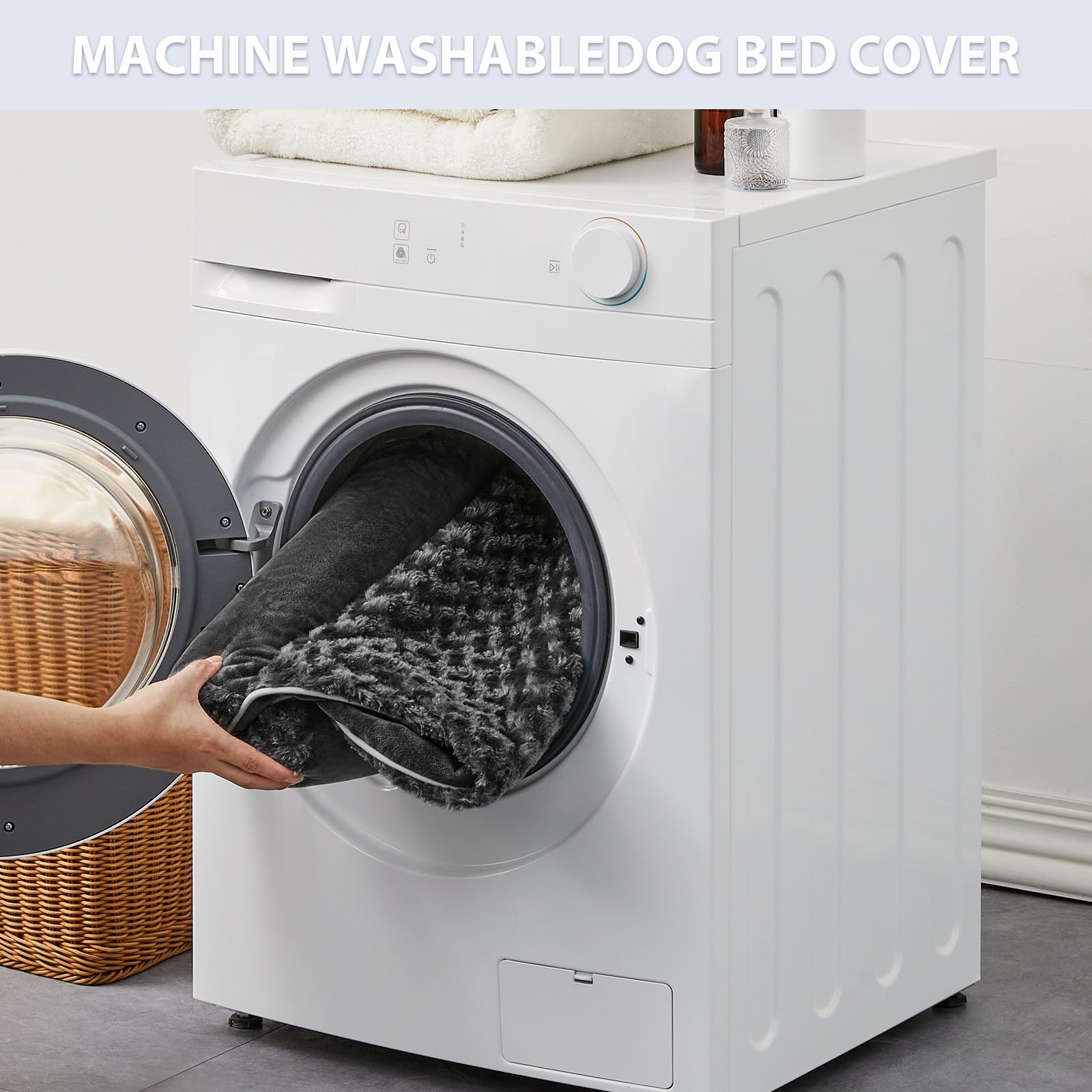 The surface of the main dog bed features a luxurious wool circle short plush that provides a calming and anti-anxiety sensation.