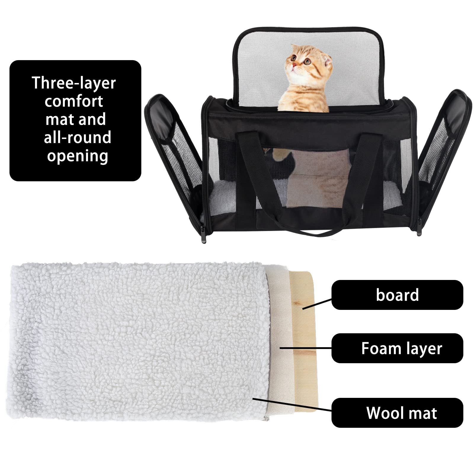 - [PORTABLE AND FOLDABLE] Pet travel carrier comes with a detachable and hand washable wool pet bed, it can provide a comfortable sleeping space for your traveling pet. The cat travel case comes with an adjustable shoulder strap and handle for easy portability. When not in use, you can fold it up for storage.