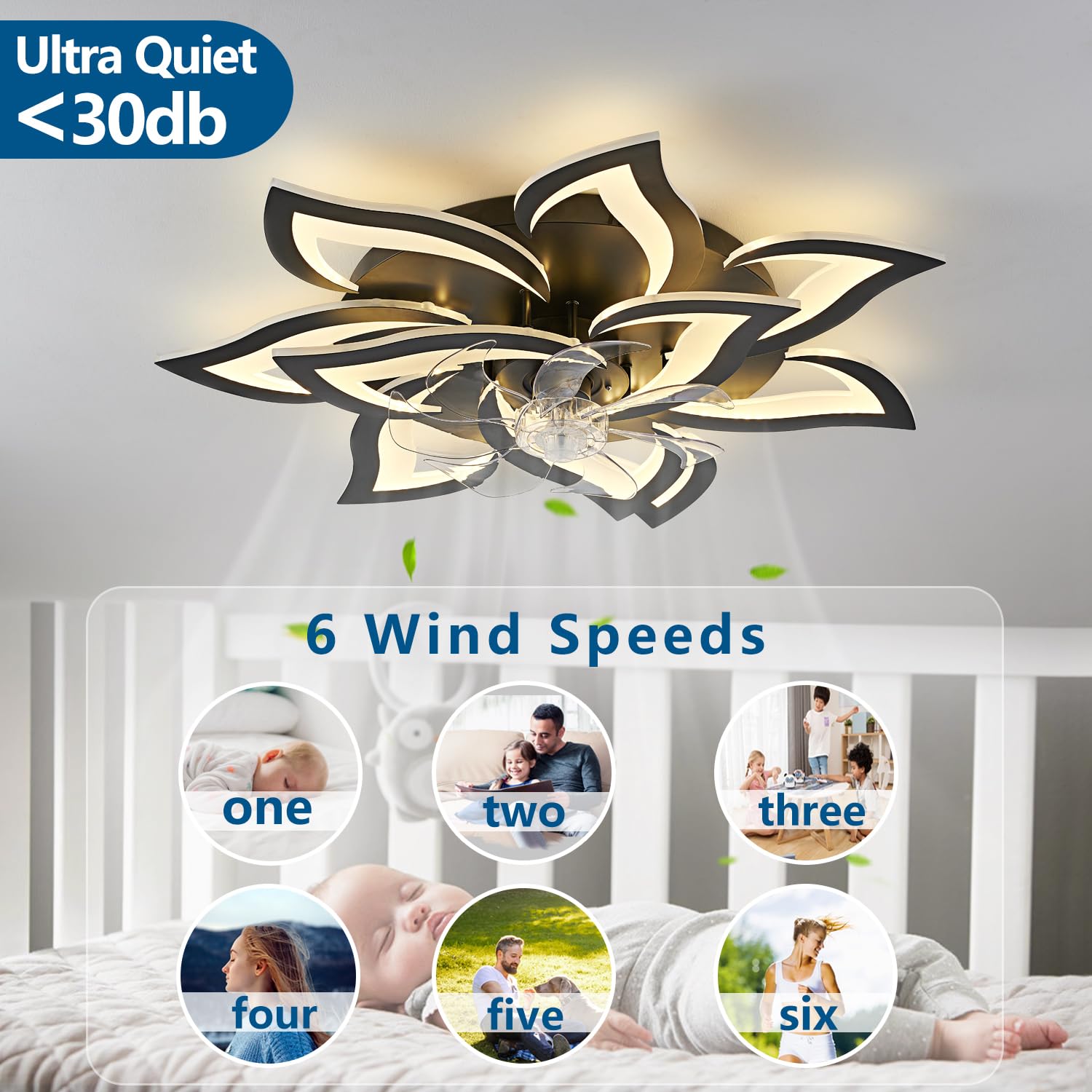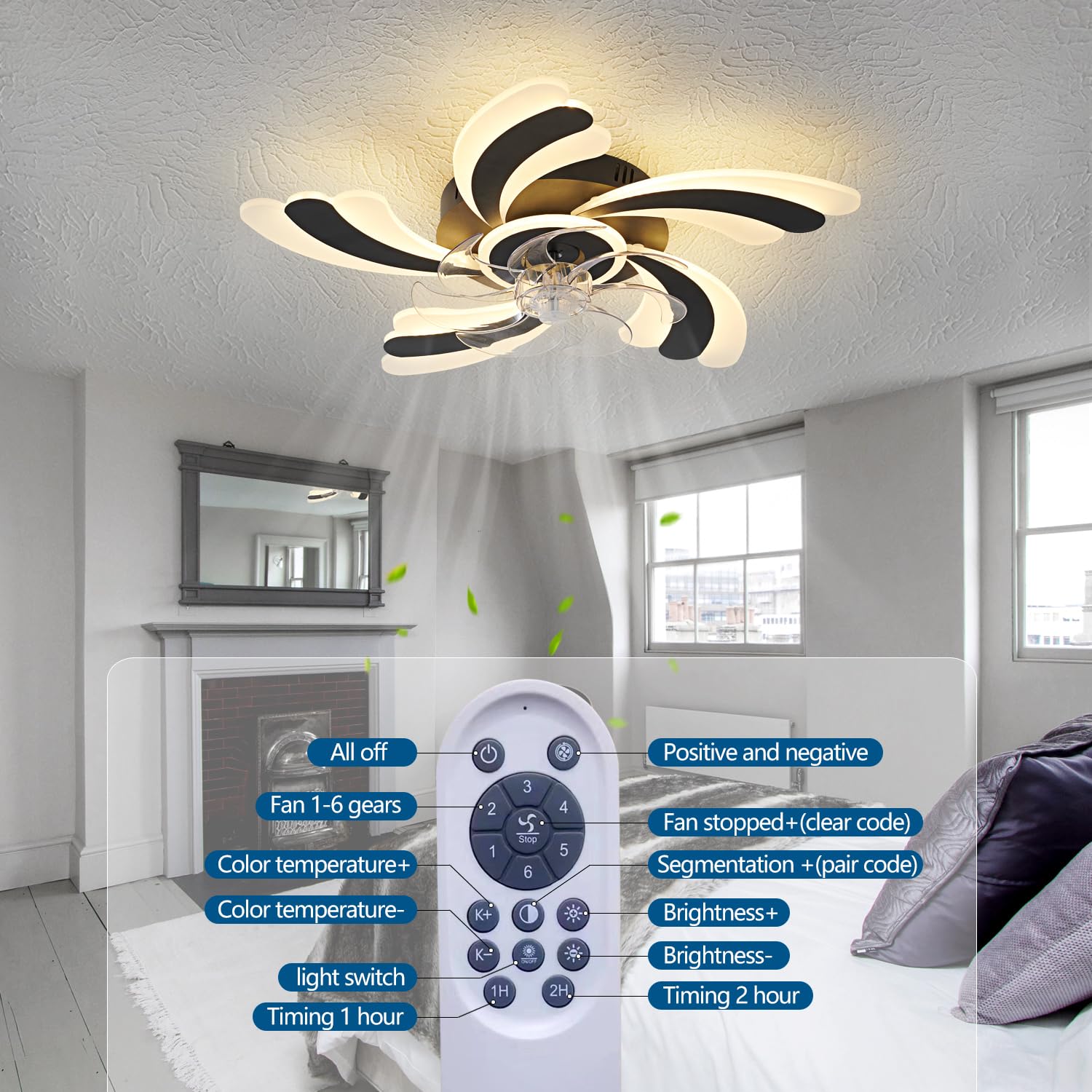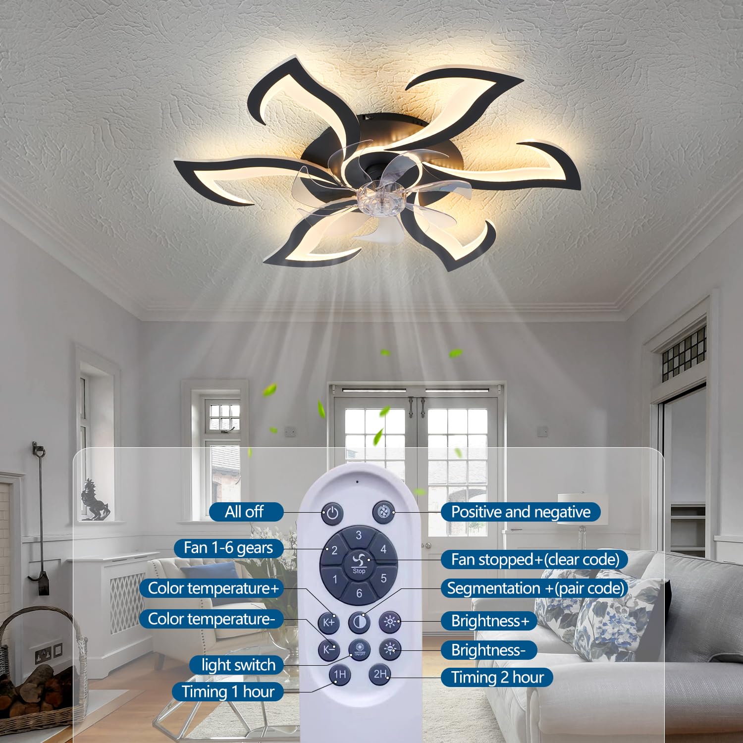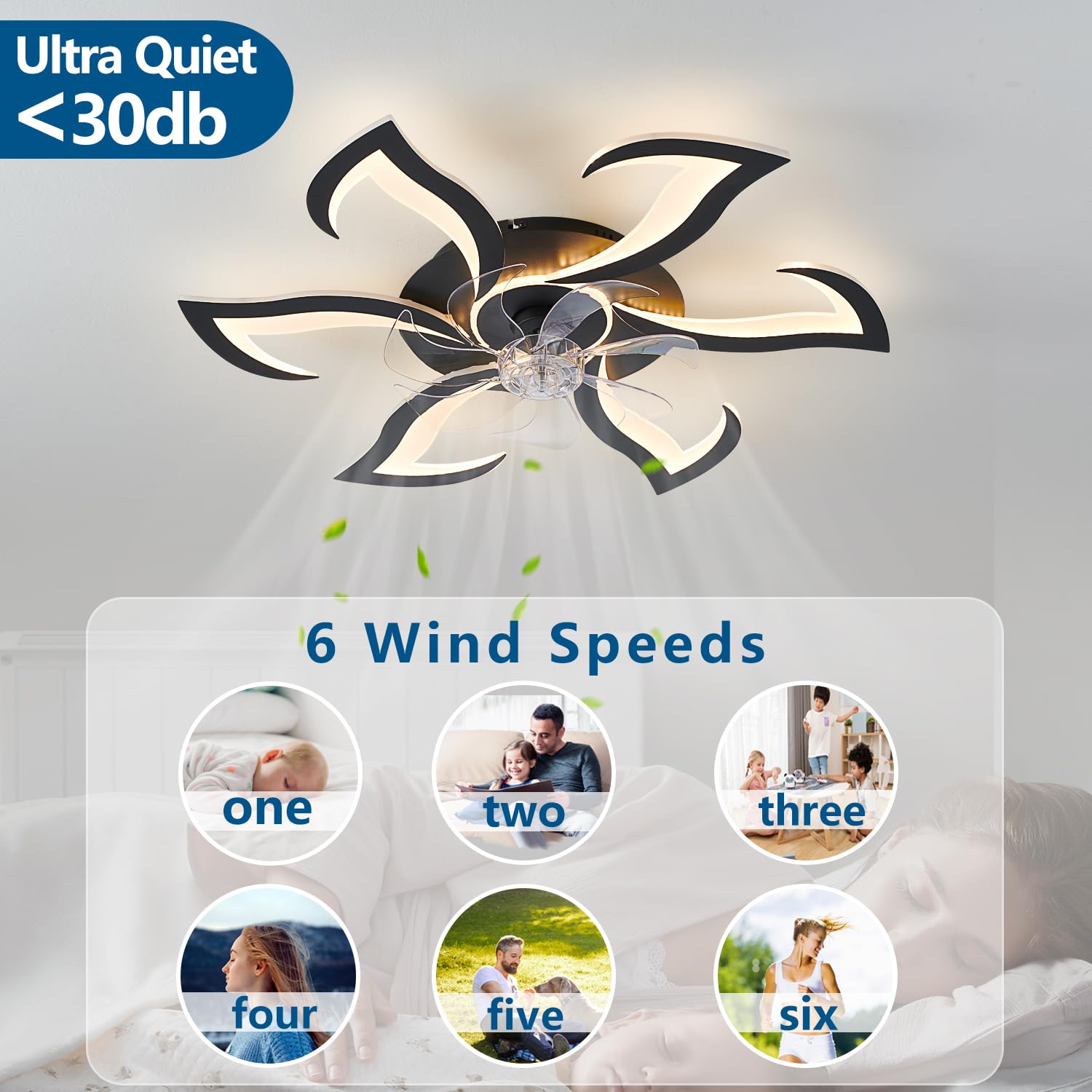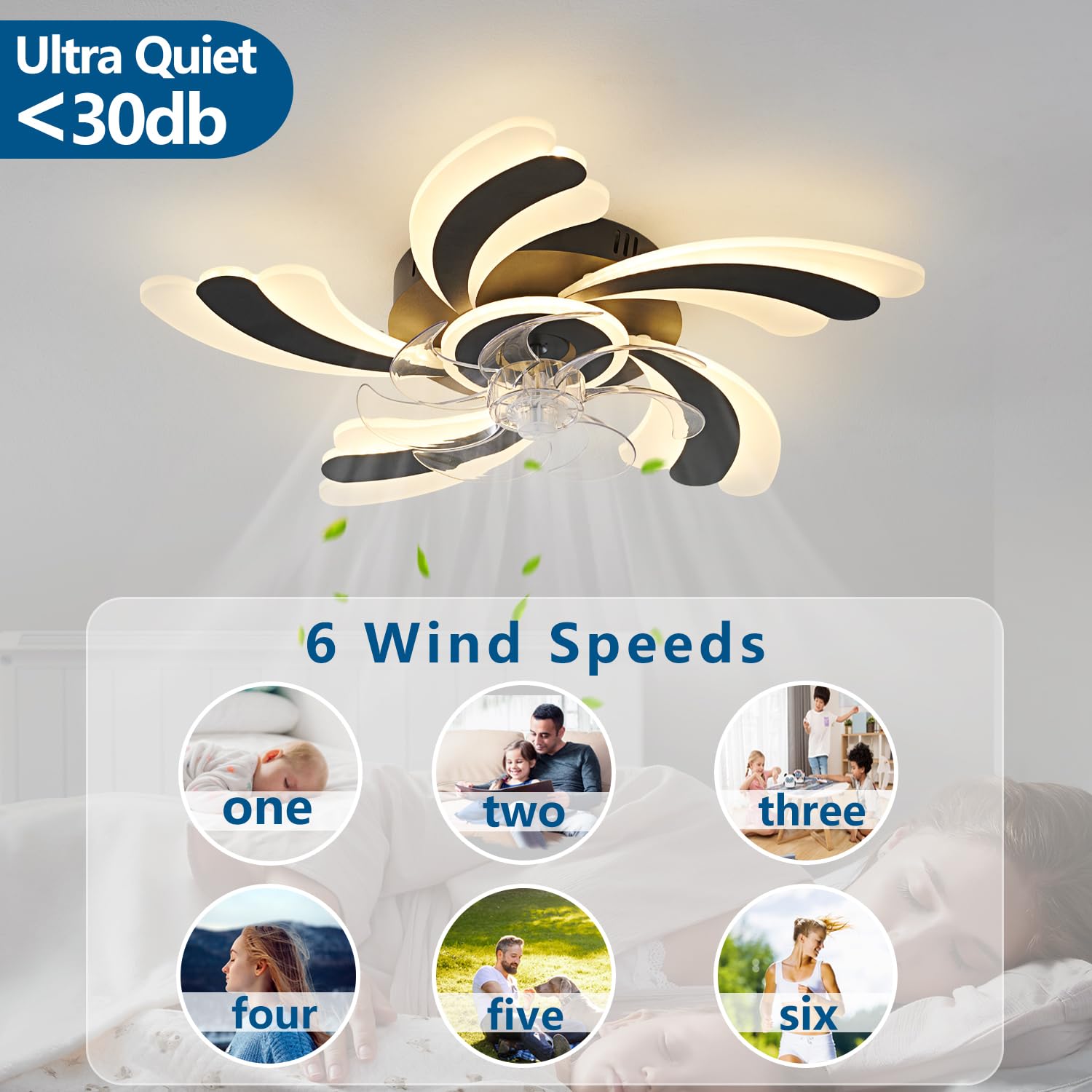 Ceiling Fan with Lights Remote Control, 24" Black, 6 Speeds 3 Light Color Low Profile Flush Mount Ceiling Fan for Kitchen Bedroom