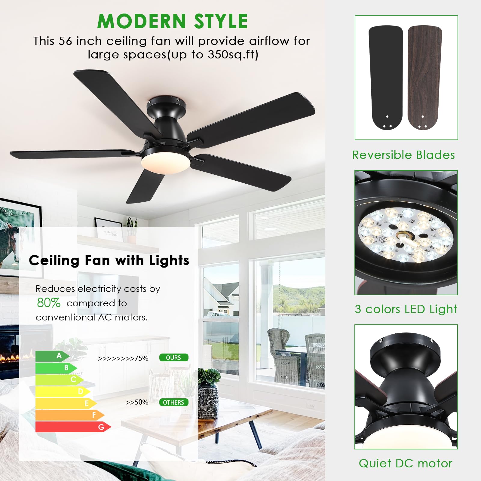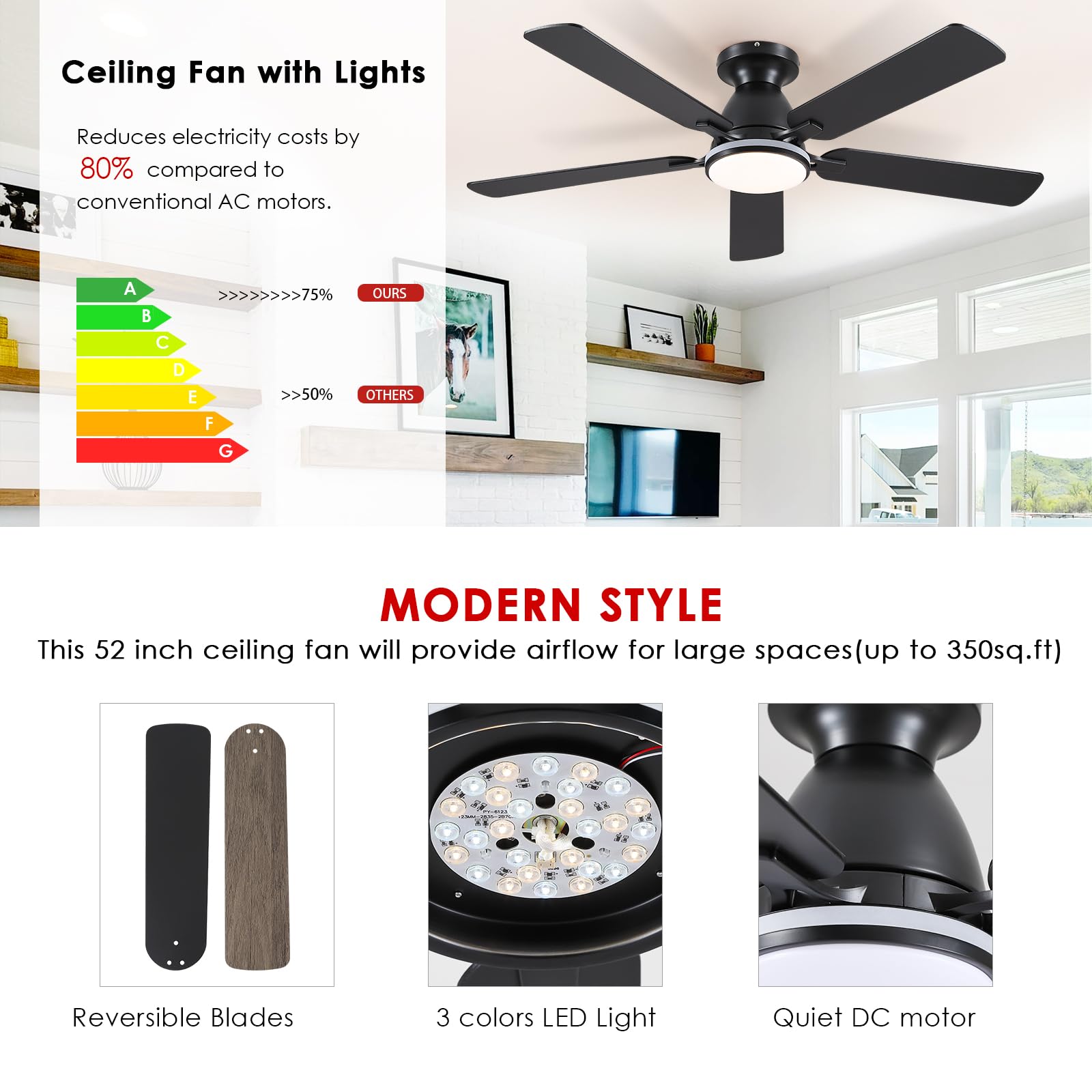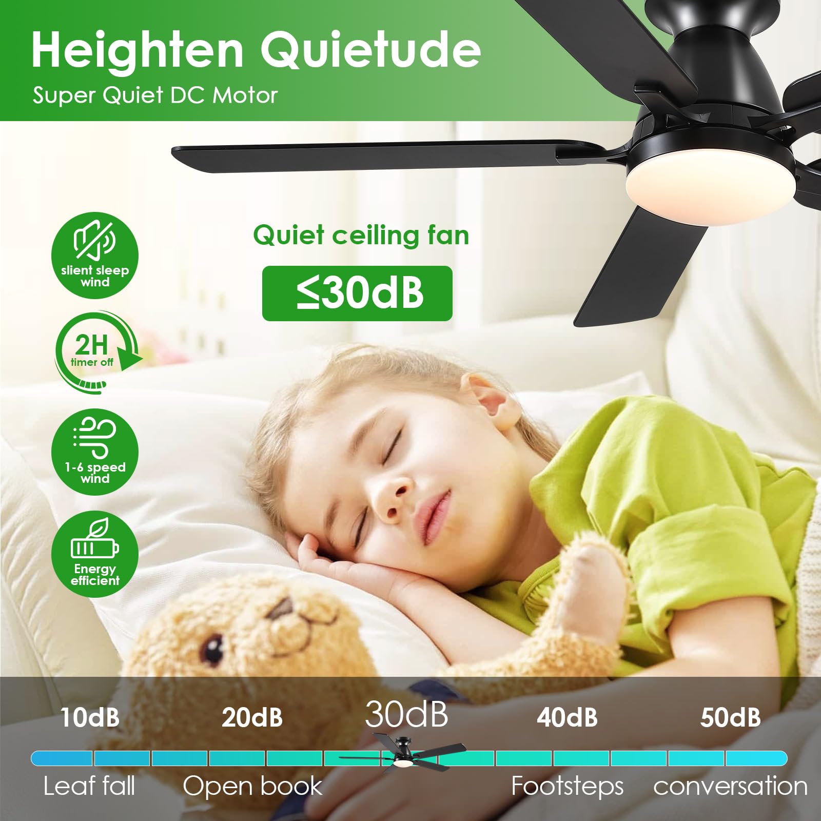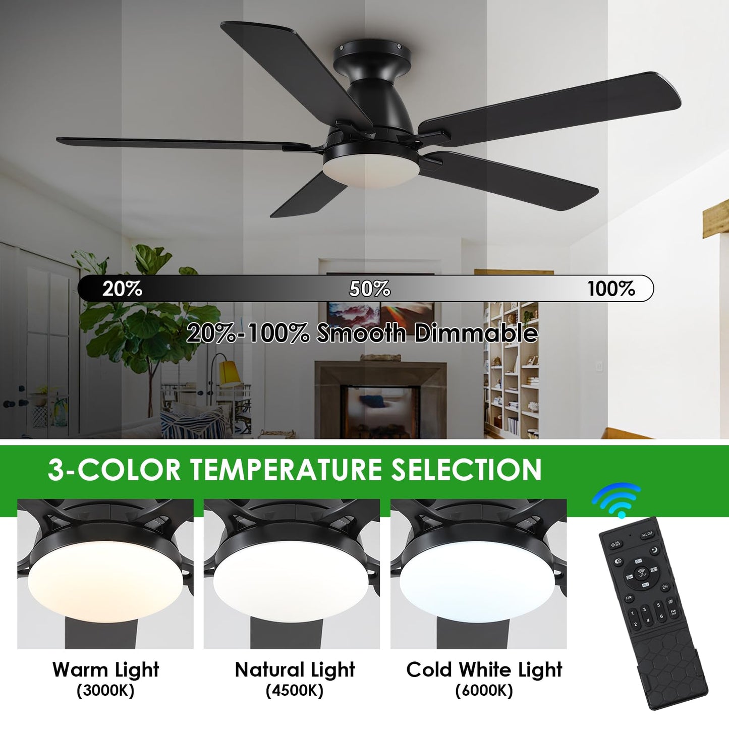 Ceiling Fans with Lights- 46" Low Profile Indoor Ceiling Fan with Light and Remote/APP Control, Flush Mount, LED Dimmable DC Reversible Modern Ceiling Fan for Bedroom(Black)