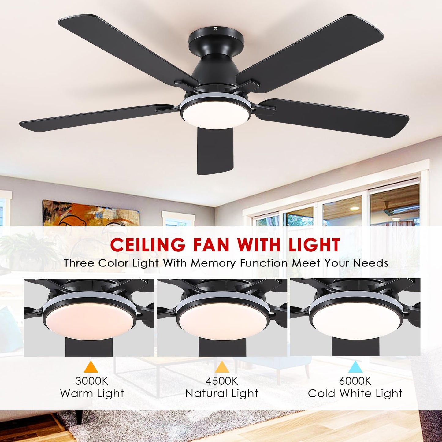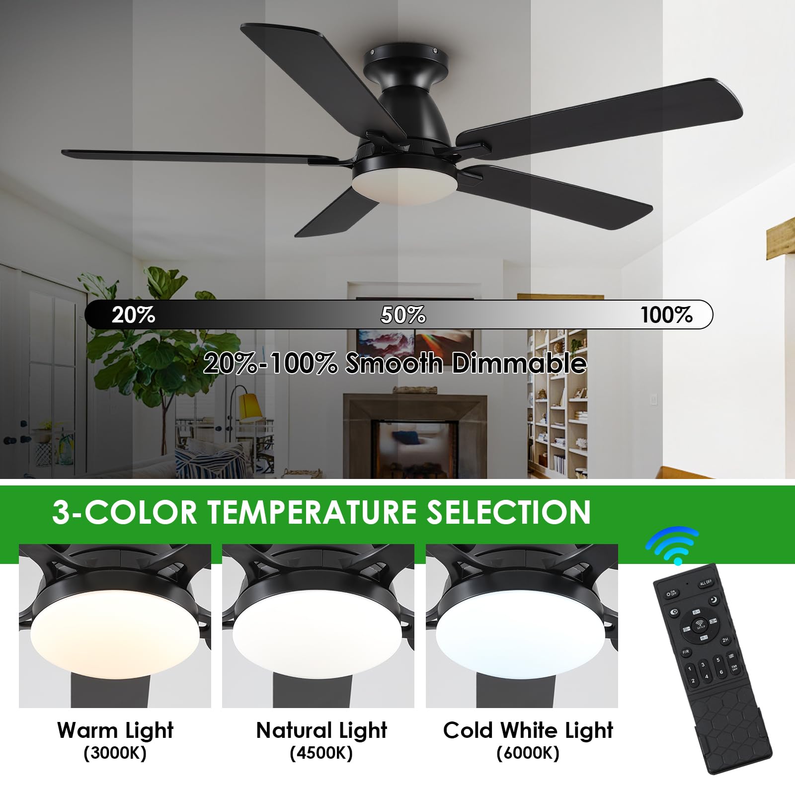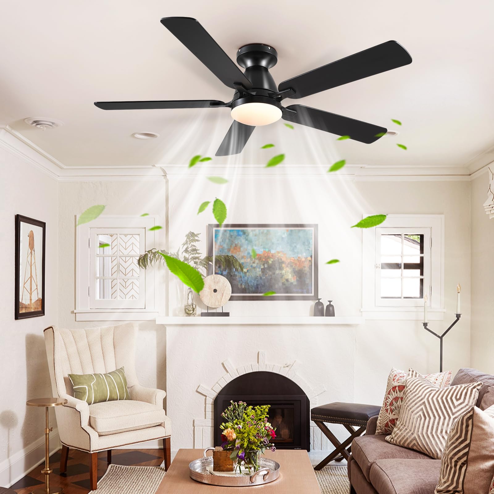 Ceiling Fans with Lights- 52" Low Profile Indoor Ceiling Fan with Light and Remote/APP Control, Flush Mount, LED Dimmable DC Reversible Modern Ceiling Fan for Bedroom(Black)