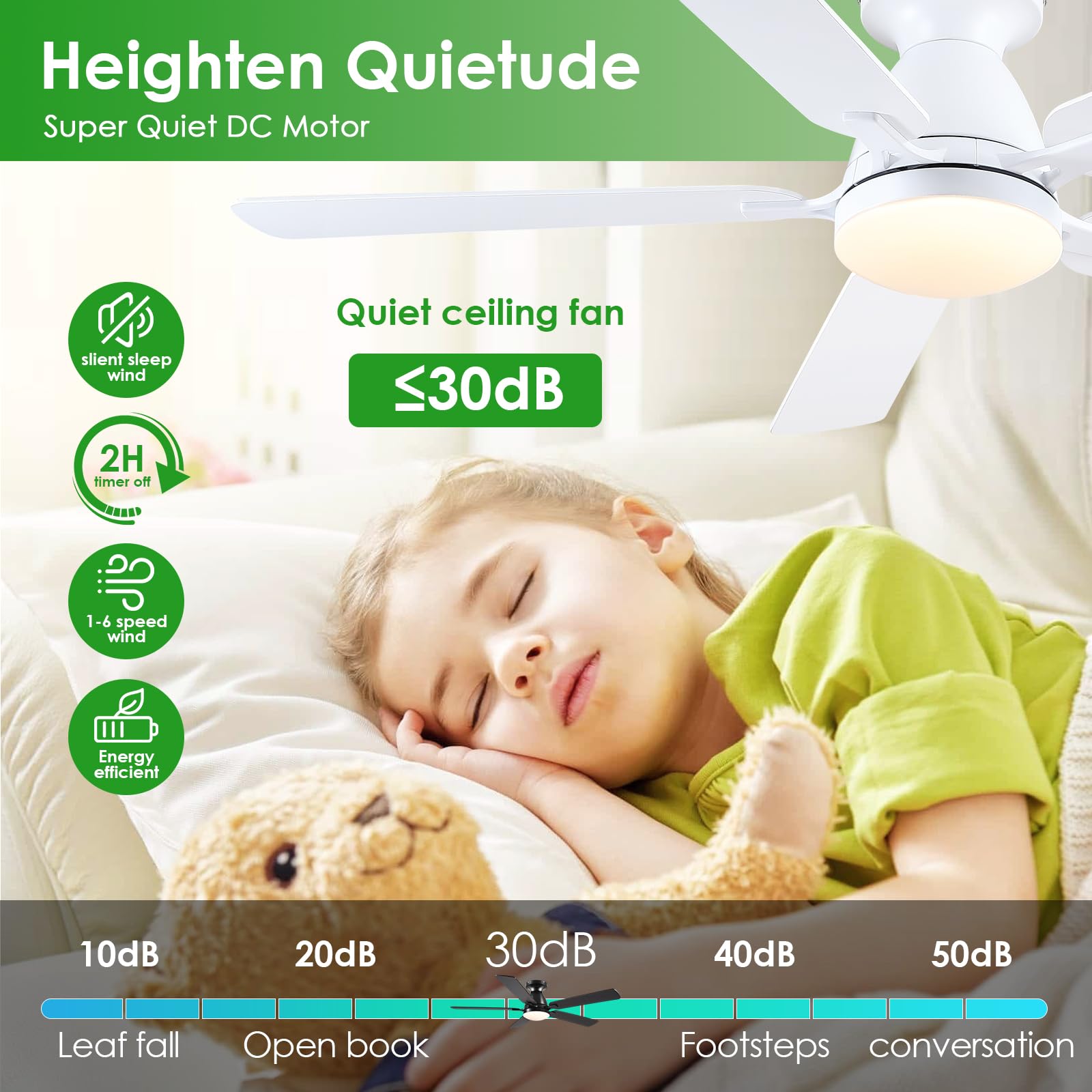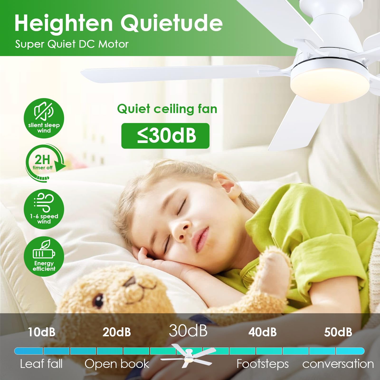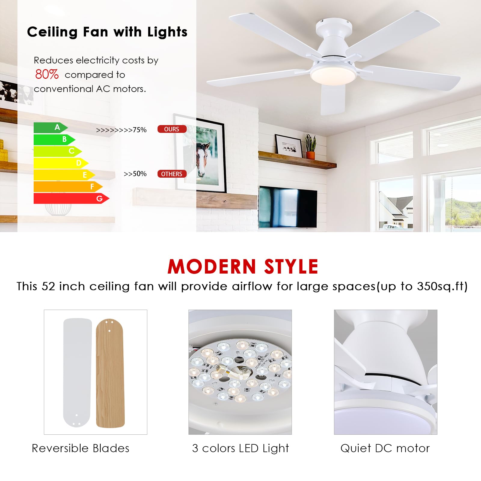 Ceiling Fans with Lights- 52" Low Profile Indoor Ceiling Fan with Light and Remote/APP Control, Flush Mount, LED Dimmable DC Reversible Modern Ceiling Fan for Bedroom(Black)