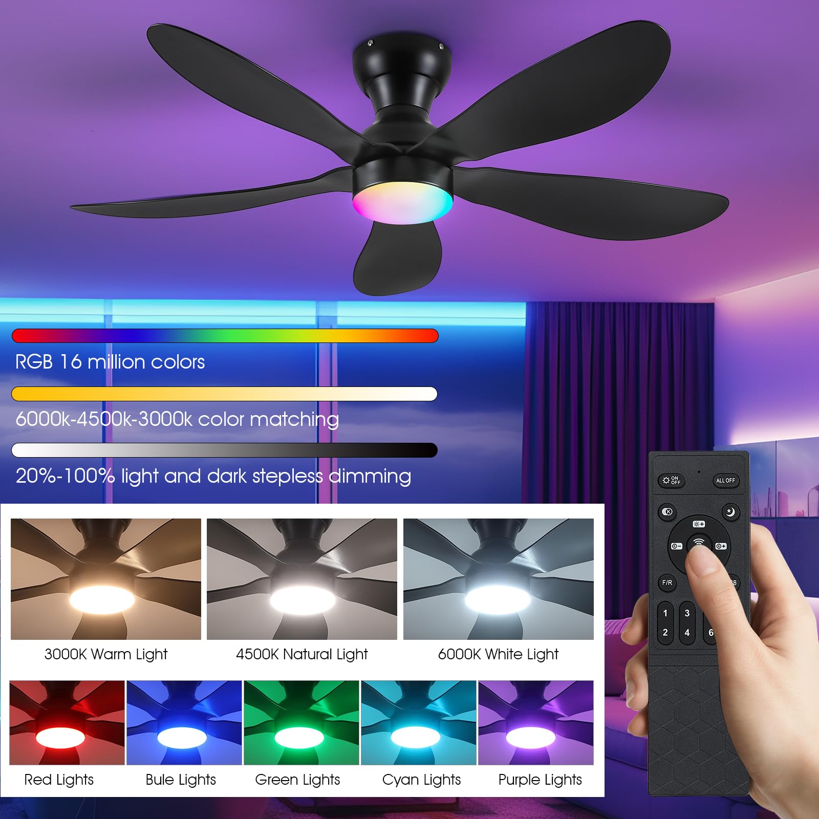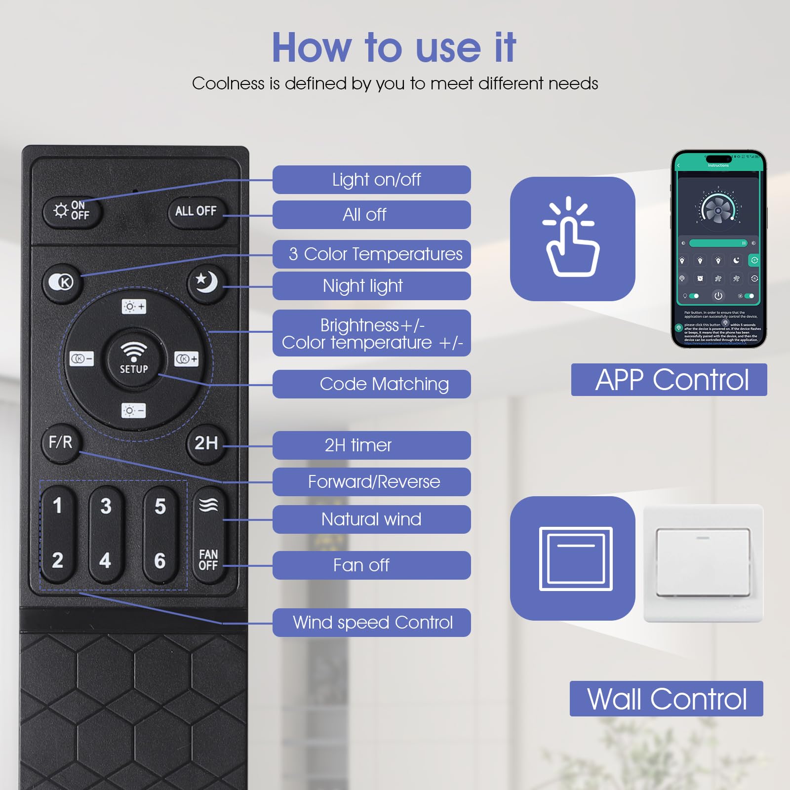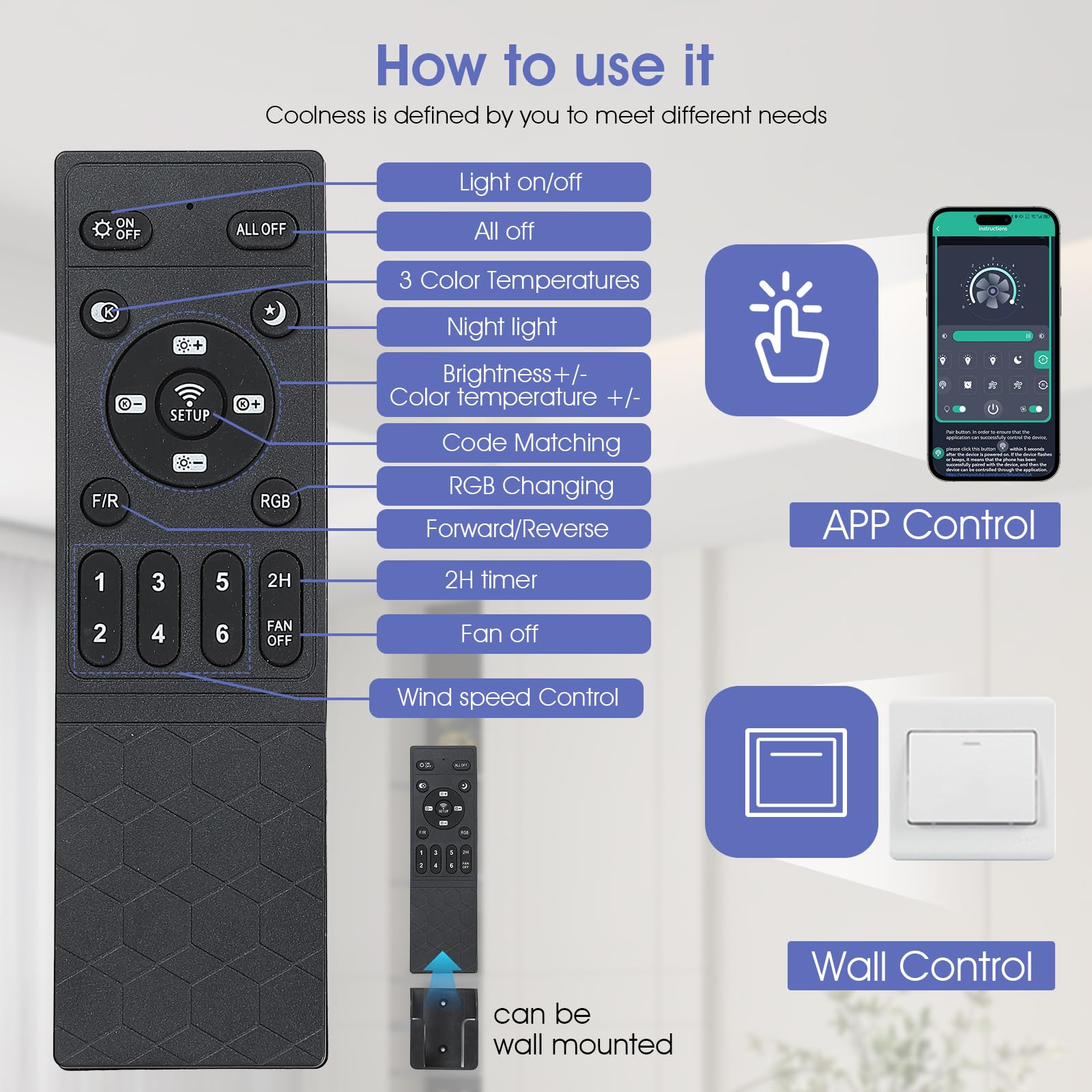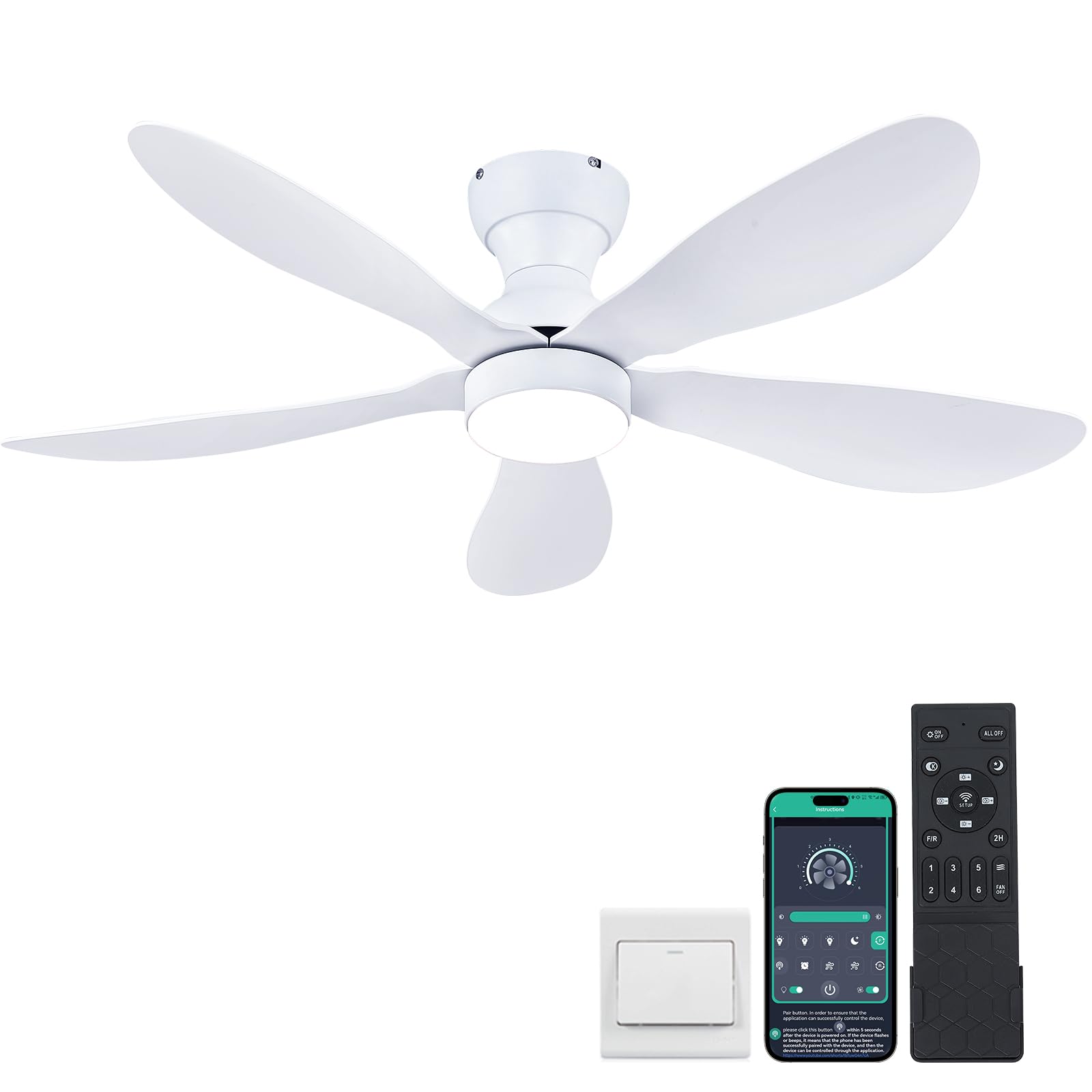 - 【Remote Control & APP control】The remote control comes with almost all the functions you need, including 6-speed wind speed, 3-color temperature and endless dimming, one-click on night light mode, 2-hour timing off, separate off lights or fans, and so on; You can also scan the QR code on the manual, download the APP and pair it to control the fan light from your phone; Easily adapt to any scene needs, the ideal replacement for traditional fans or chandeliers.