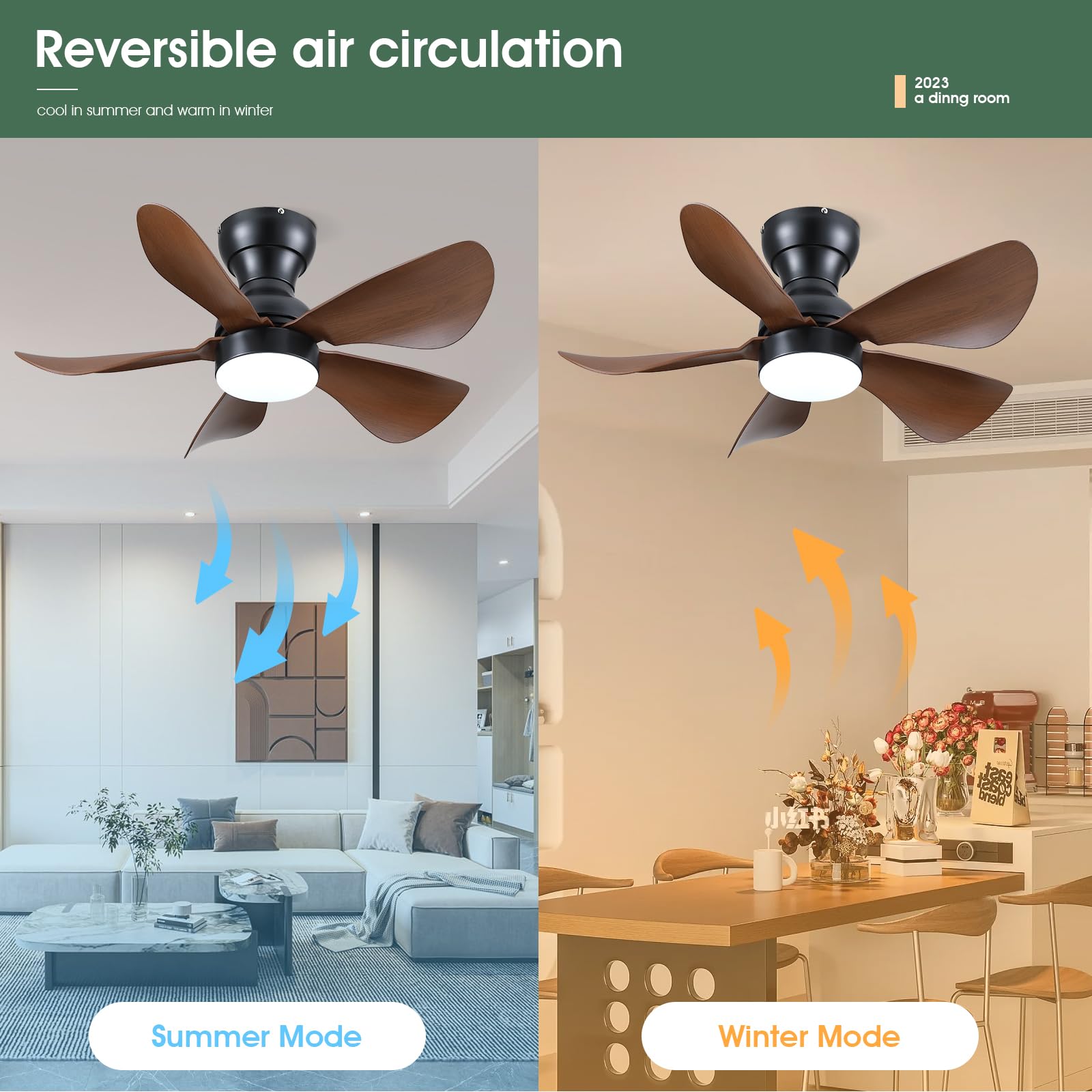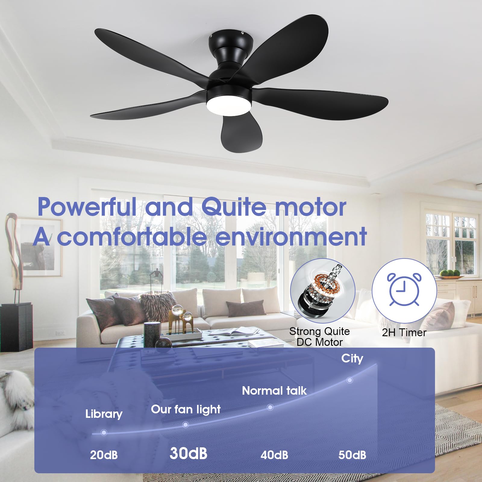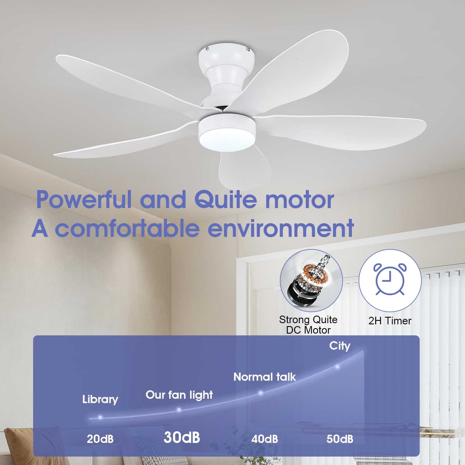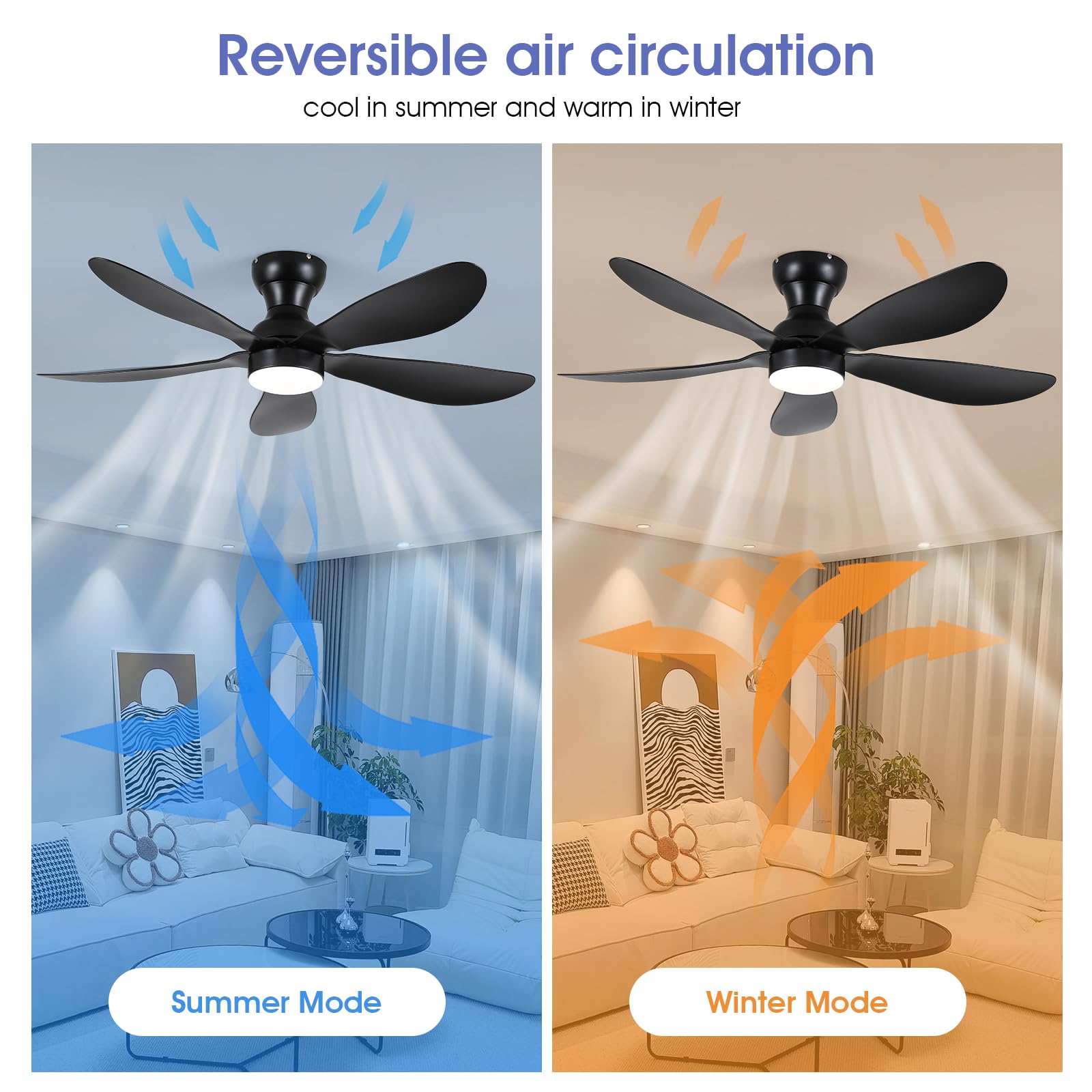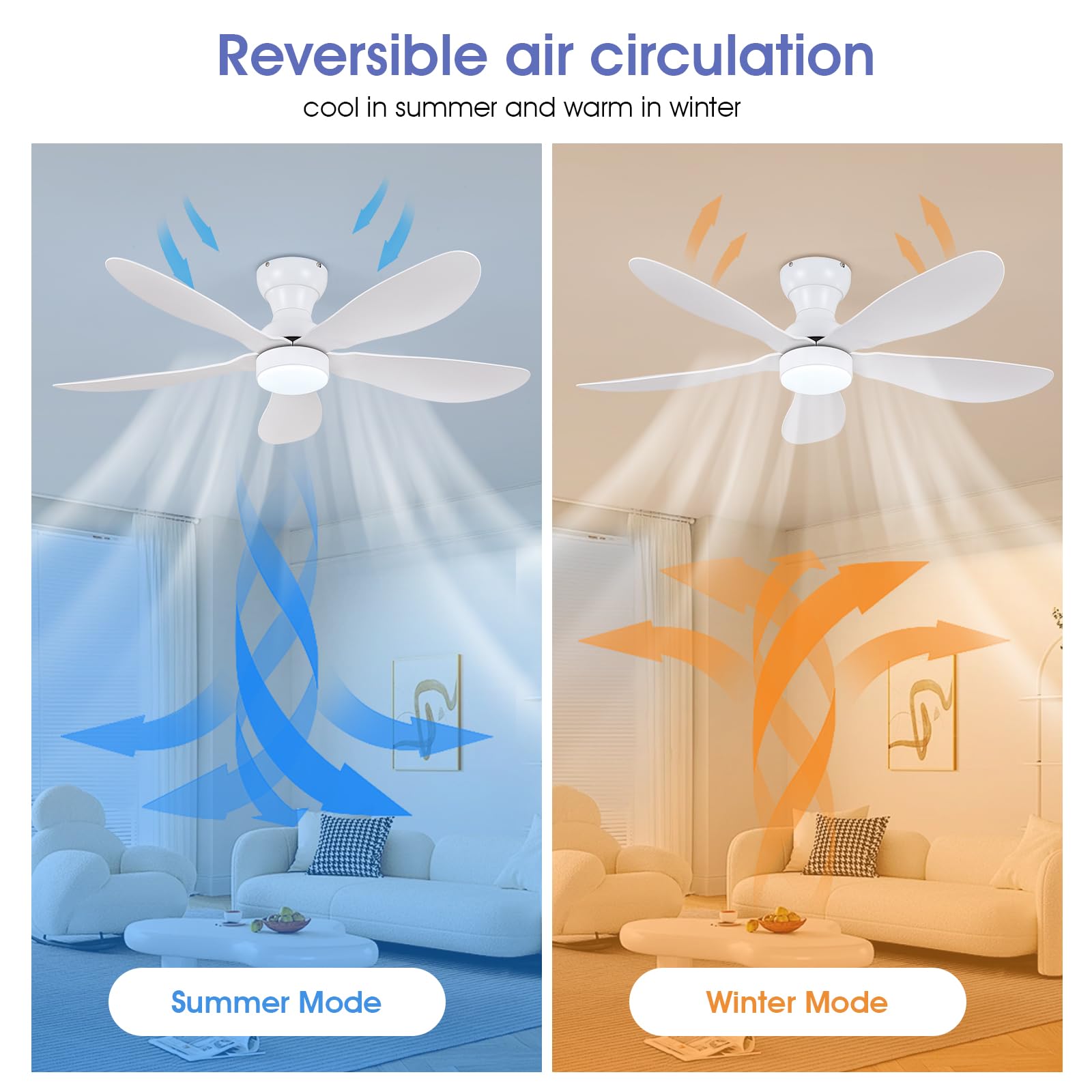 - 【Reversible DC Motor】By pressing the F/R key on the remote control, you can switch the wind direction of the ceiling fan from the downdraft in summer to the updraft in winter, thus recovering the heat lost by the ceiling and distributing the heat evenly throughout the room; Compared with traditional AC motors, it is more energy efficient, more silent, and the noise level is less than 30 dB.