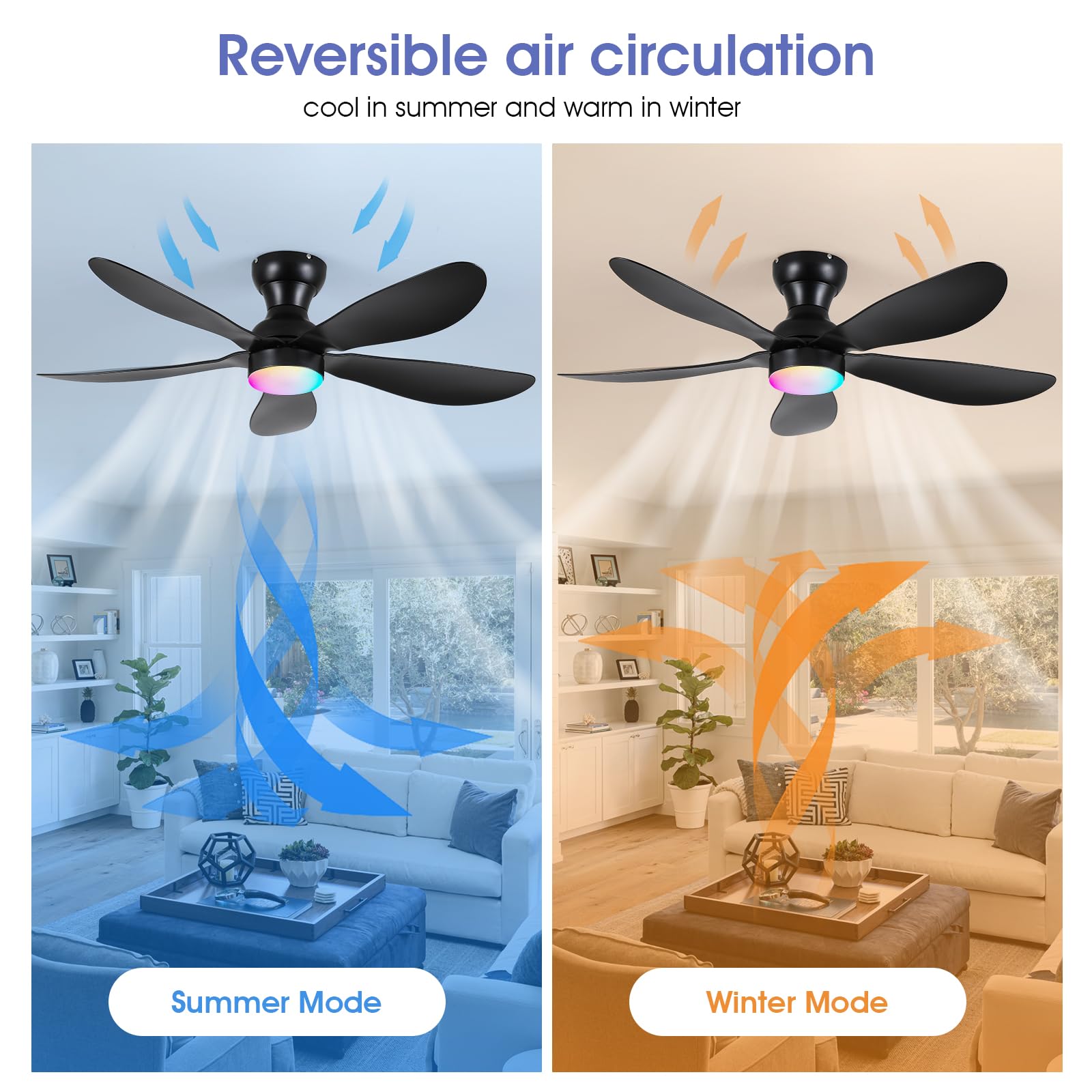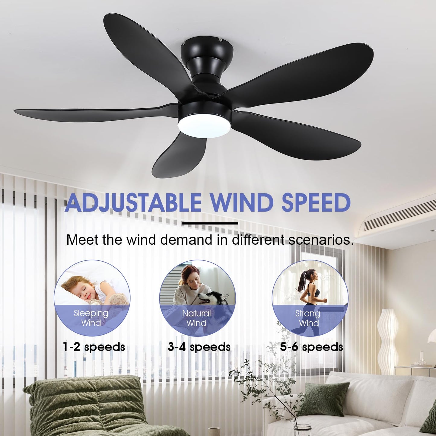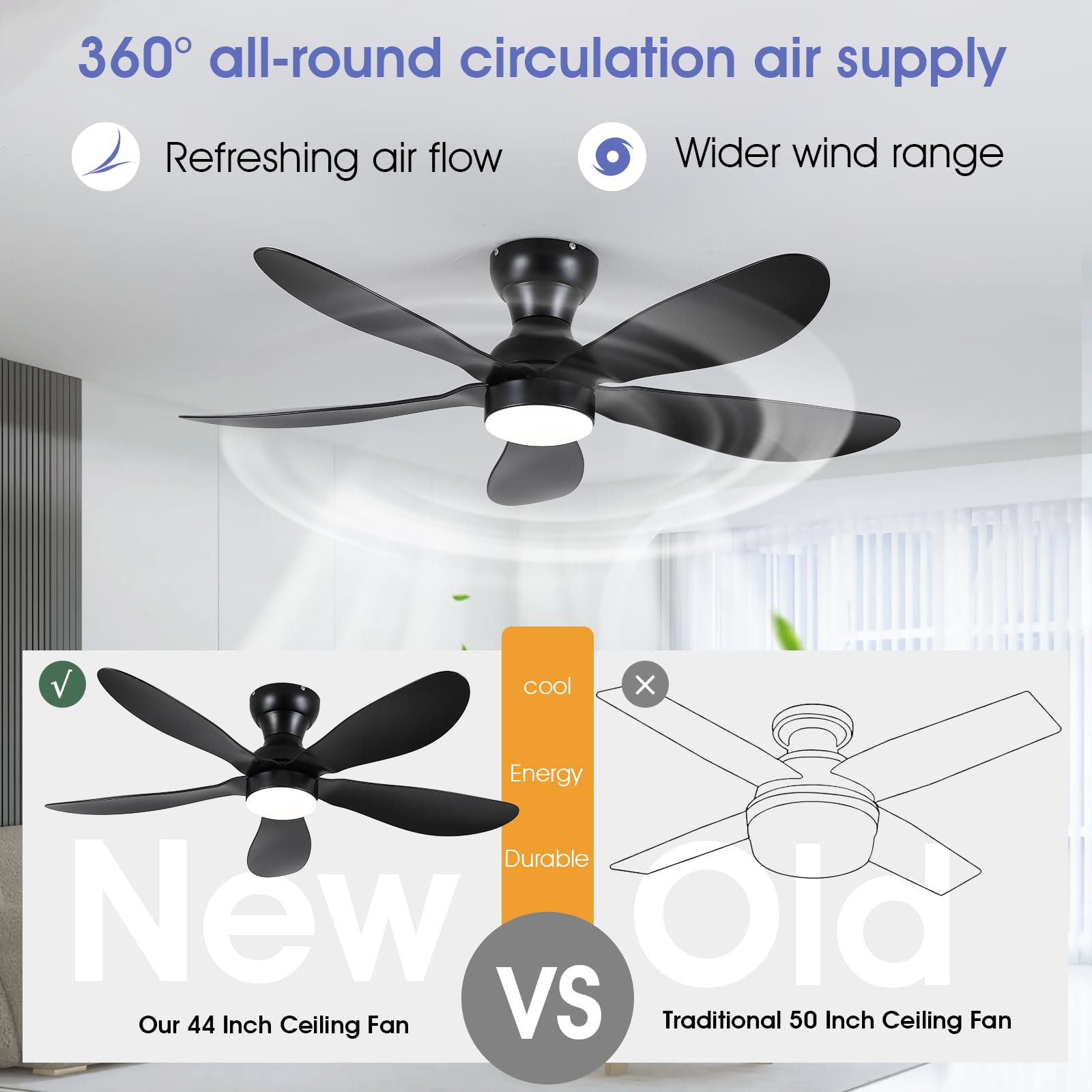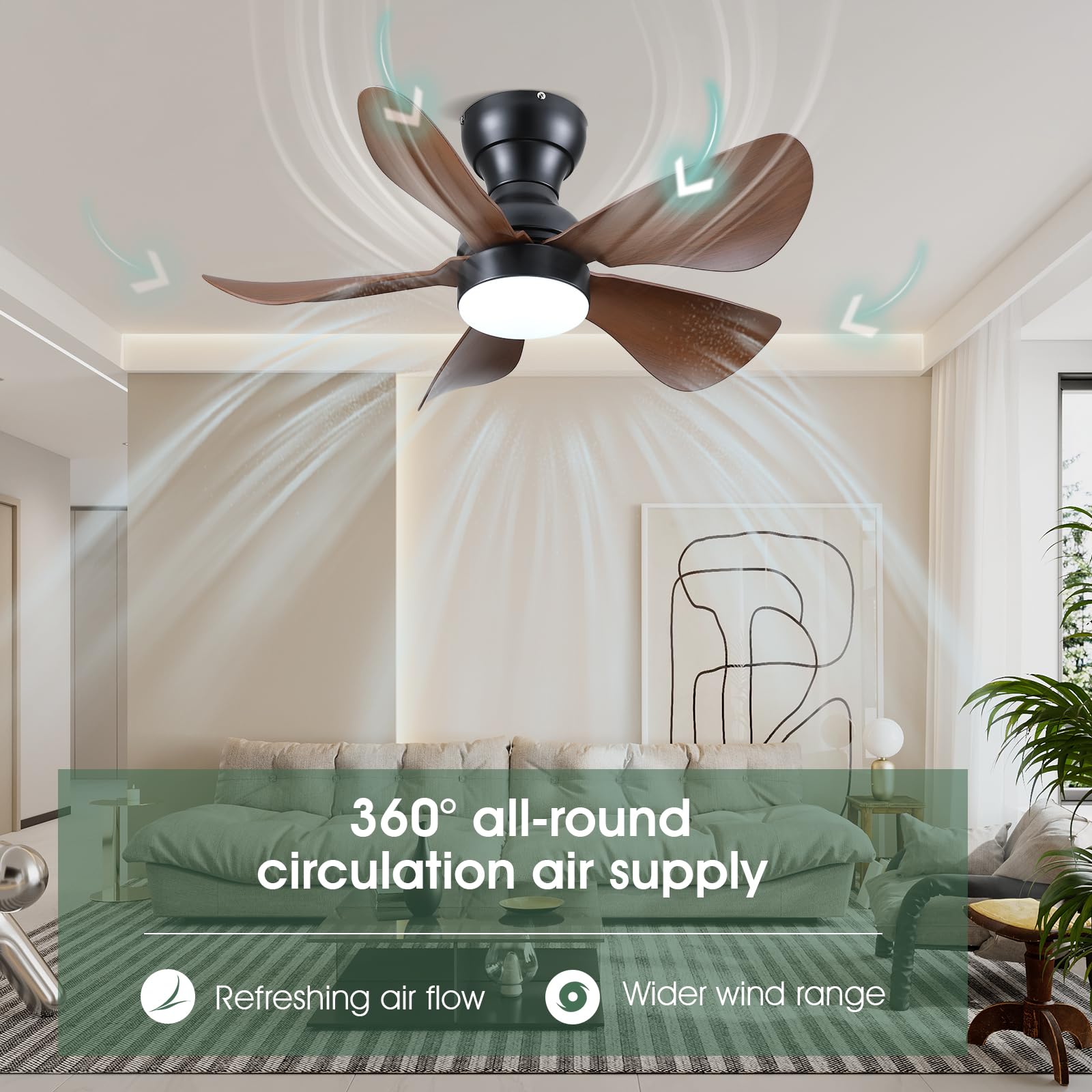 - 【Reversible DC Motor】By pressing the F/R key on the remote control, you can switch the wind direction of the ceiling fan from the downdraft in summer to the updraft in winter, thus recovering the heat lost by the ceiling and distributing the heat evenly throughout the room; Compared with traditional AC motors, it is more energy efficient, more silent, and the noise level is less than 30 dB.