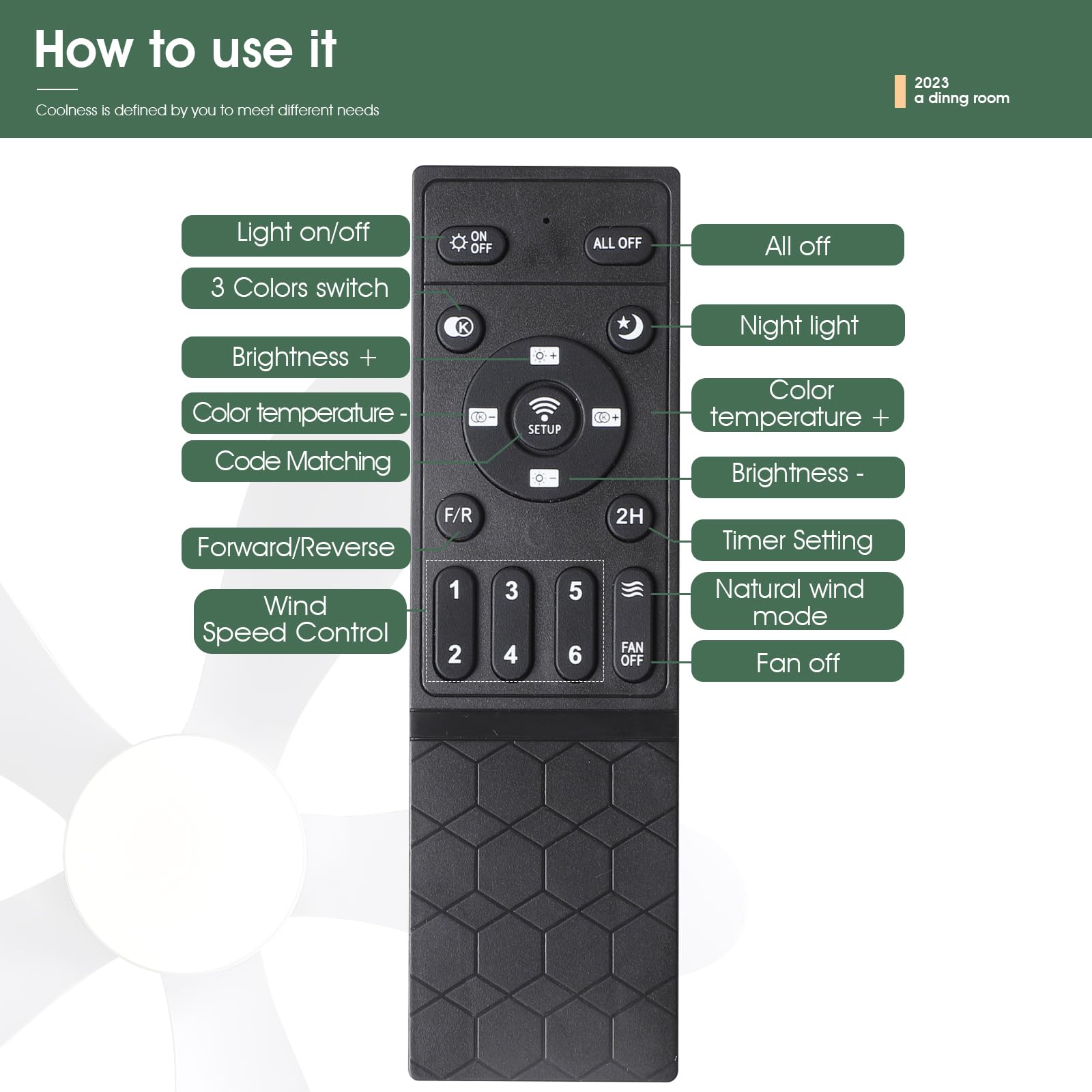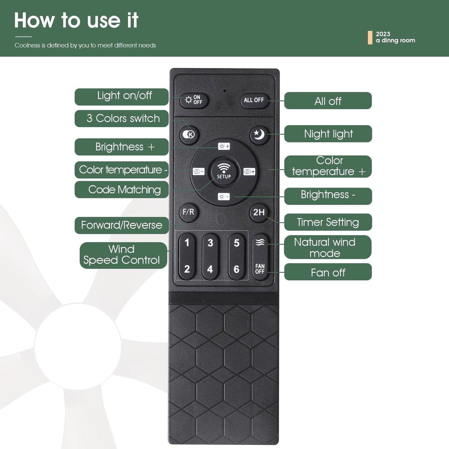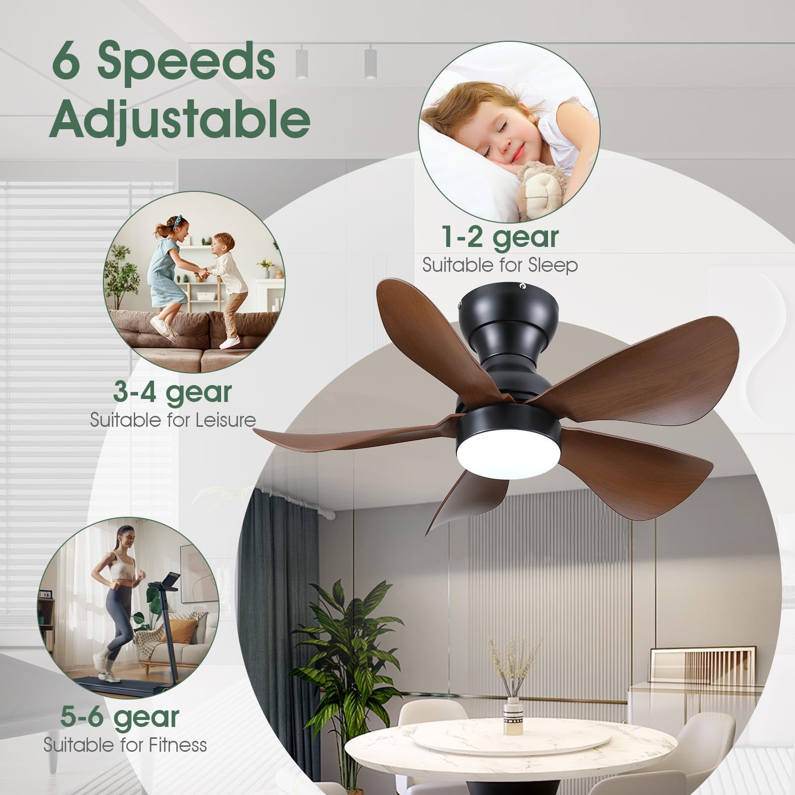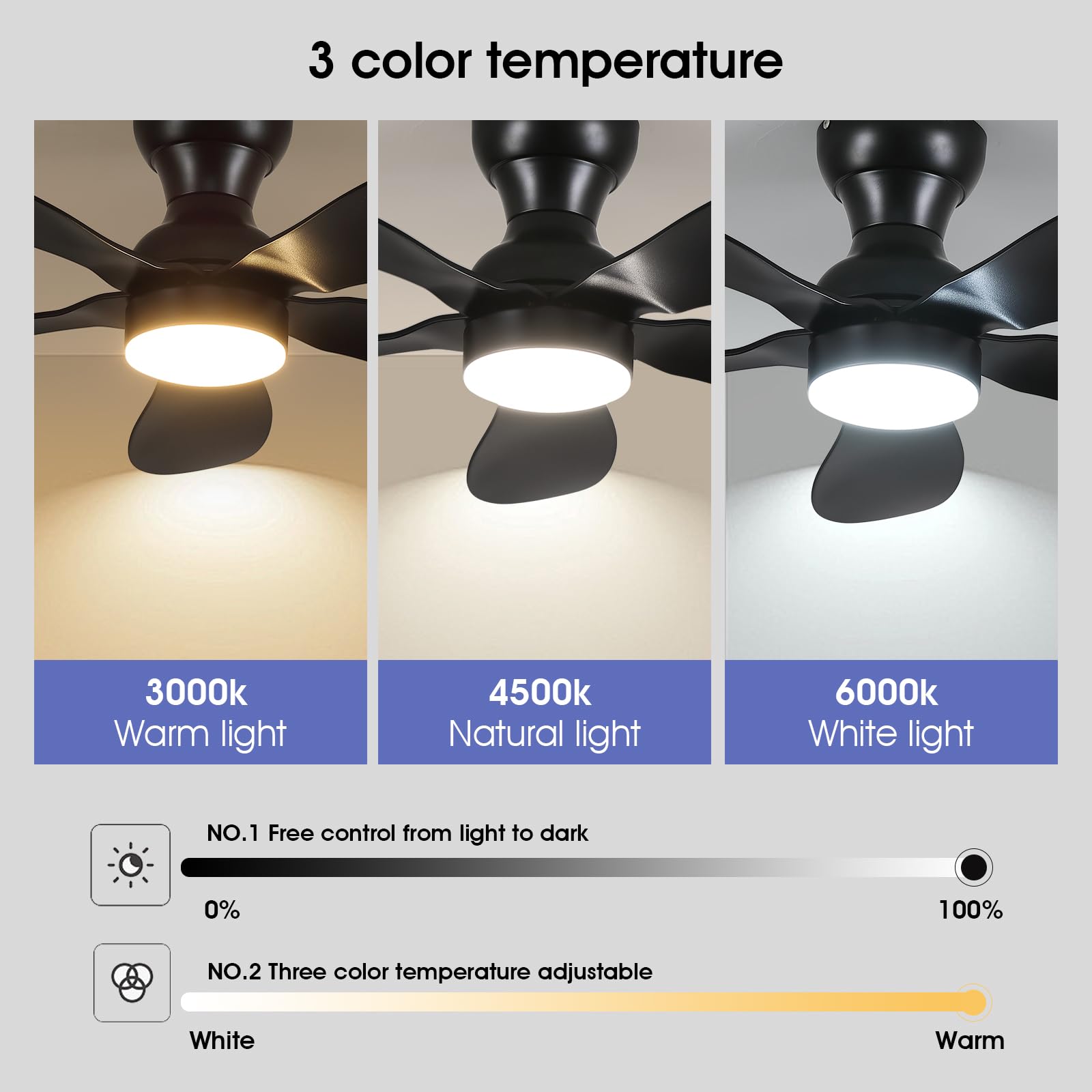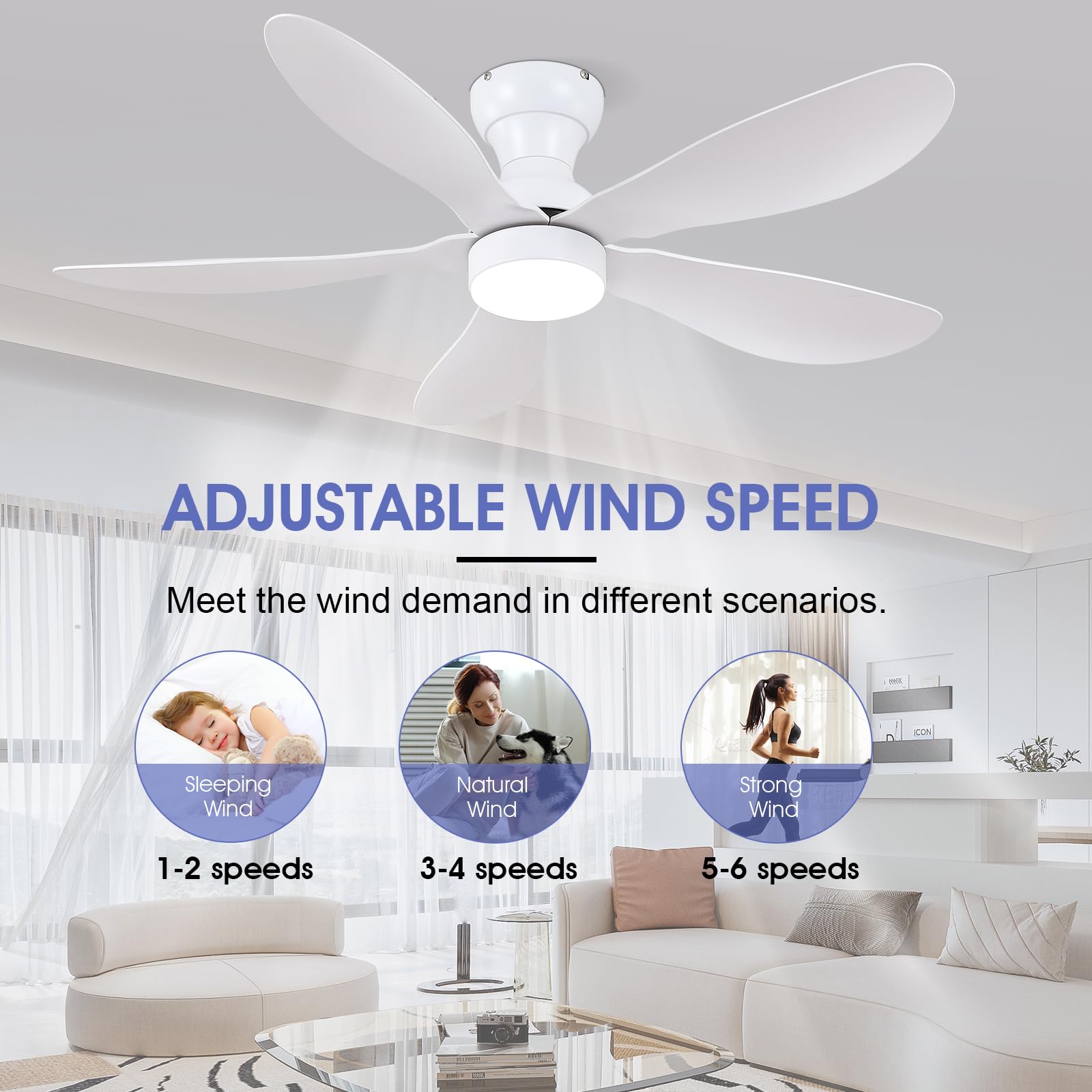 - 【Reversible DC Motor】By pressing the F/R key on the remote control, you can switch the wind direction of the ceiling fan from the downdraft in summer to the updraft in winter, thus recovering the heat lost by the ceiling and distributing the heat evenly throughout the room; Compared with traditional AC motors, it is more energy efficient, more silent, and the noise level is less than 30 dB.
