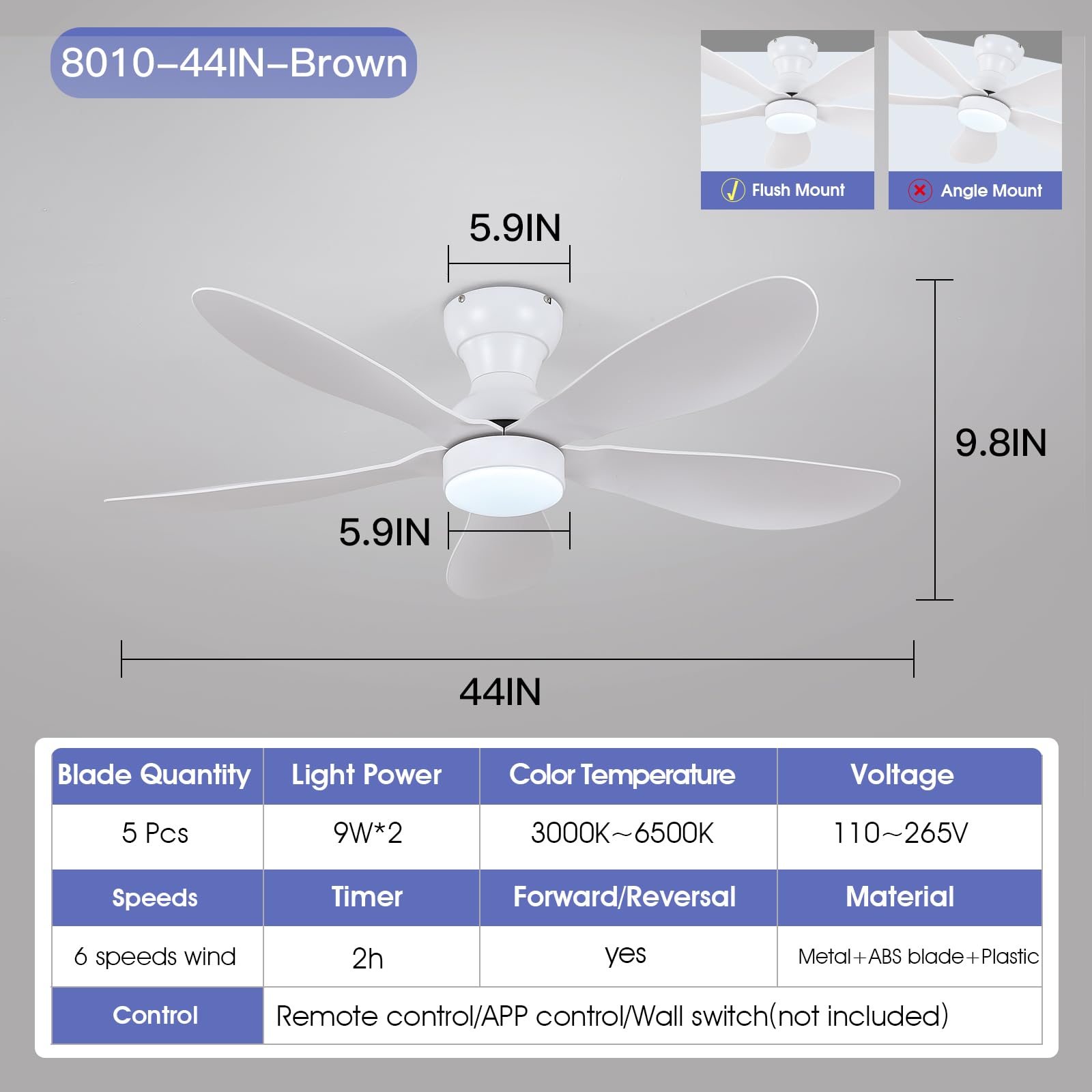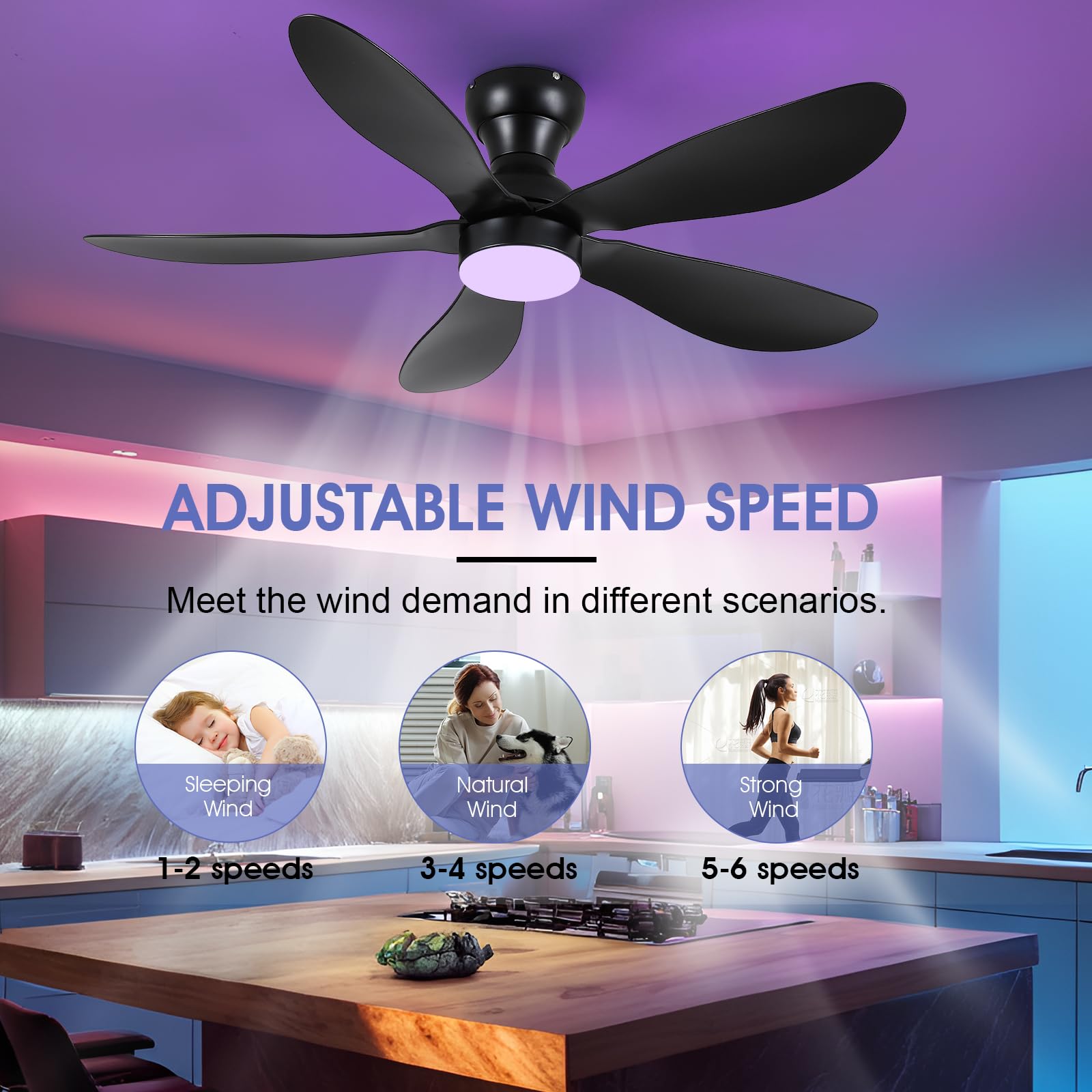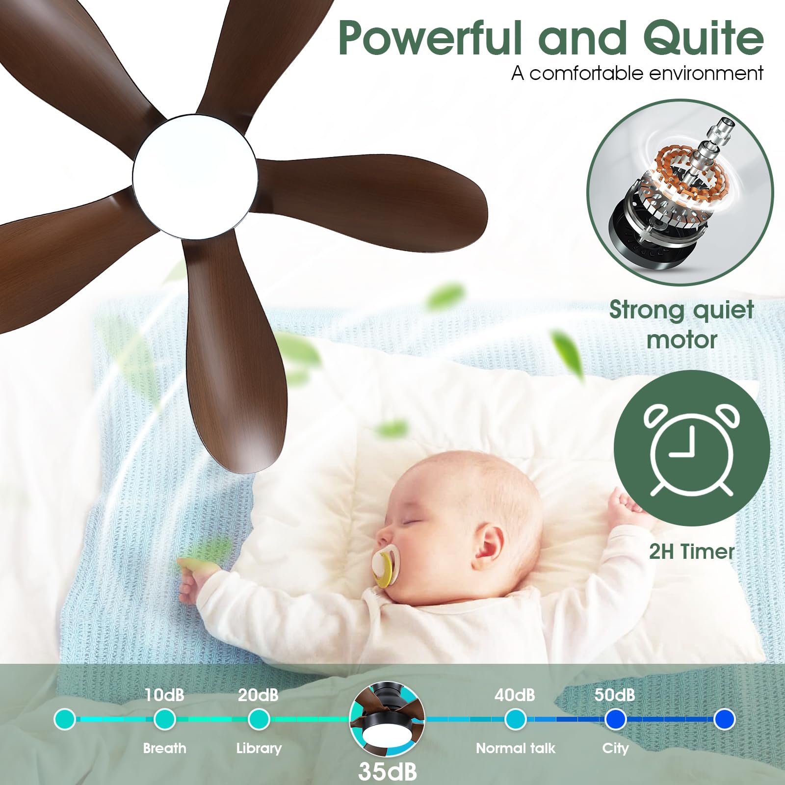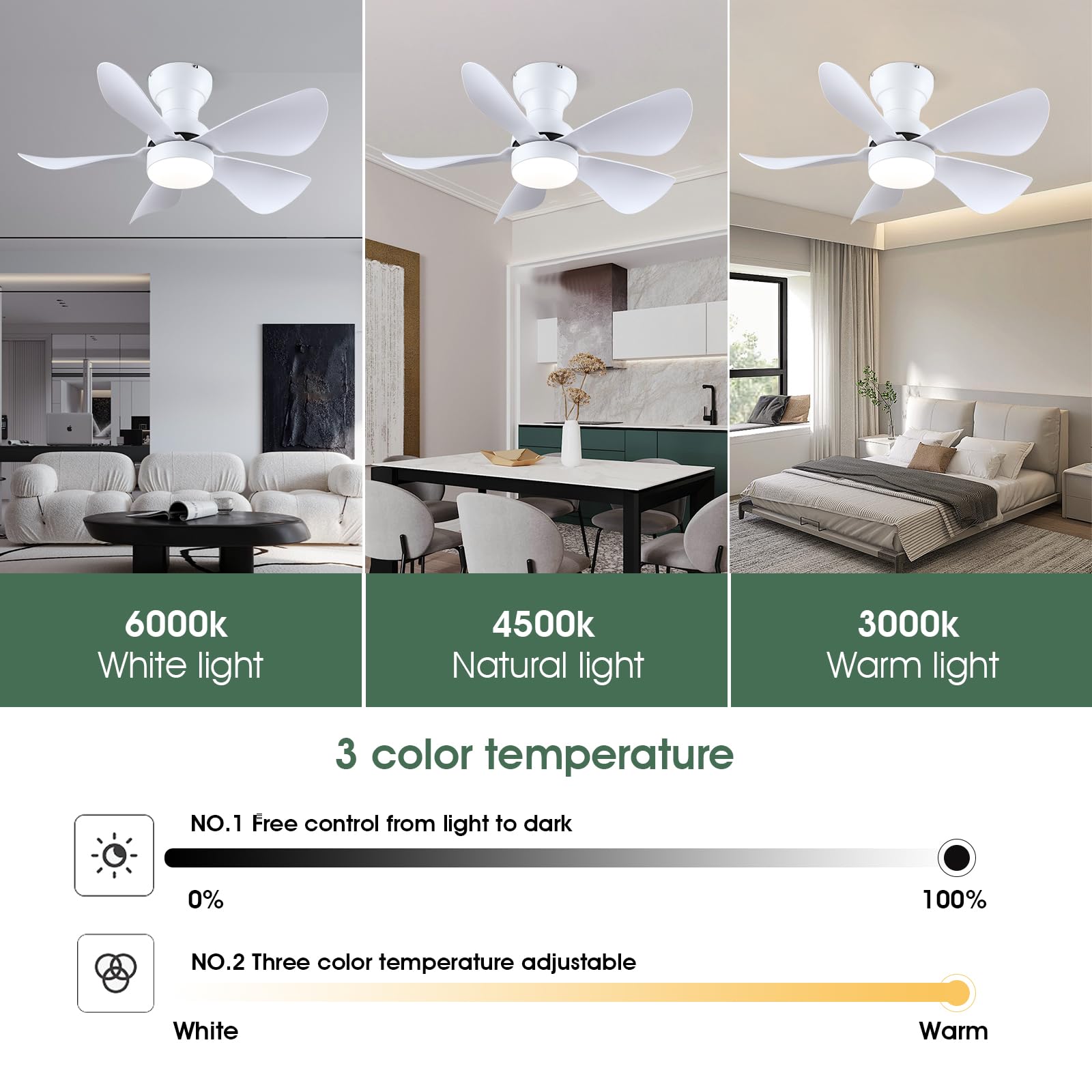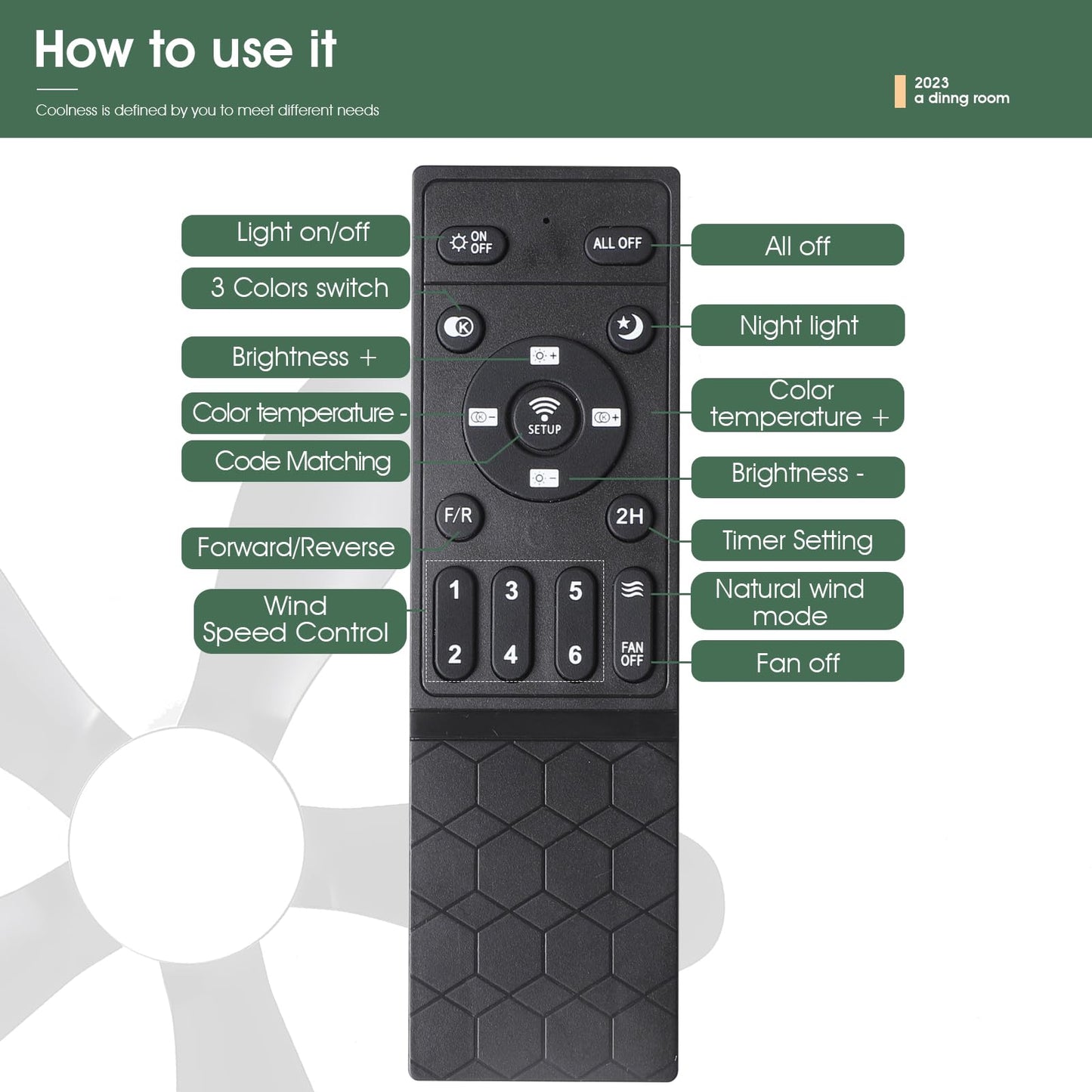- 【Reversible DC Motor】By pressing the F/R key on the remote control, you can switch the wind direction of the ceiling fan from the downdraft in summer to the updraft in winter, thus recovering the heat lost by the ceiling and distributing the heat evenly throughout the room; Compared with traditional AC motors, it is more energy efficient, more silent, and the noise level is less than 30 dB.