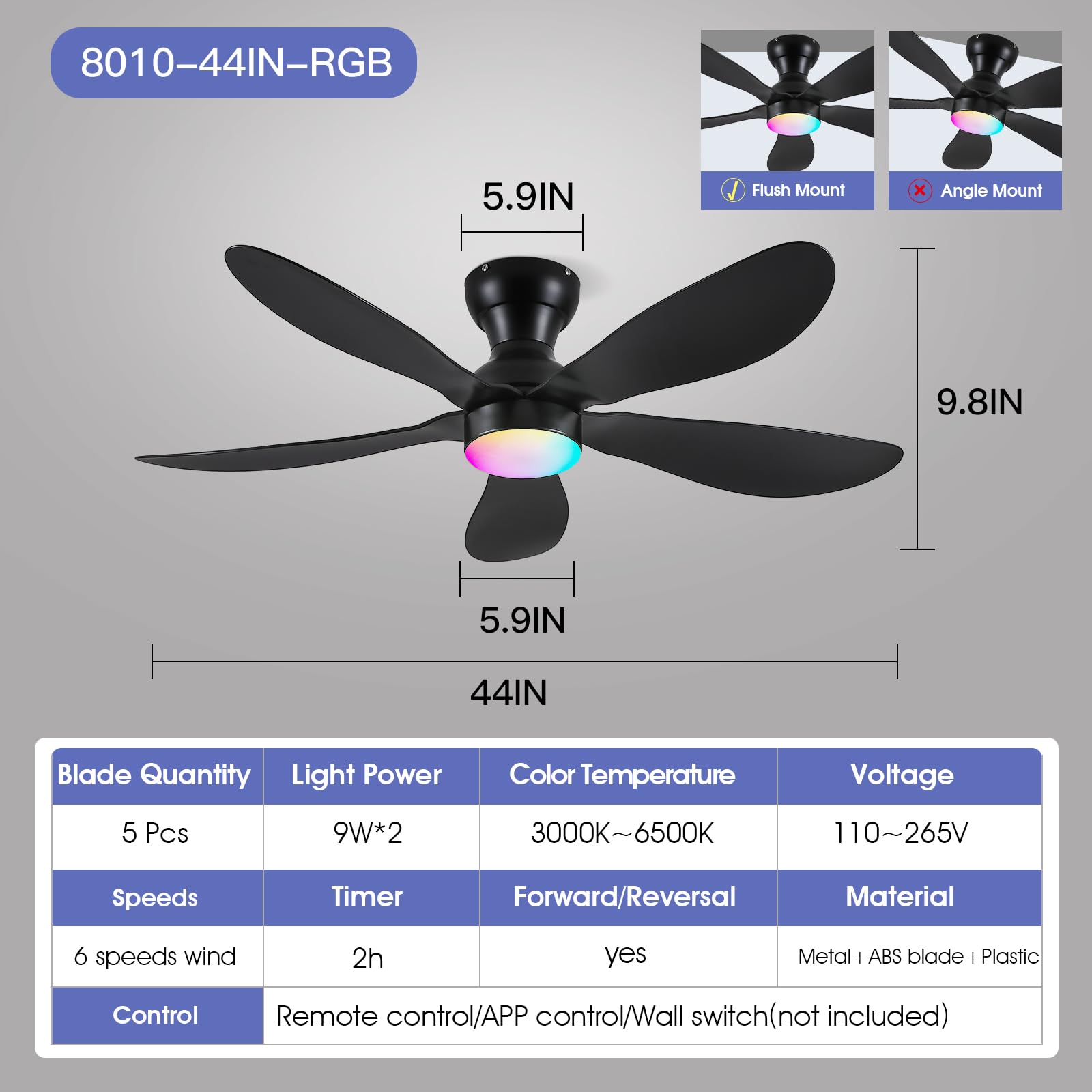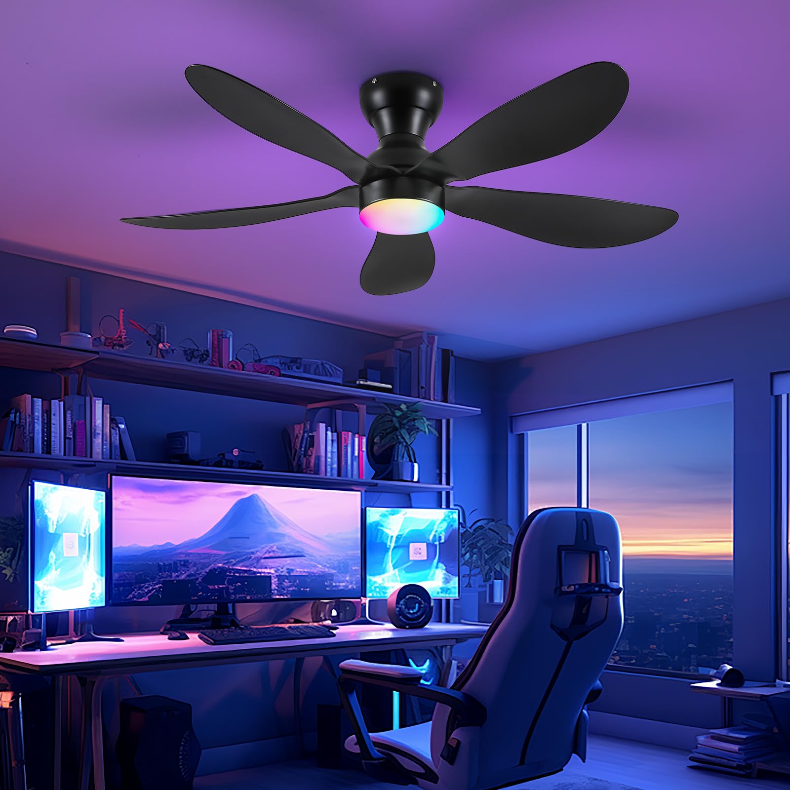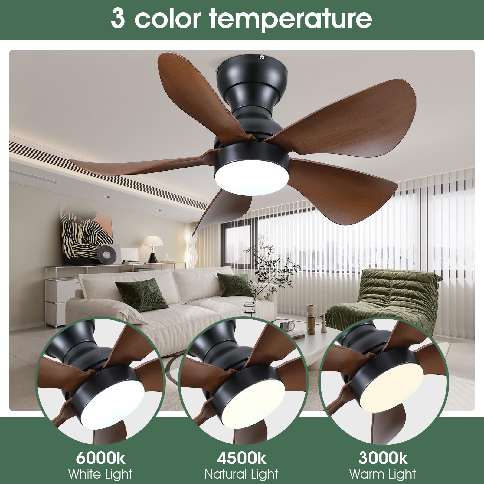 Ceiling Fans with Lights and Remote/APP Control, 30 inch Low Profile Ceiling Fans with 5 Reversible Blades 3 Colors Dimmable 6 Speeds Ceiling Fan for Bedroom Kids Room Dining Room, Black