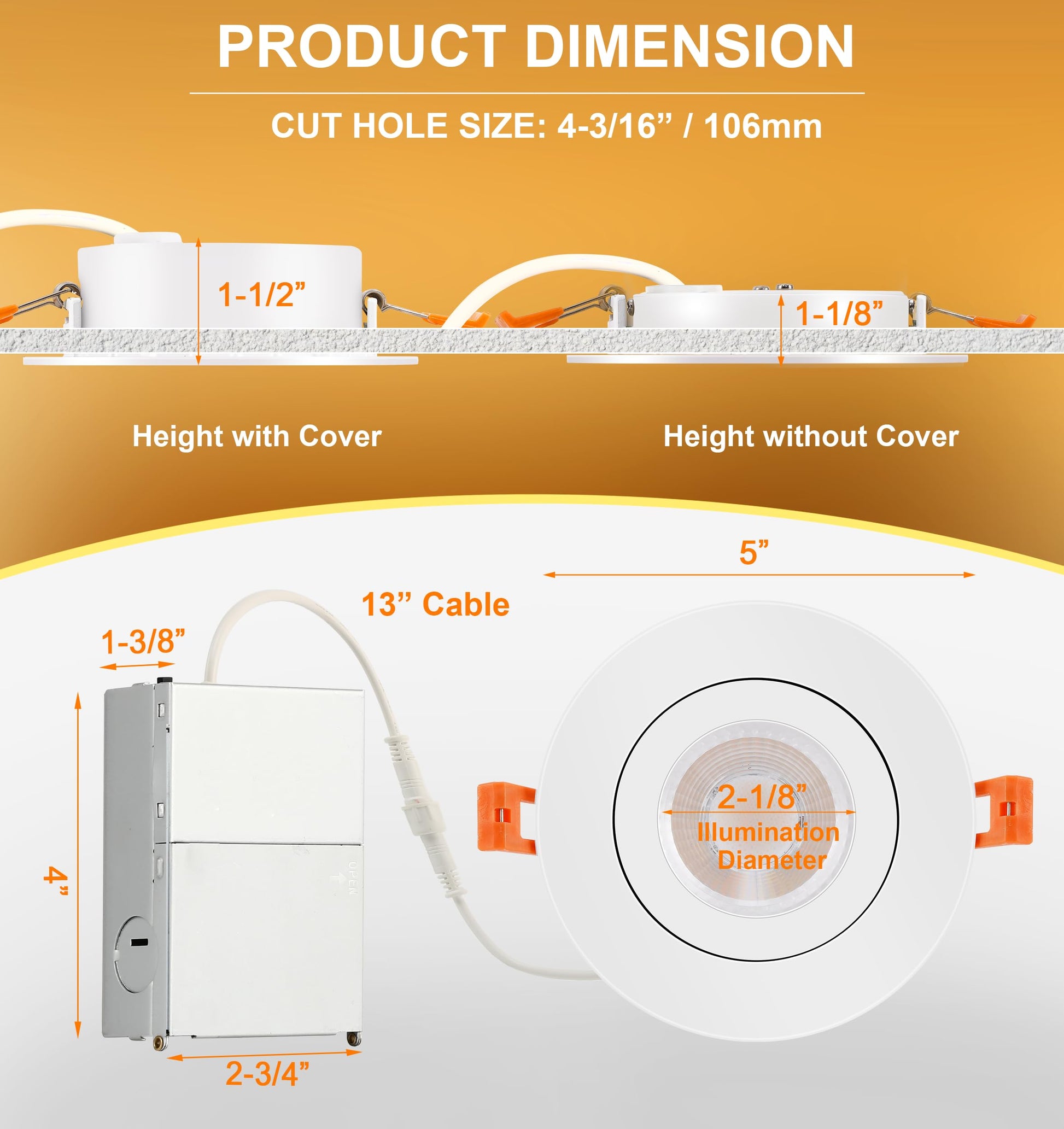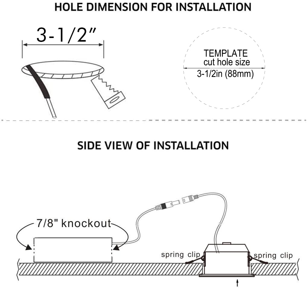 - Easy Installation: Designed for easy retrofit,remodel or new construction installation.No junction boxes or cans required.Recommended cut hole size on the 1:1 template is 4-3/16’’, it also compatible with Remodel or New Construction housing with 4-1/2’’ holes, time saving if there were 4-1/2” holes already.