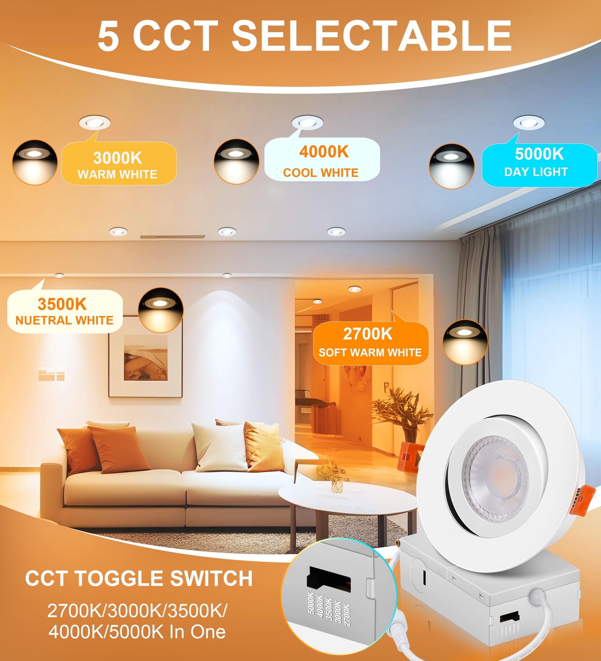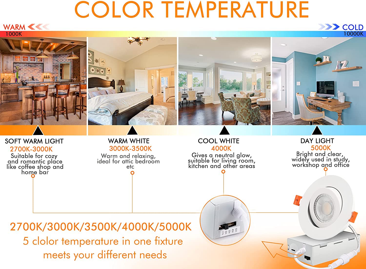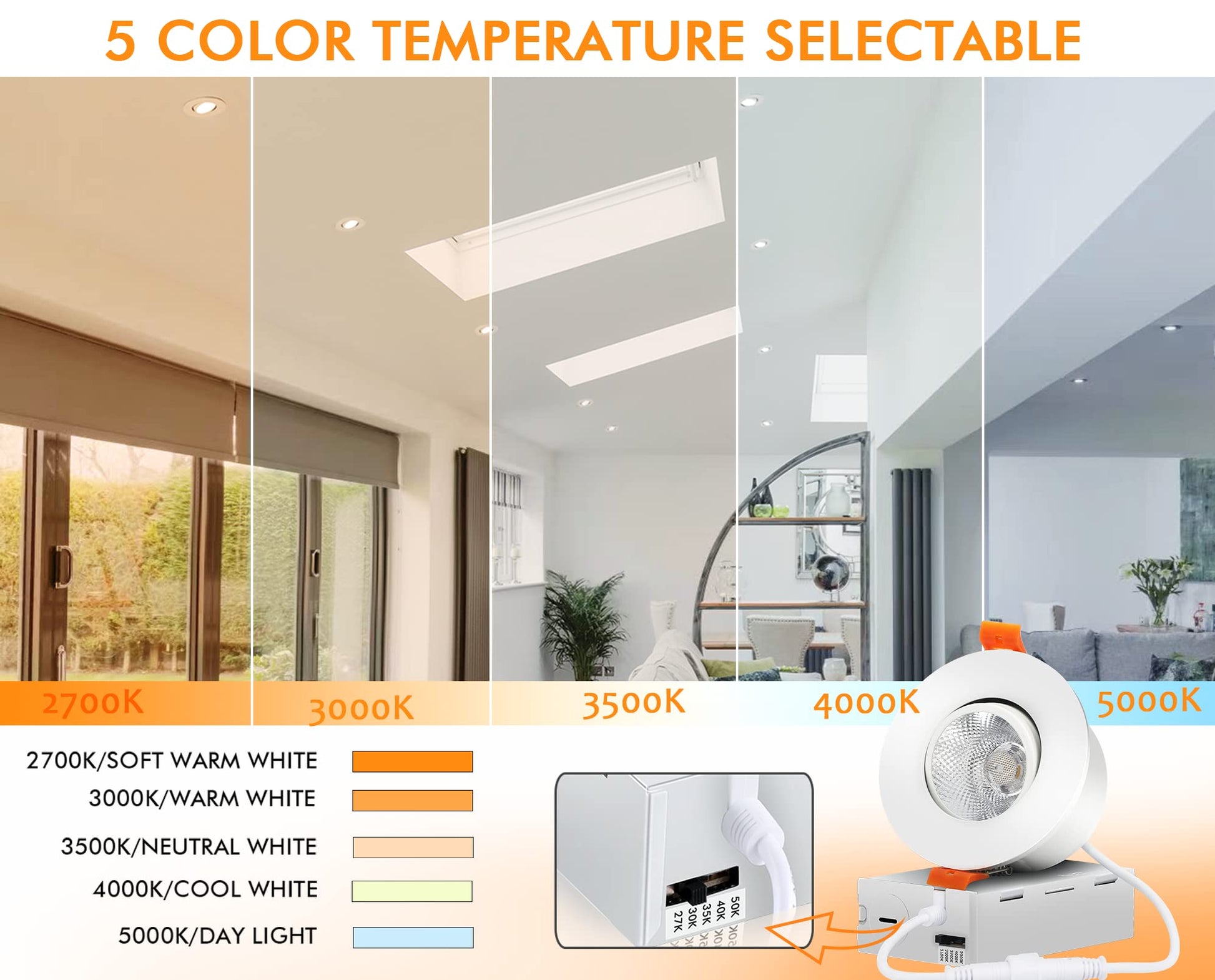 - 5 Color Temperature Selectable: 2700K/3000K/3500K/4000K/5000K in one fixture meets your different needs in hallway, living room, kitchen, bedroom and even walk-in closet etc.Just a click on the side of the box and you will choose the most-desired color that best fit in your house