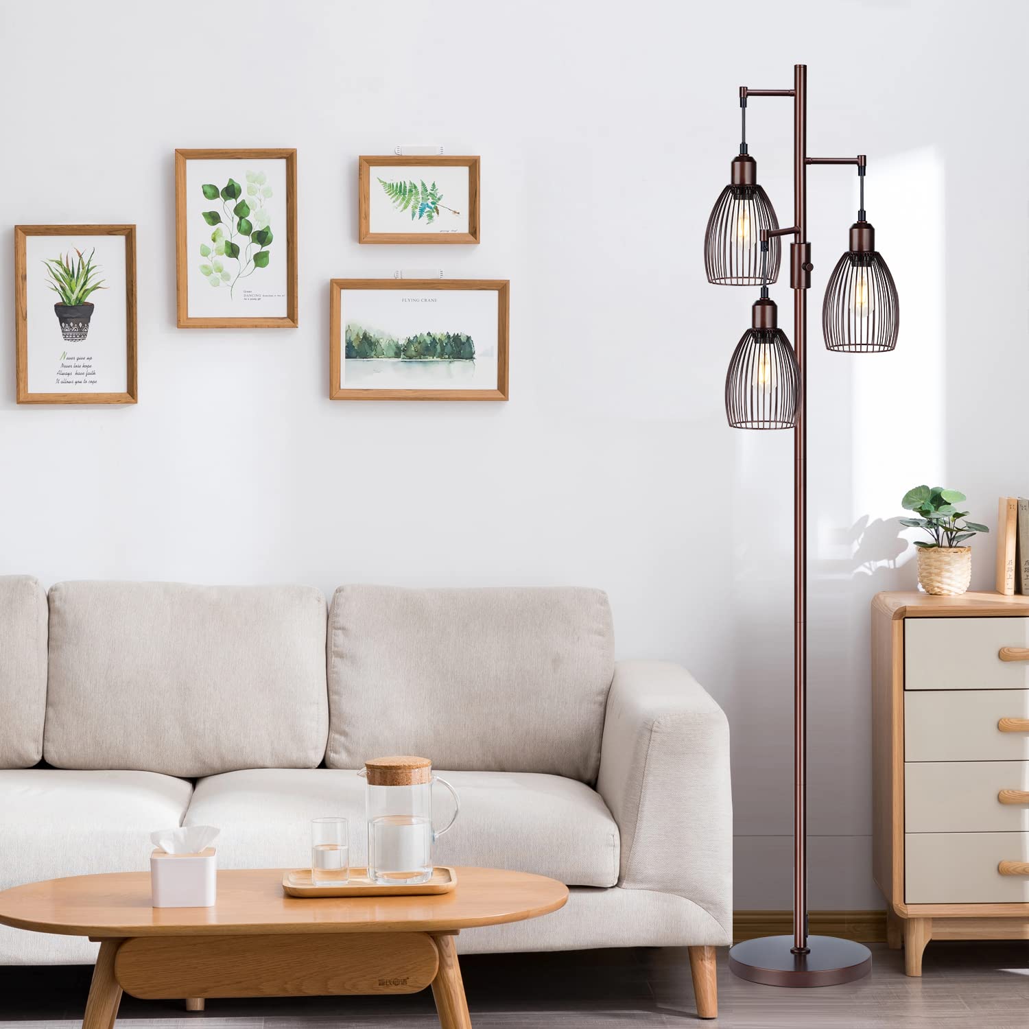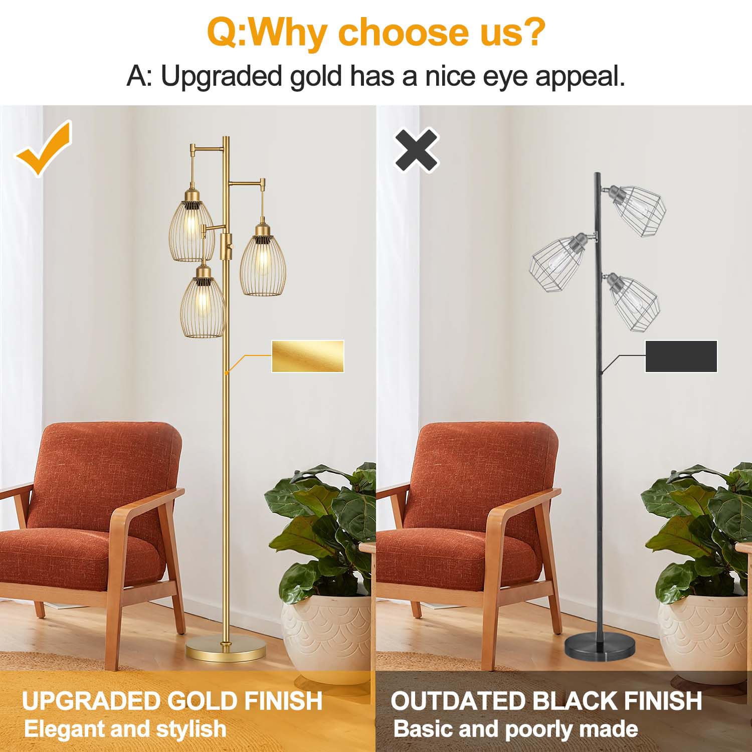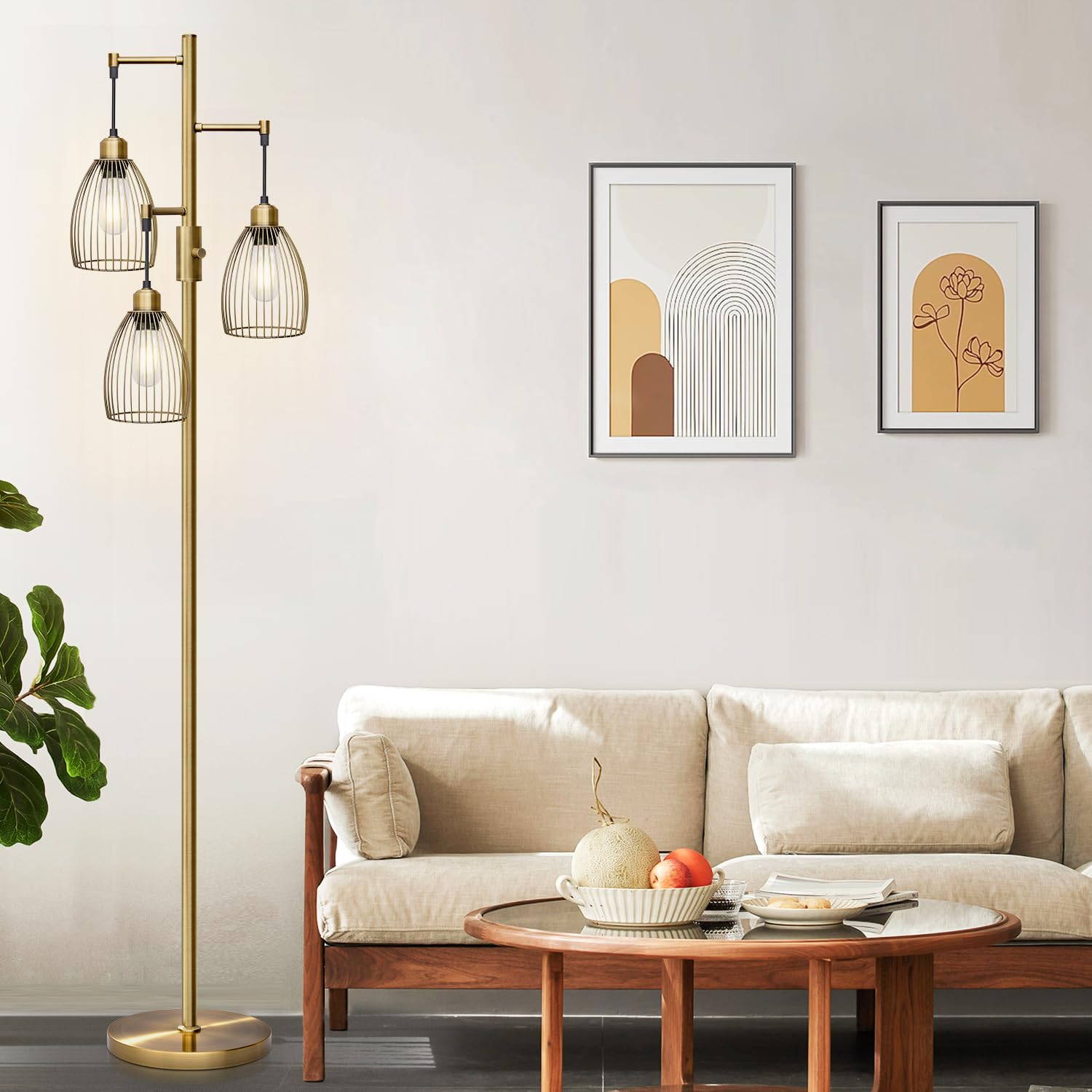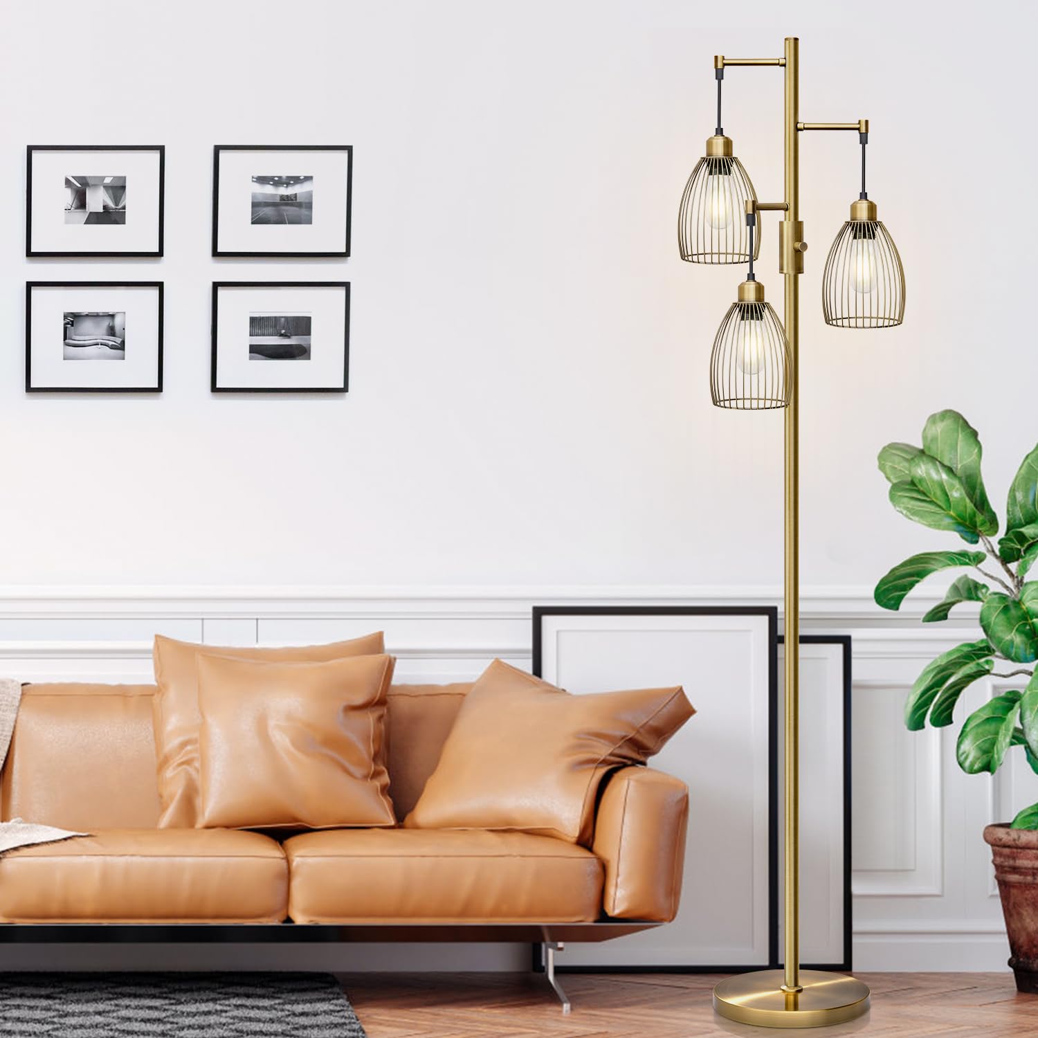 Dimmable Industrial Floor Lamps for Living Room, Gold Tree Standing Tall Lamps with 3 Elegant Teardrop Cage Head & 800 Lumens LED Bulbs for Bedroom Office