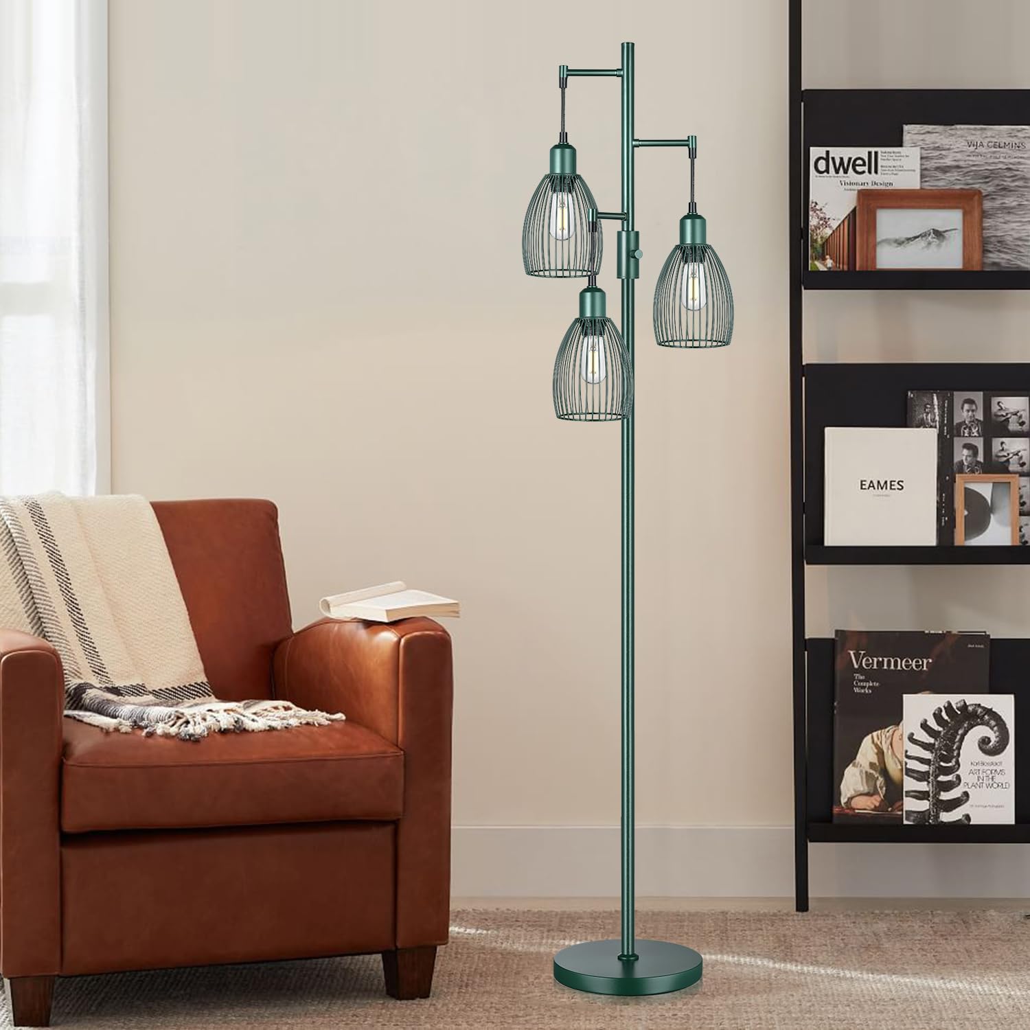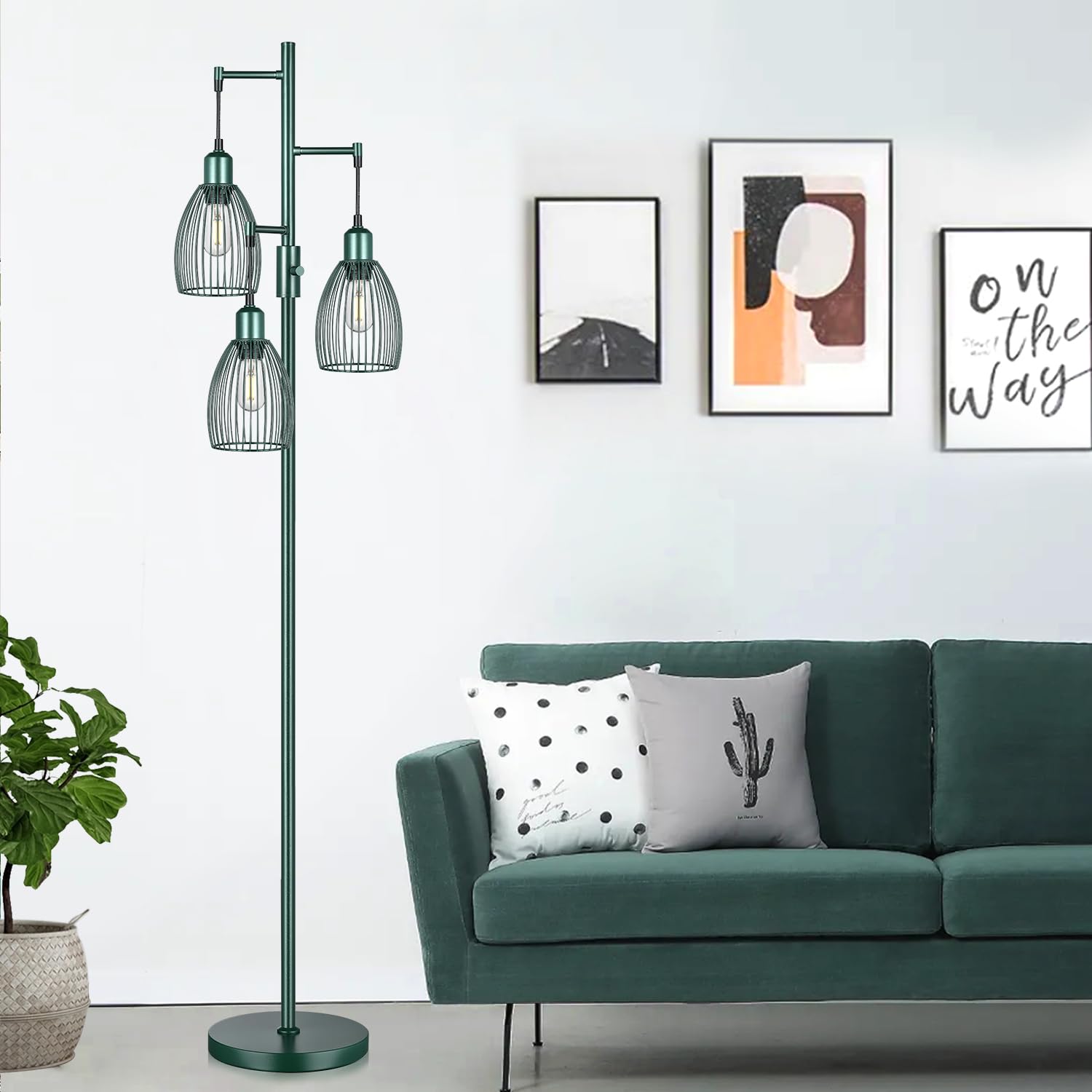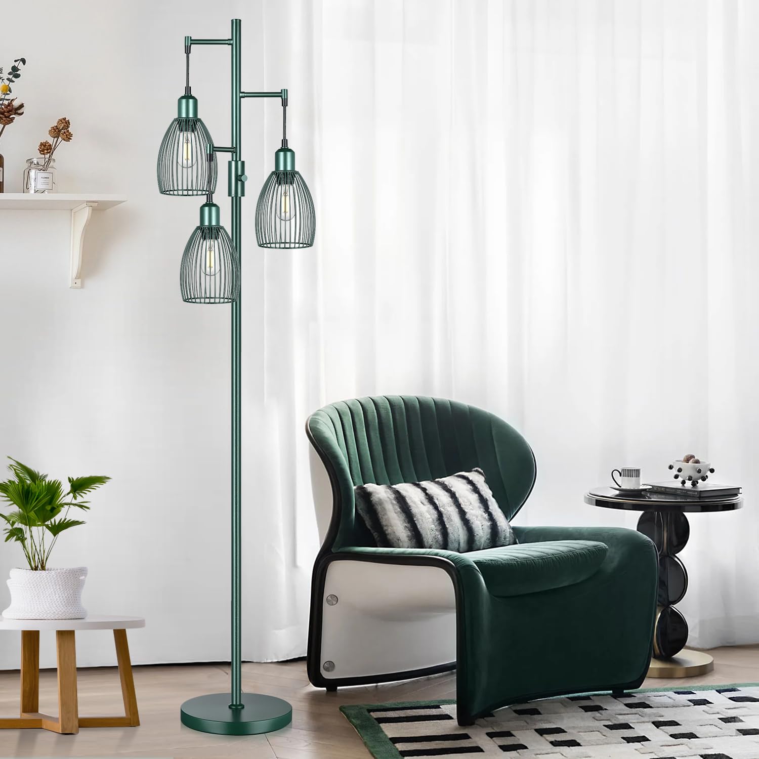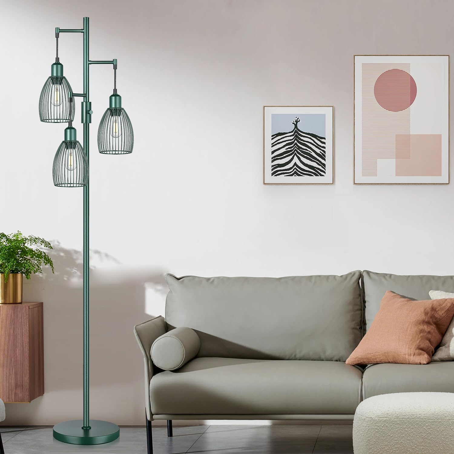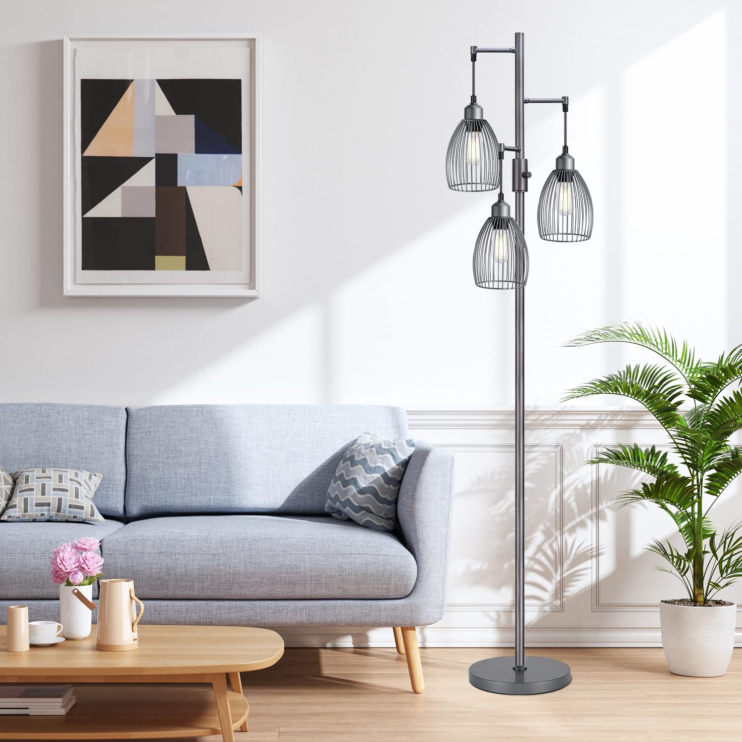 Dimmable Industrial Floor Lamps for Living Room, Gold Tree Standing Tall Lamps with 3 Elegant Teardrop Cage Head & 800 Lumens LED Bulbs for Bedroom Office