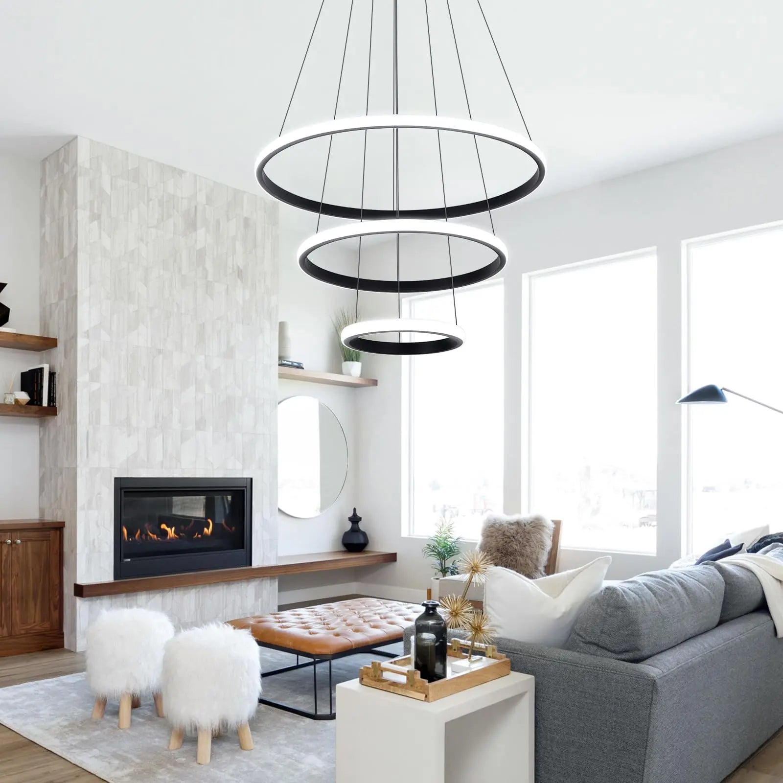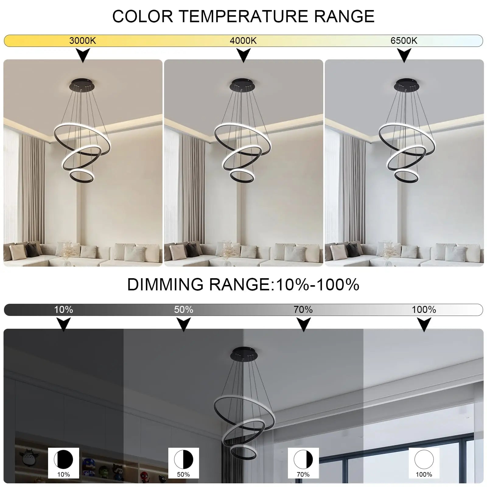 Modern Circular LED Chandelier: The 3-rings LED chandelier is made of premium aluminum, metal, and acrylic.ring diameter: 23.6"+15.7"+7.8", heigh: max 33.5 inch adjustable Ceiling Hanging Light and strip to get different shape.