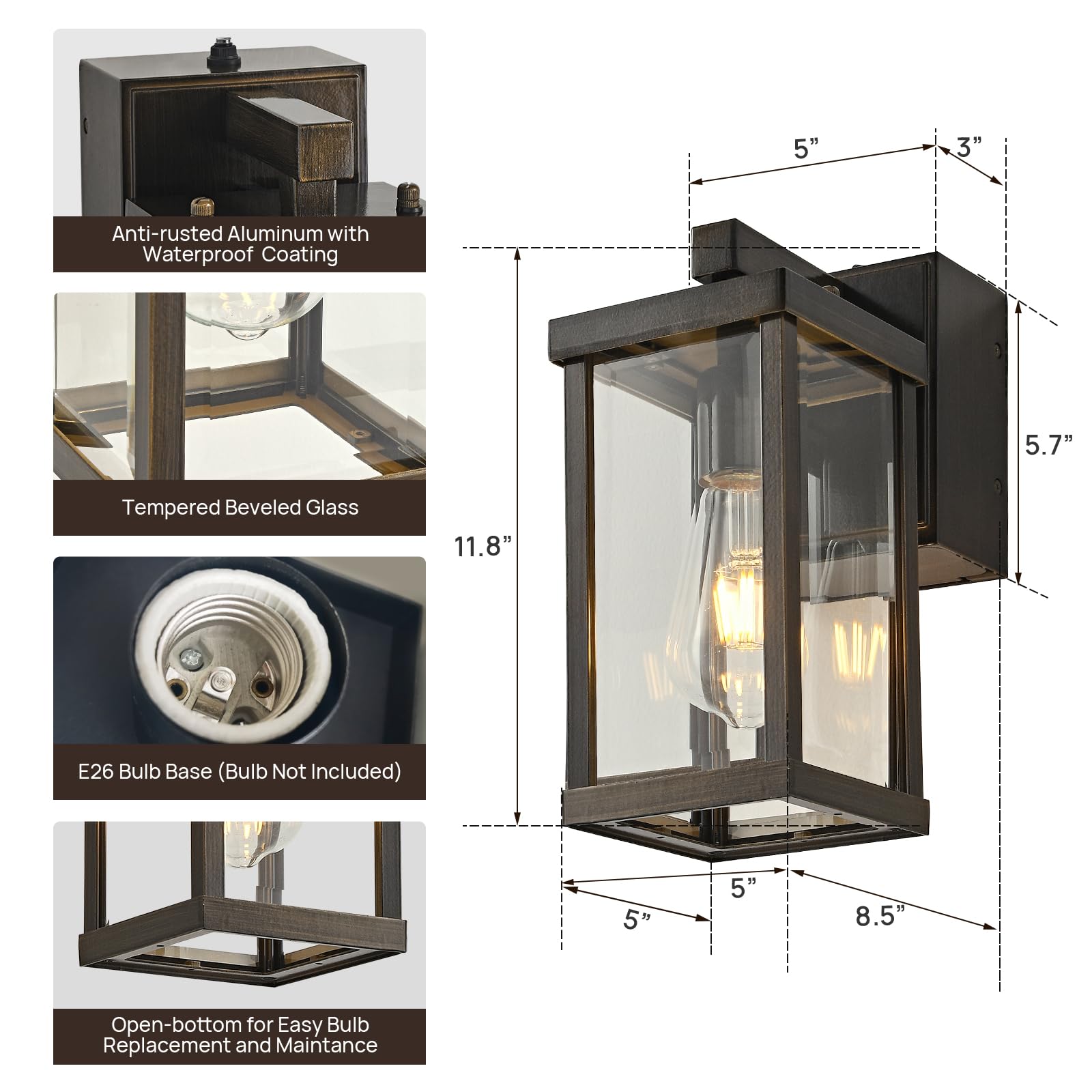 - Moderate Size: The size of our dusk to dawn outdoor lighting is 5.0" x 8.5" x 11.8"(L x W x H) and wall plate is 4.8" x 3.0" x 5.7"(L x W x H).Matched perfect for porch, garage, doorway, backyard, patio, and entry. Please refer to the dimension carefully before purchasing.
