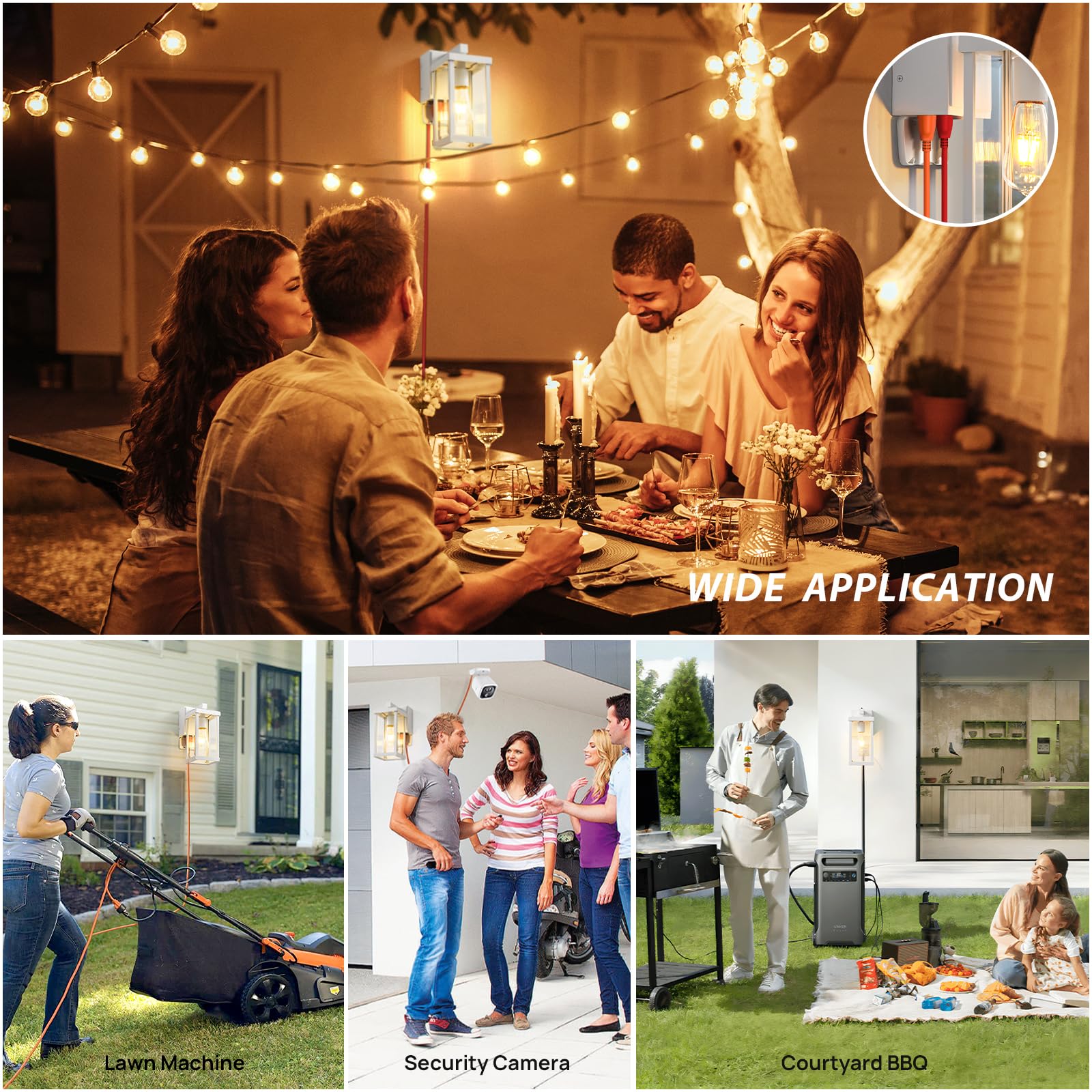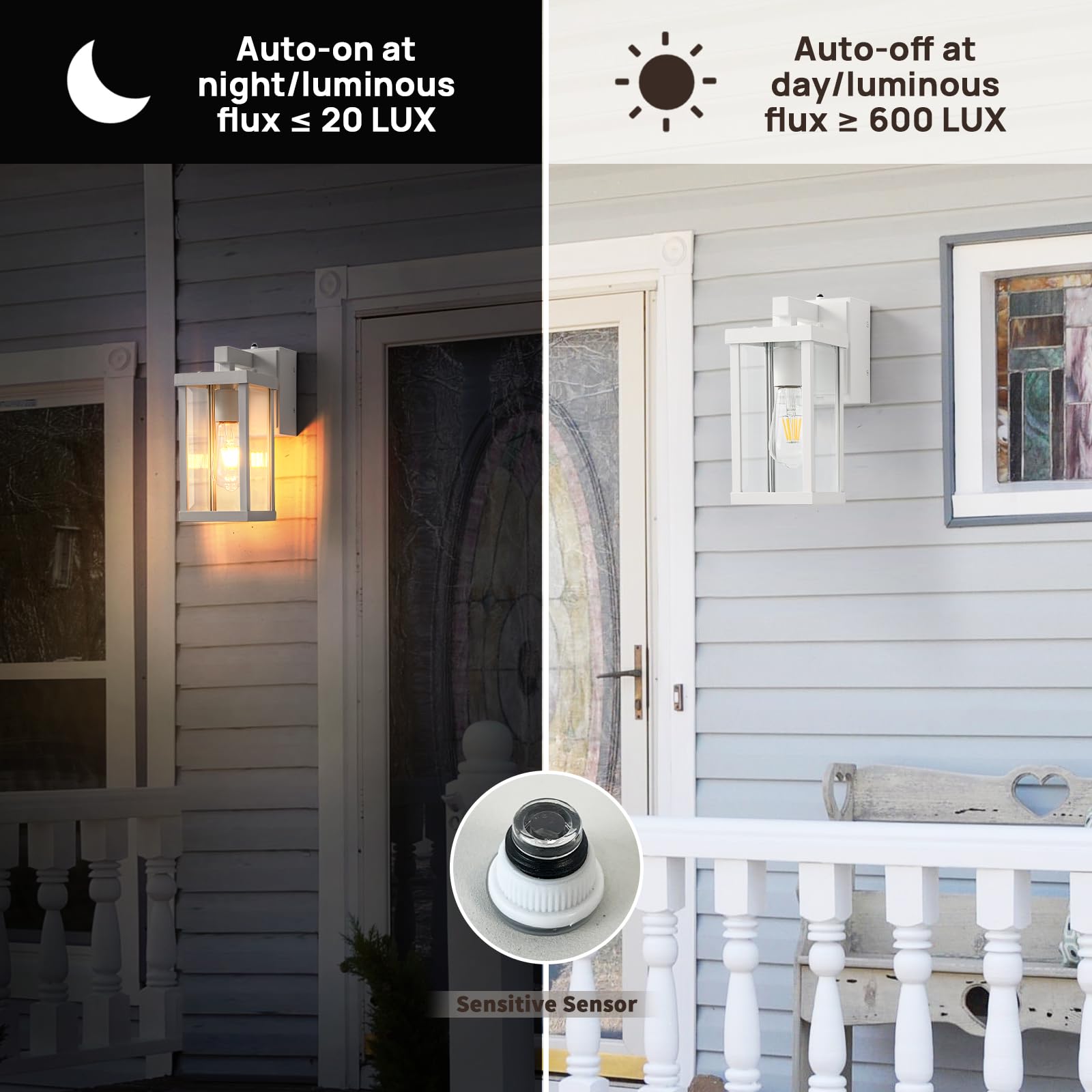 - Dusk to Dawn Sensor Function: Our porch lights outdoor feature advanced dusk-to-dawn sensing technology that could sensitively detects the brightness of your surroundings, automatically turn on at dusk (luminous flux ≤ 90 lux ) and turn off at dawn (luminous fluxes ≥ 600 lux ). These outdoor lights with outlet not only save your energy, but also eliminate the troublesome step of switching your outdoor wall lights exterior on and off every day, which can greatly simplify your daily life.